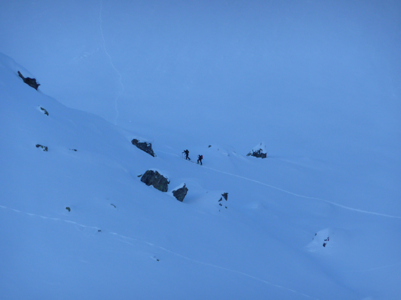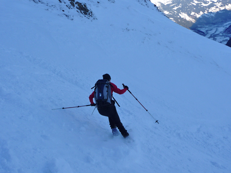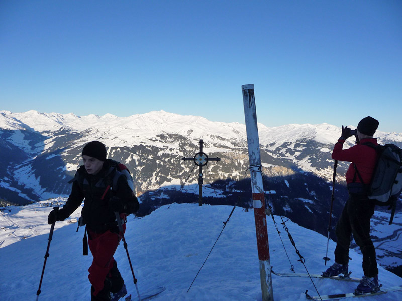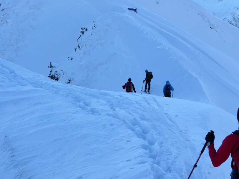 Dort den Hang nach rechts queren und hinauf auf die Popbergschneid. Hier Skidepot.