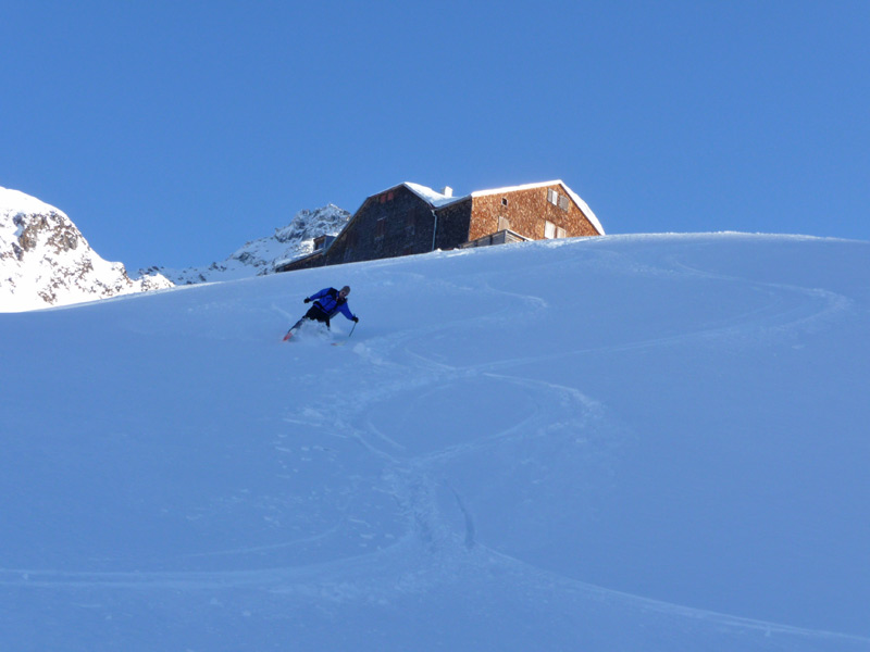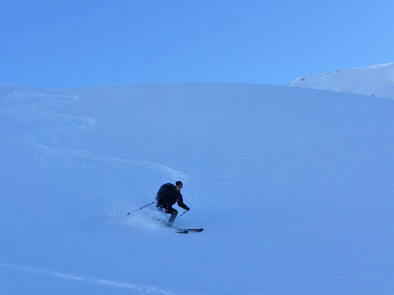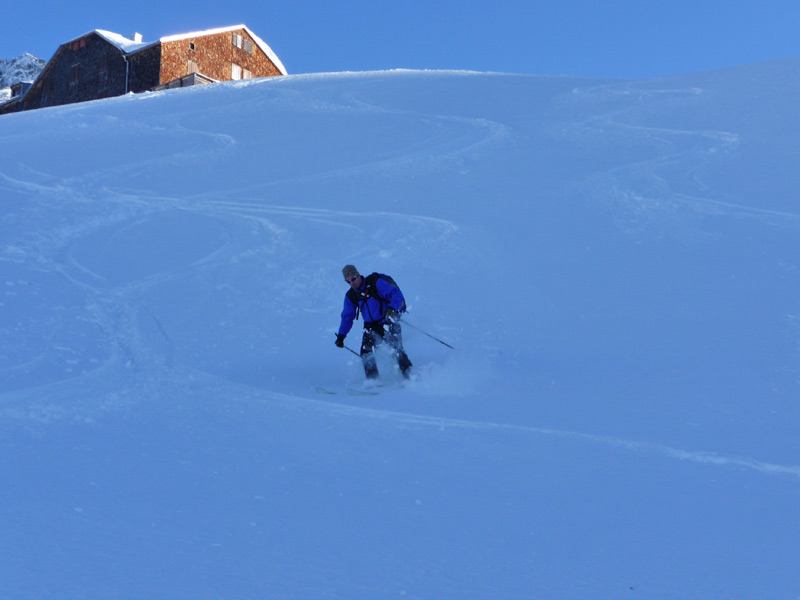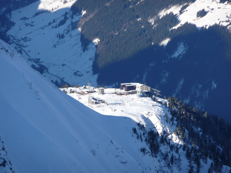 Abfahrt entlang der Aufstiegsspur oder direkt hinunter bis zur Edelhütte. Dort vorbei bis hinunter zum Fellenbergkar. Dann muß entlang des Sommerwegs wieder ca. 15 min. aufgestiegen werden um zurück zur Bergstation der Ahornbahn zu gelangen. (alternativ und bei genug Schnee könnte auch durch das Fellenbergkar zur Alpenrose abgefahren werden)
