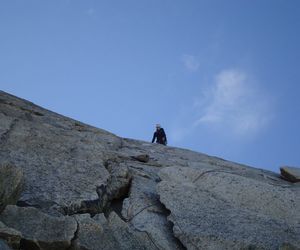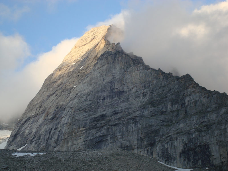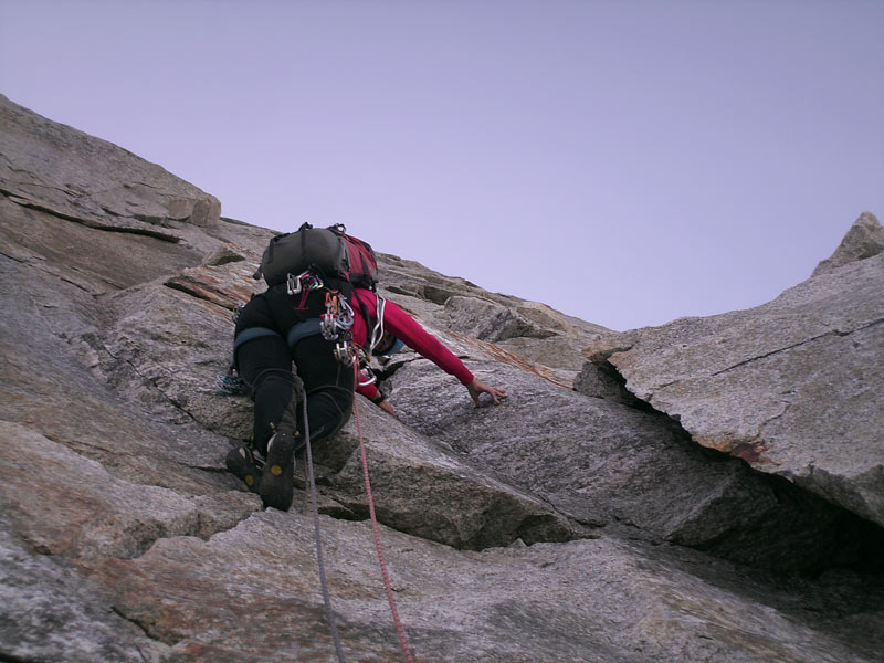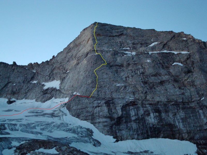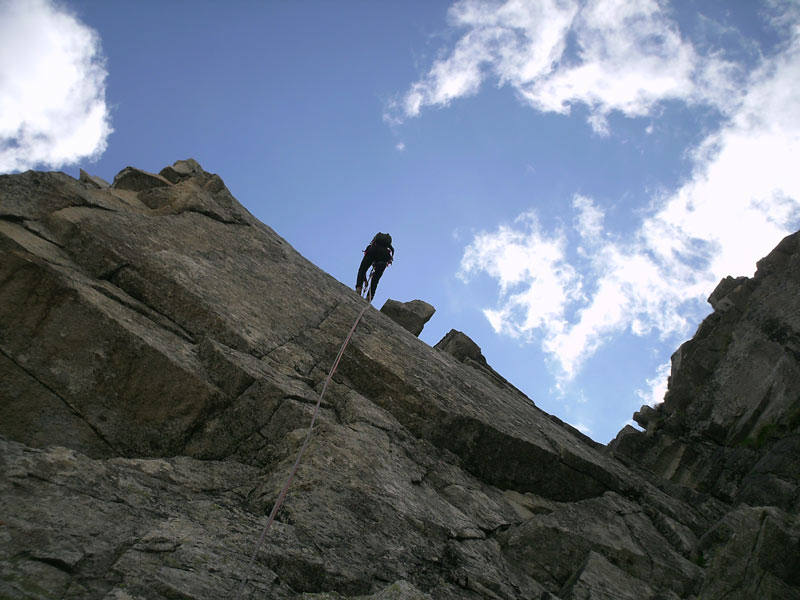 Im markanten Risssystem (V-) gerade hinauf zu Stand. Leicht links im IV Grad auf den Pfeiler zu, sodann leicht rechtshaltend hinauf zum nächsten Stand. Über geniale, mit Rissen durchzogenen Reibungsplatten empor und nach rechts auf ein kleines Band, an dessen Ende bei auffälliger Rinne Stand. In 2 Seillängen durch die Rinne auf das große Schuttband. Oberhalb, etwas versteckt, Stand. 20m gerade hinauf dann Querung nach Rechts. Stand oberhalb des rötlichen Pfeilers. In 2 Sl links am mächtigen Überhang vorbei (V-) und auf Höhe der Dachkante Querung nach Rechts zu Stand. Weiter auf der sich zurücklegenden Kante (IV) zum Schluss über Schutt unschwierig zum Gipfel. 4-5h