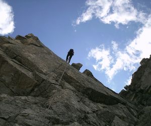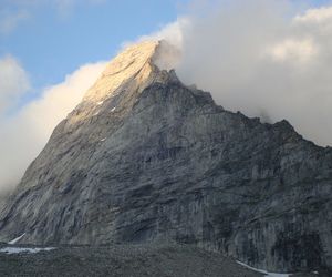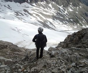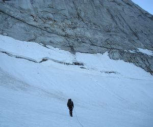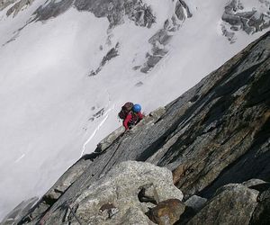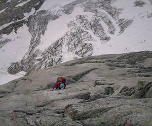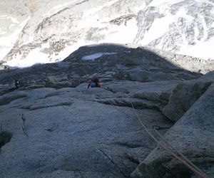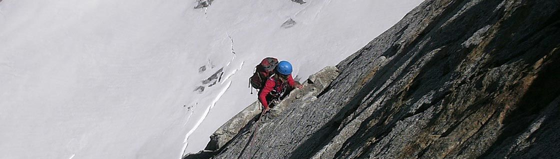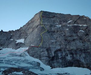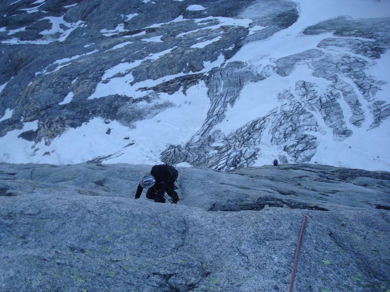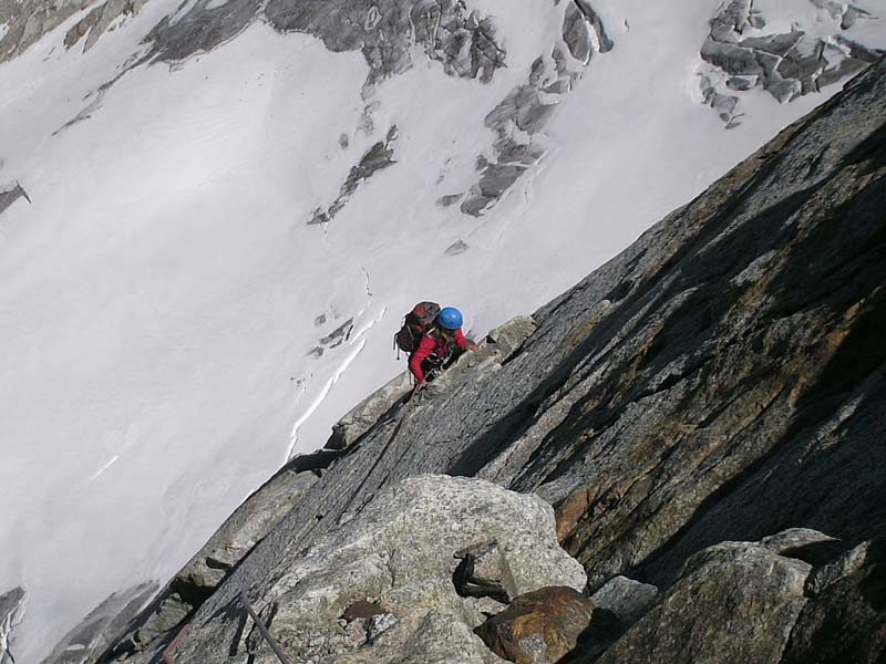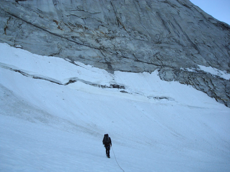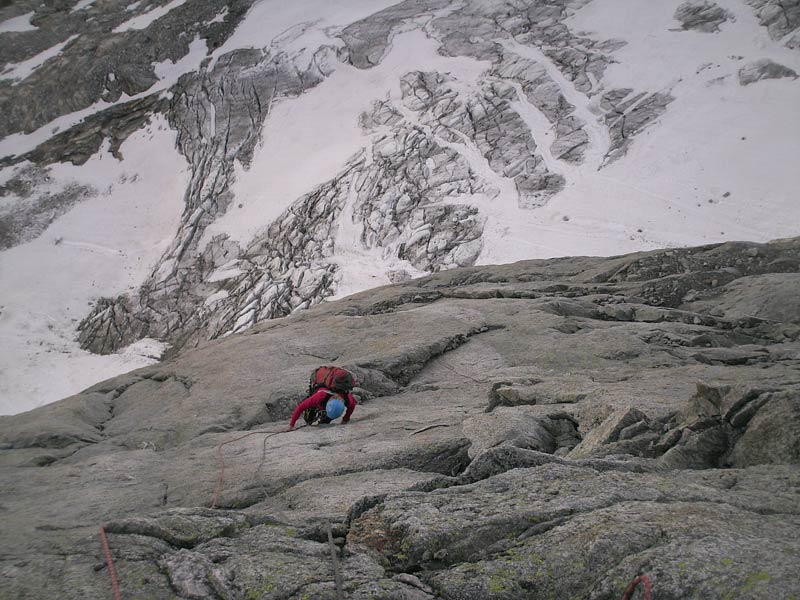 Weiter auf dem Normalweg Richtung Olperer. Am Gletscherbeginn (ca.2800) nach rechts über den Olpererferner an das linke Ende des markanten Bandes in der Fußstein Nordwand. An geeigneter Stelle über die Randspalte (40°, im Hochsommer heikel, Pickel und Steigeisen ratsam) und auf das Band, über dieses leicht nach rechts absteigen und um die Kante herum. Einstieg bei markantem Überhang (2h)