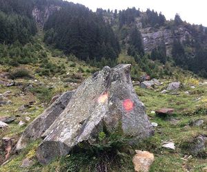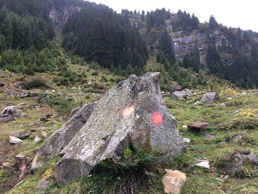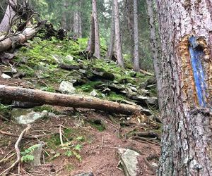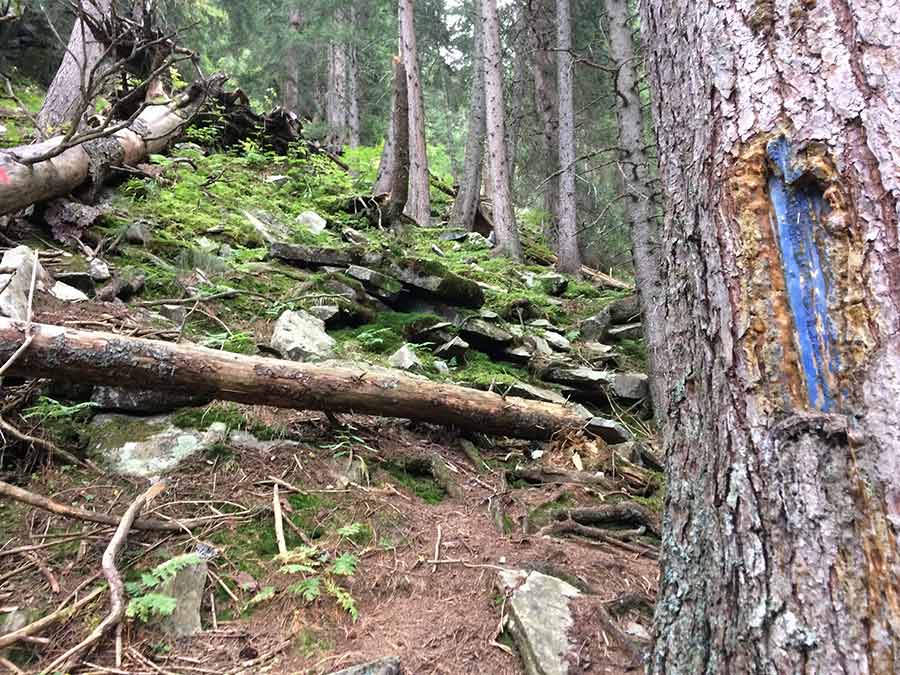 Ab hier relativ gut mit roten und blauen Punkten markiert durch die Klam bis man am Ende nach rechts in den Wald abzweigt.