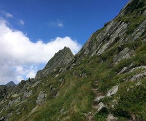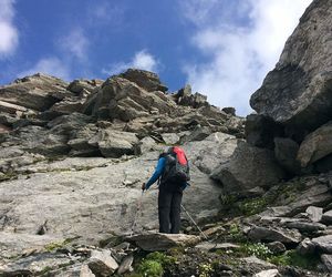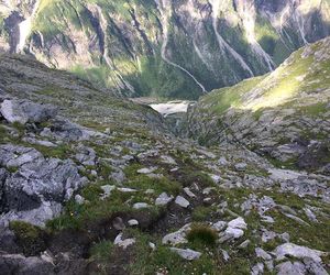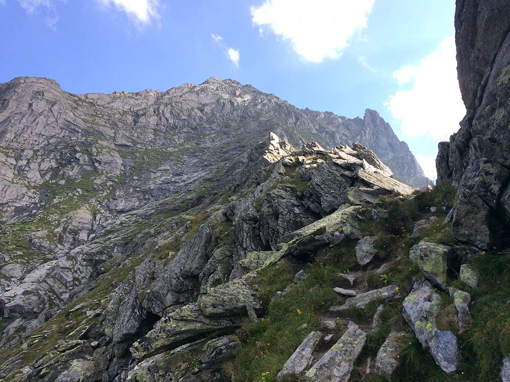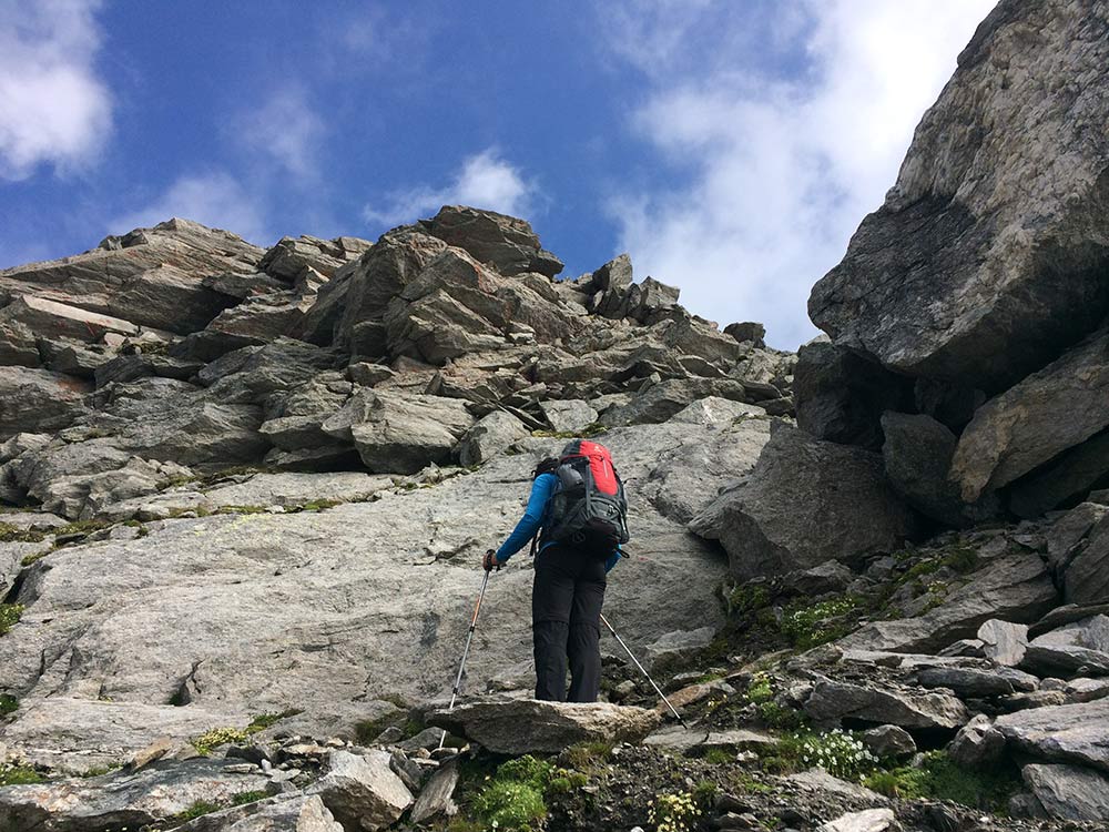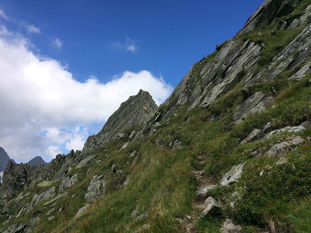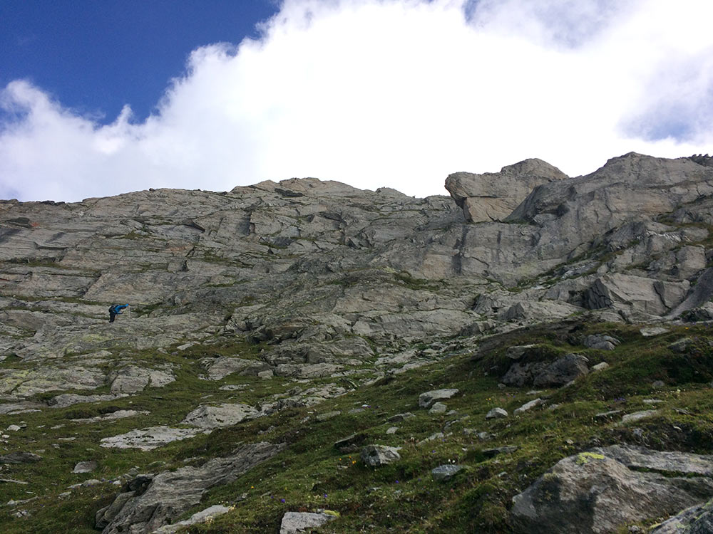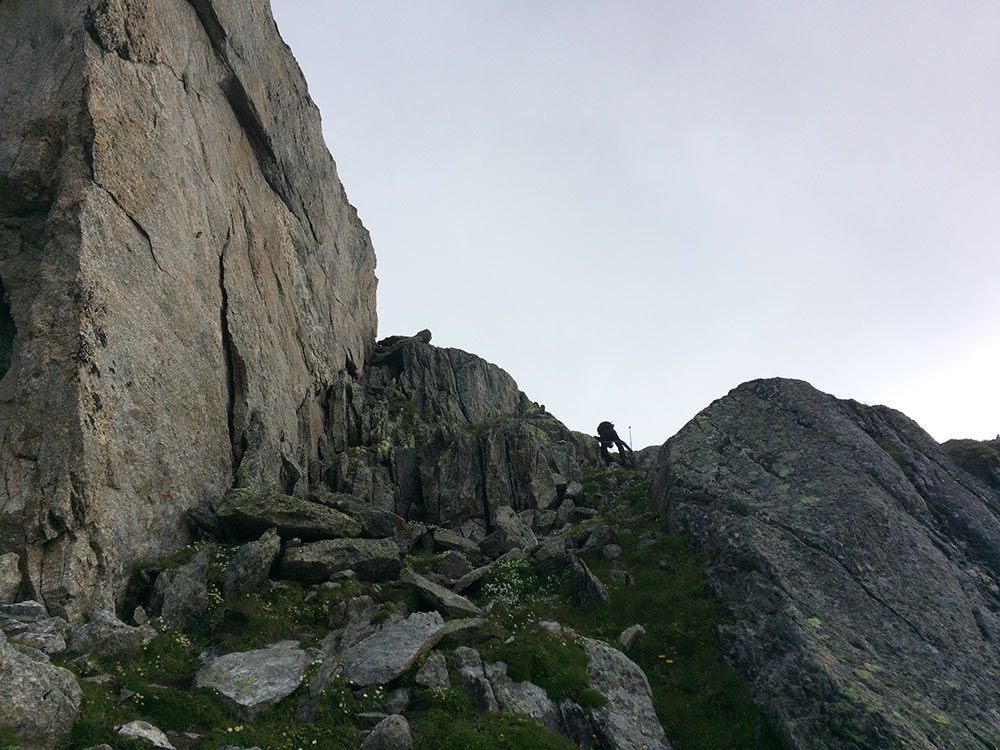 Der Weg führt meist direkt am Grat entlang bis unter die Gipfelwand, man sollte immer auf dem Weg beleiben da man diesen schnell aus den Augen verlieren kann und das extrem steile Gelände meist aus einer Mischung von Erde,Schotter und losen Felsbrocken besteht.