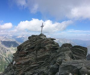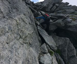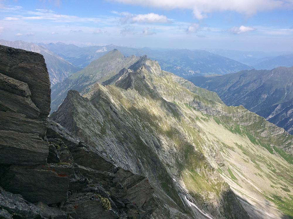 Die Schlüsselstelle befindet sich direkt unter dem Gipfelkreuz (I+)