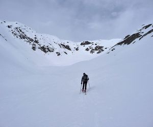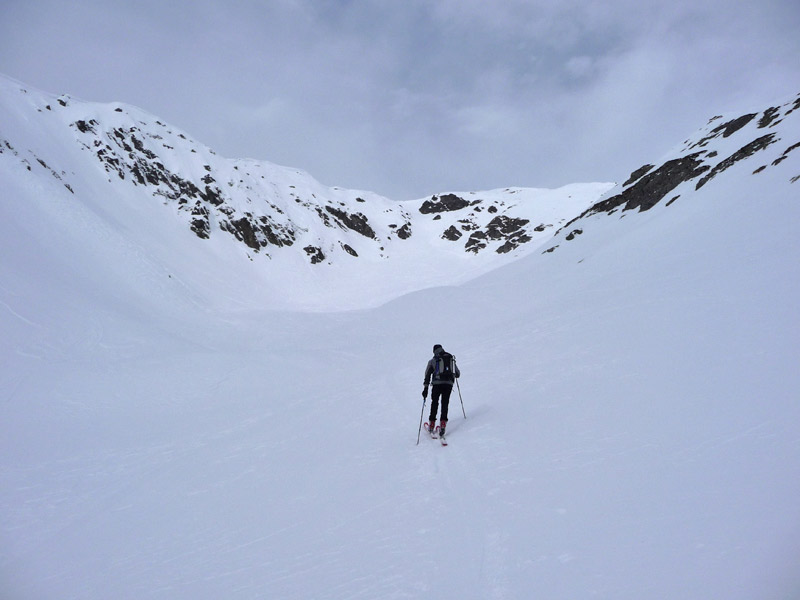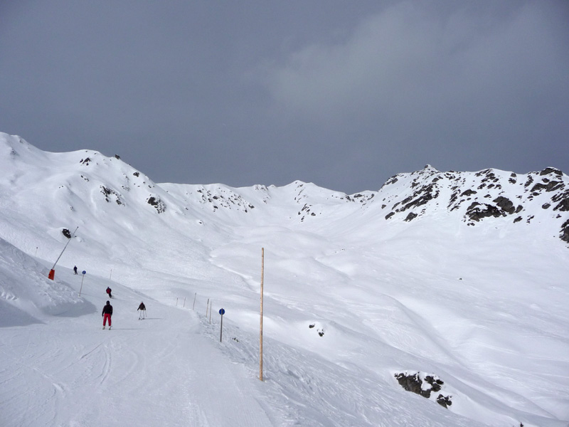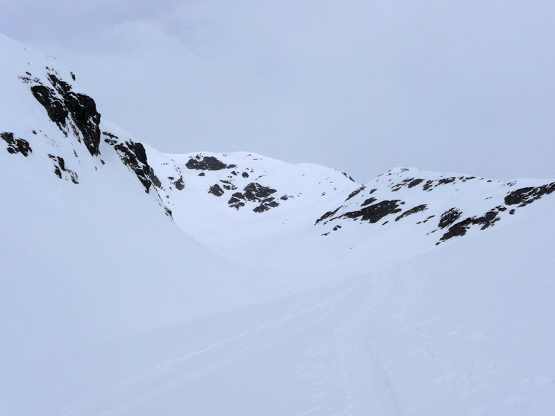 Hier nach rechts abbiegen in den großen Kessel und das Schigebiet verlassen. Am Ende des Kessels können 2 Varianten aufgestiegen werden.