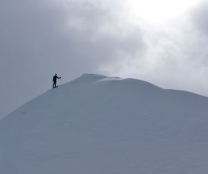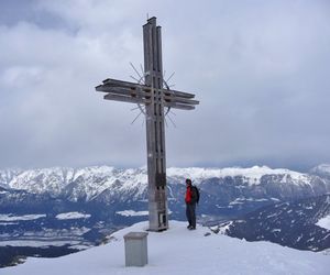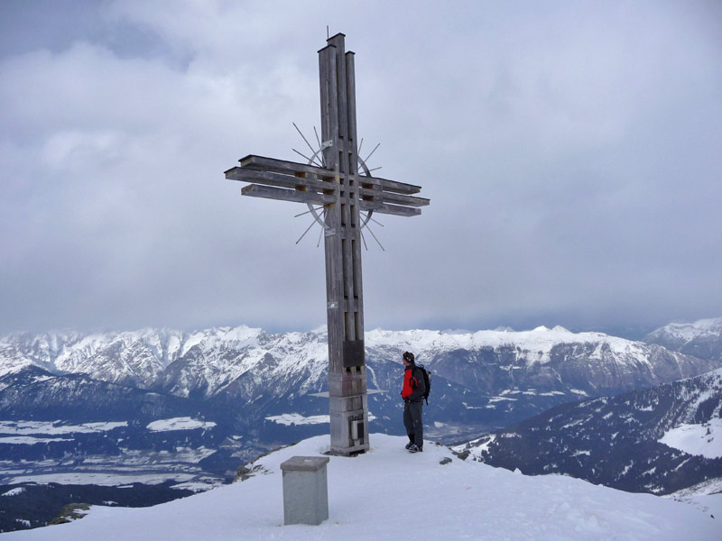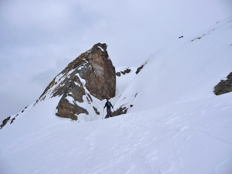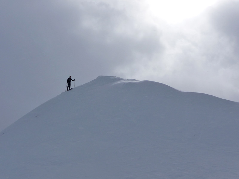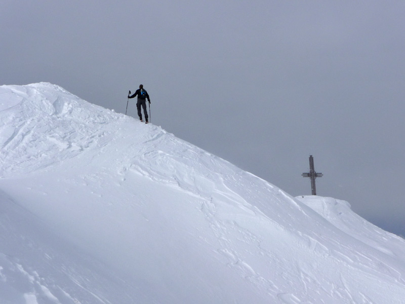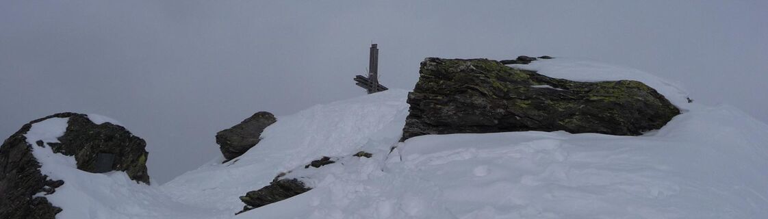 Variante2: Lohnender! Rechts über einen steilen Hang aufsteigen und in einen weiteren Kessel, diesen auf der rechten Seite durchqueren, am Ende angekommen wieder rechts den steilen Hang aufsteigen und auf dem Gratrücken bis auf den Hauptgrat aufsteigen, hier treffen Variante 1 und Variante 2 wieder zusammen. Wenige Meter auf dem Grat bis zum markanten Felsen (Obeliskenform), dort vorbei und nach einem kurzen Steilstück aus der Grube wieder auf den Grat in wenigen Metern auf den Vorgipfel. Nun folgt noch eine kurze Abfahrt und man ist direkt vor dem Gipfel mit seinem riesigen Kreuz.
