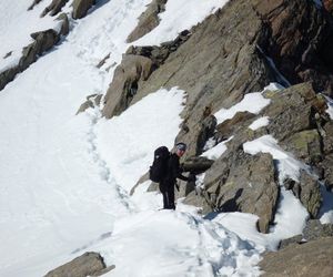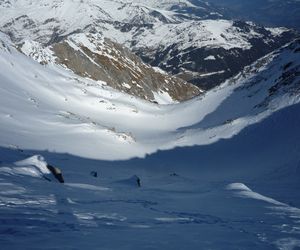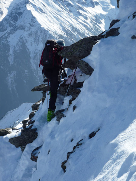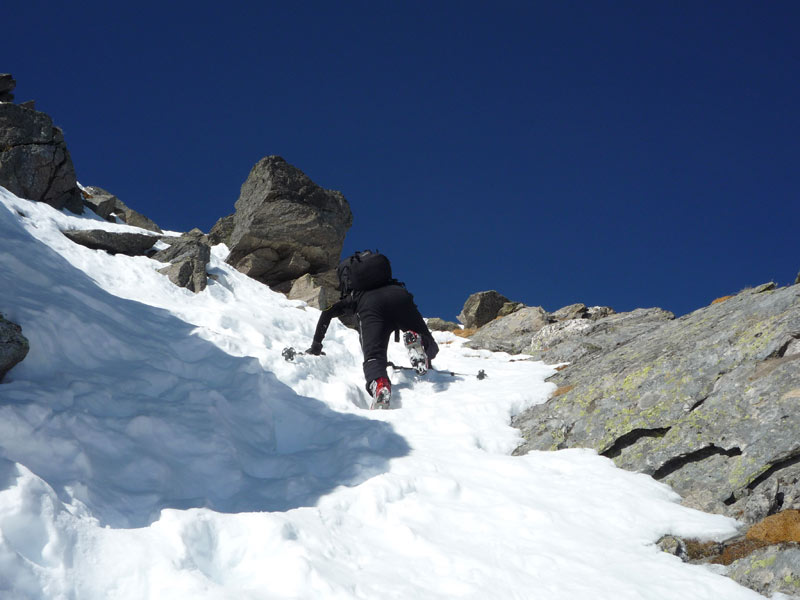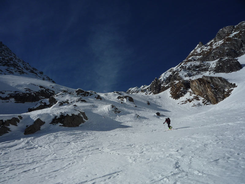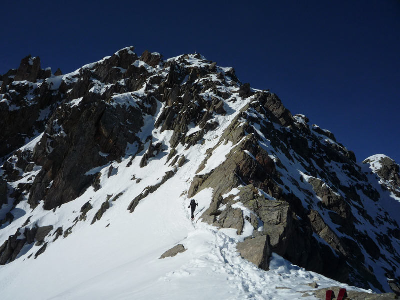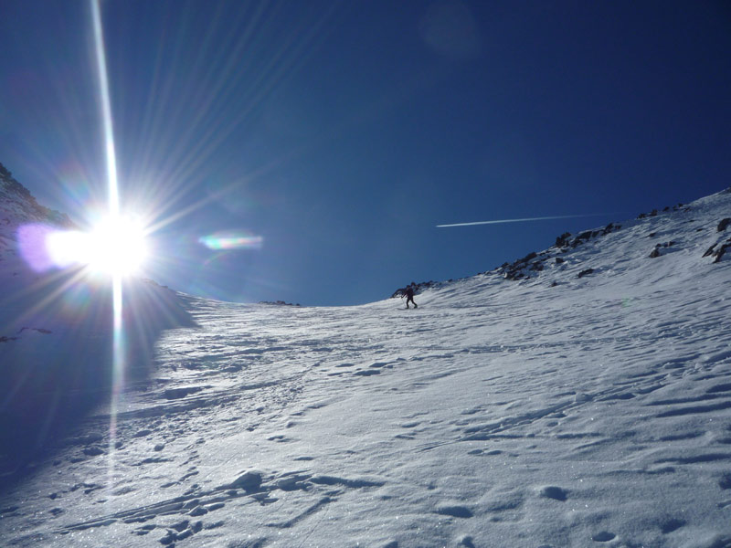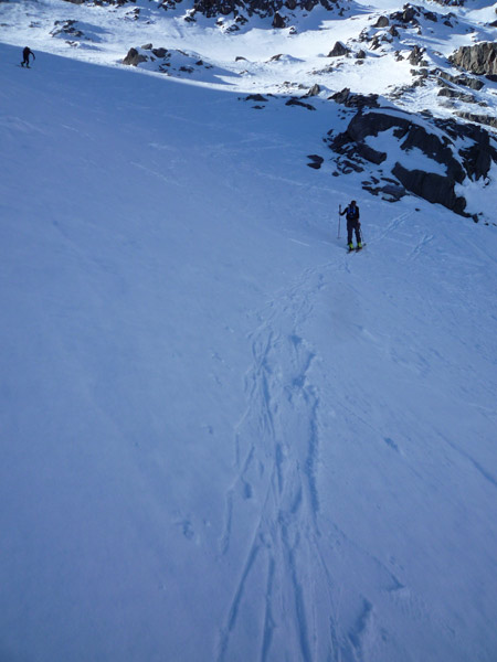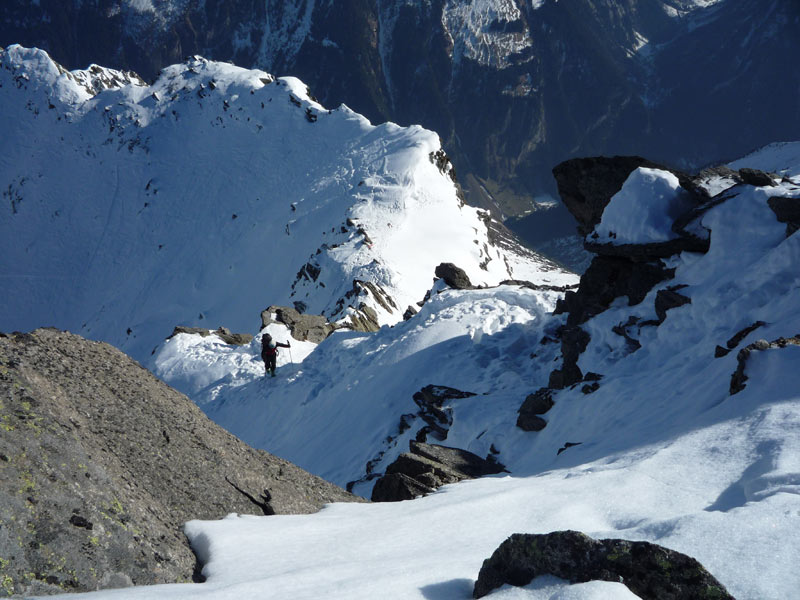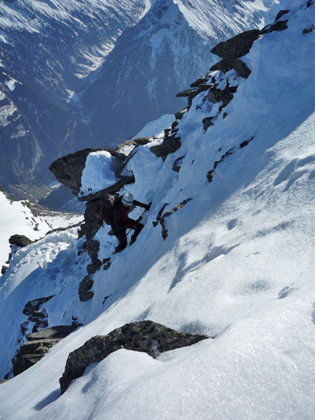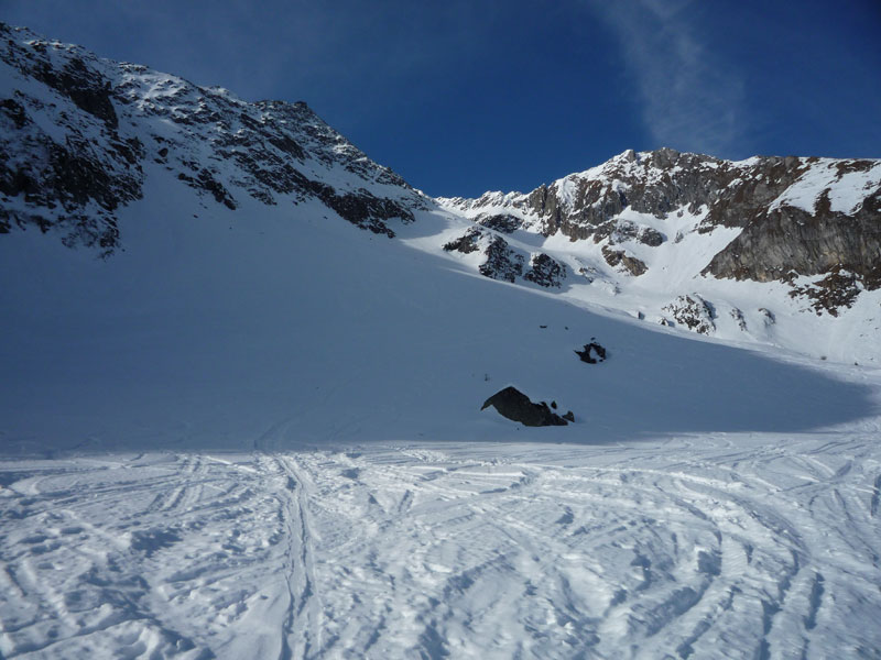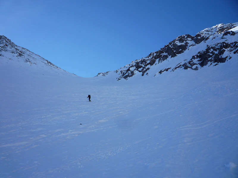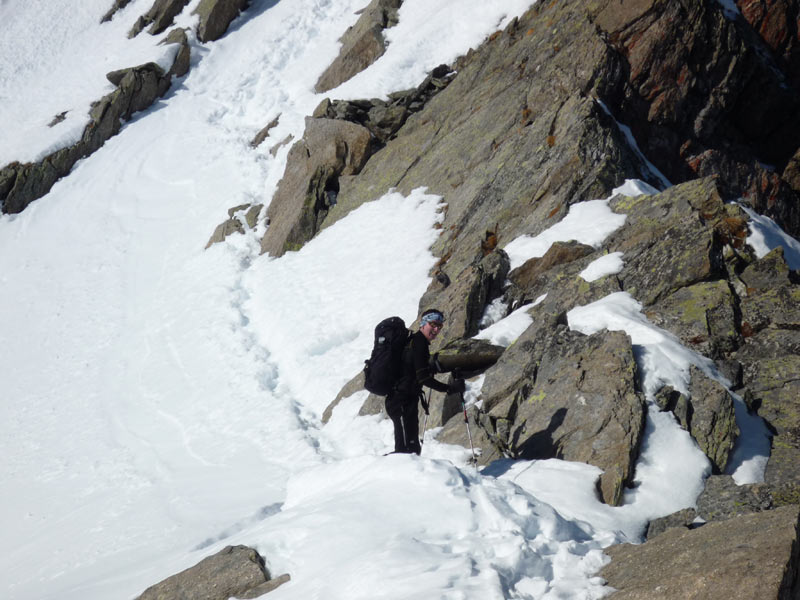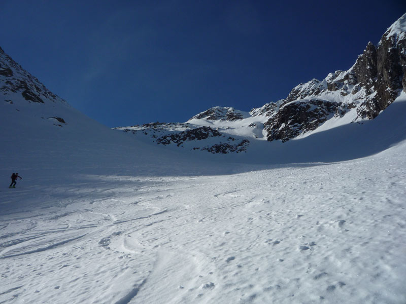 Weiter bis zu einem markantem Felsriegel der links oder rechts über sehr steile Hänge umgangen wird. Mit einer leichten Linkskurve umgeht man die vordere Grinbergspitze und gelangt nach mehreren, sehr steilen Hängen auf ein kleines Plateau (Grinberg Kees), nach der Mulde auf den Grat aufsteigen (Schidepot).