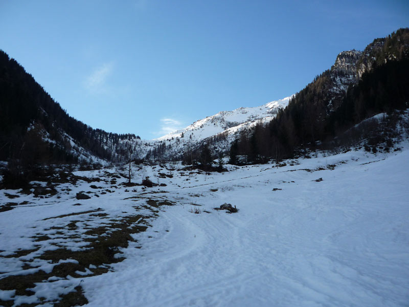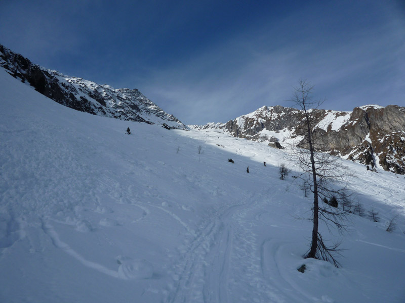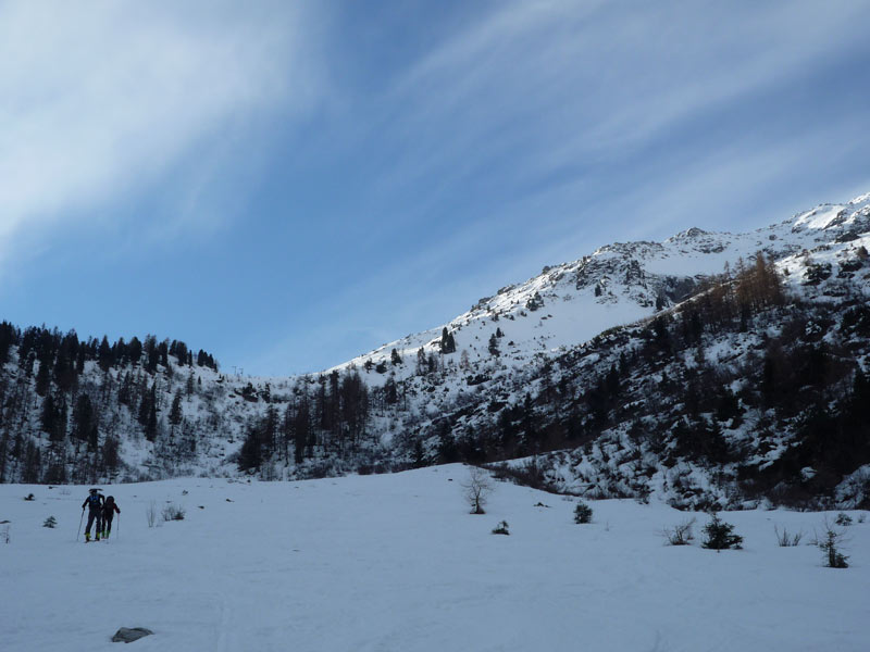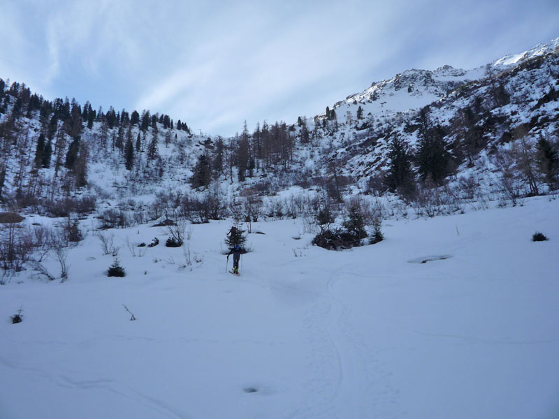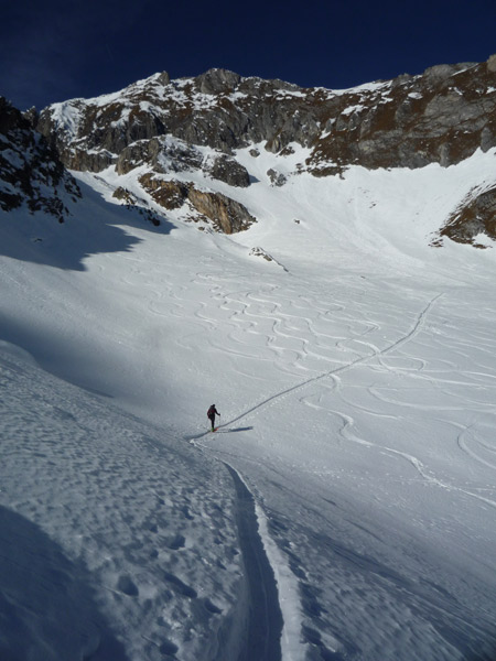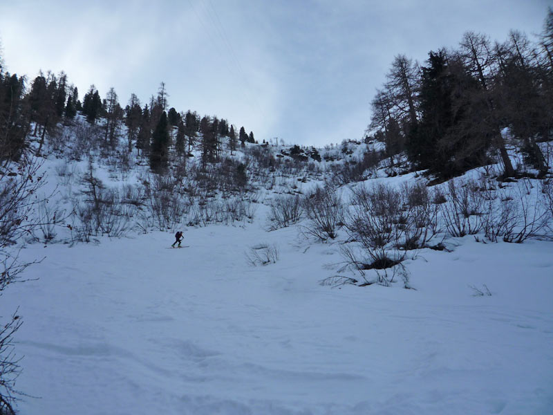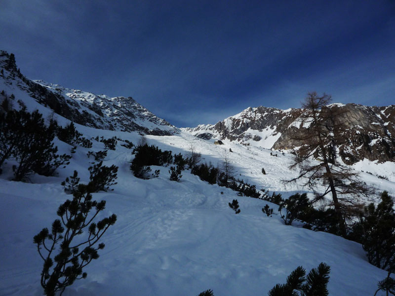 Hier steigt man bis zur Hälfte unterhalb der Materialseilbahn auf und quert dann leicht ansteigend nach rechts bis man die Waldgrenze hinter sich gelassen hat.
