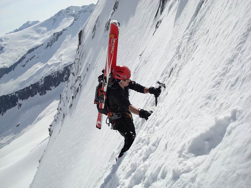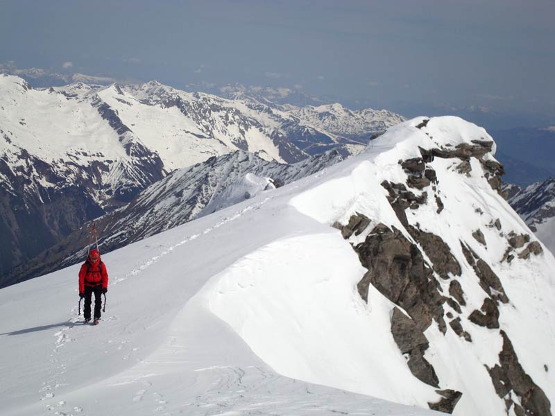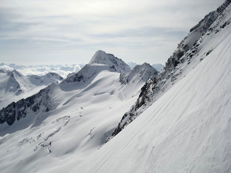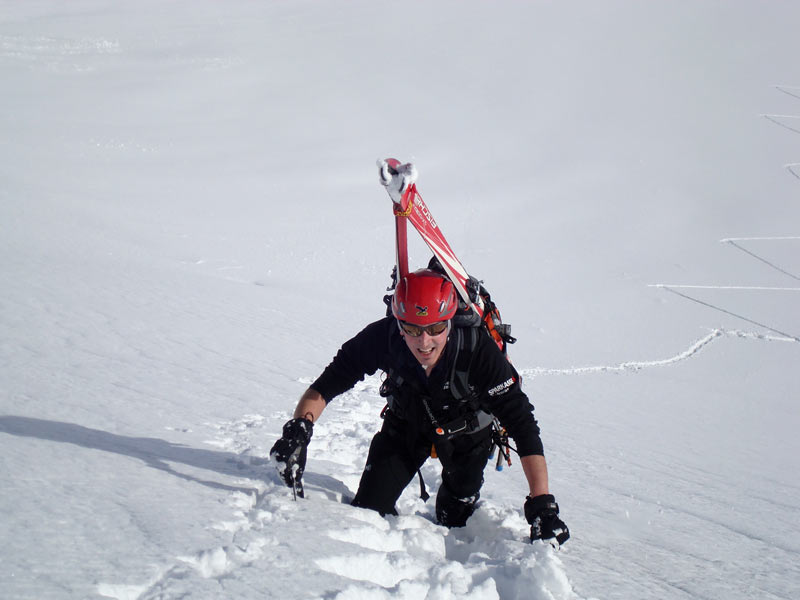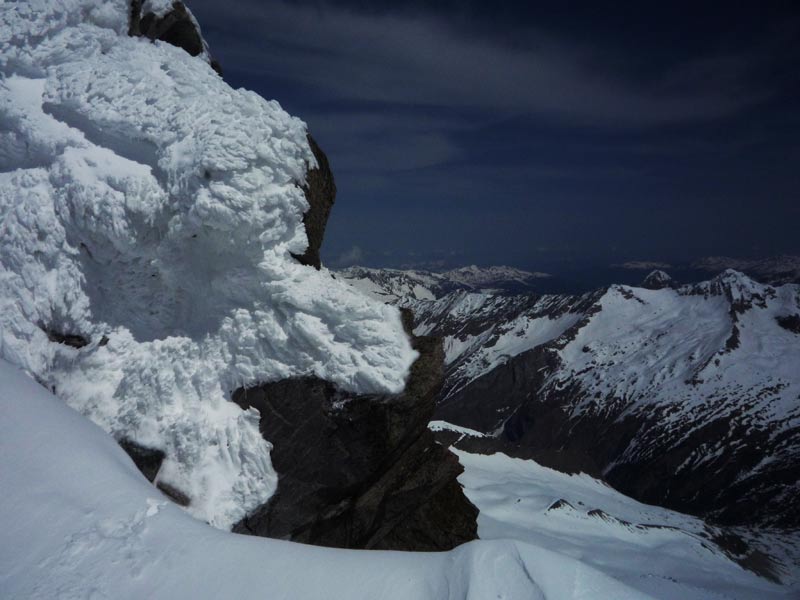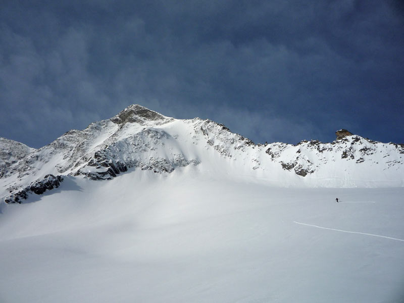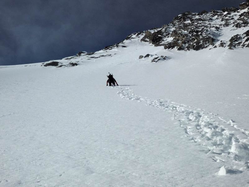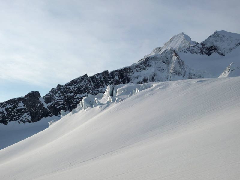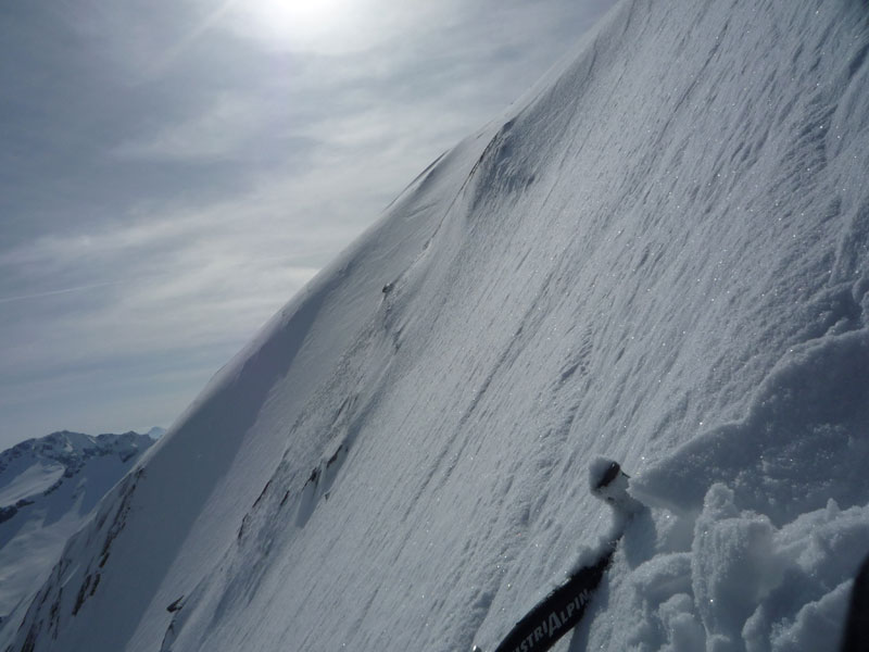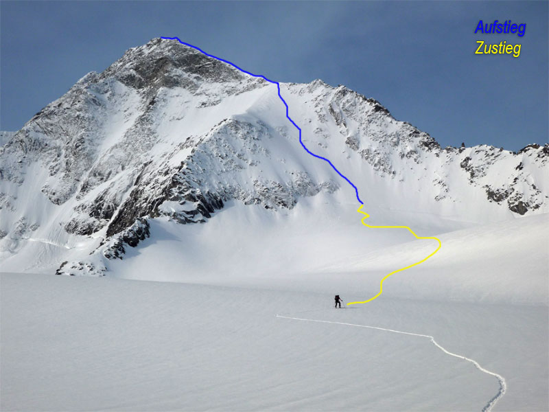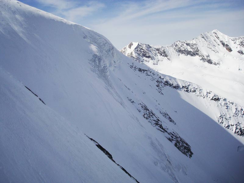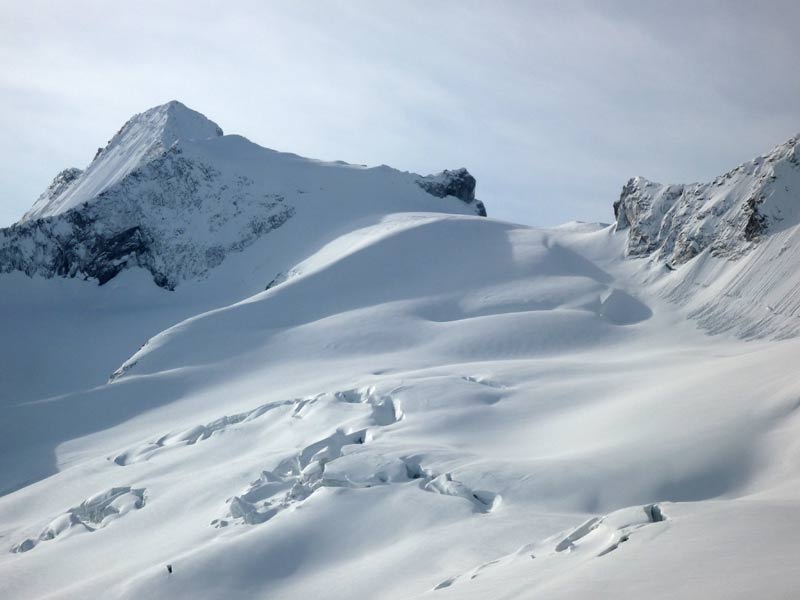 Ab hier beginnt die Kletterei in der Firnwand mit bis zu 55°. Je nach Verhältniss direkt zum Grat hoch, oder nach ca halber Wandhöhe nach links auf den etwas flacheren Firnrücken ausweichen und bis zum Nordgrat aufsteigen. Auf dem Nordgrat beginnt die leichte, kombinierte Kletterei im II Schwierigkeitsgrad bis zum Gipfel.
