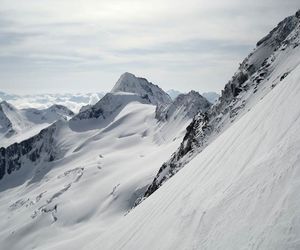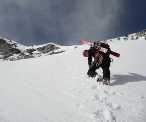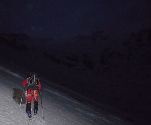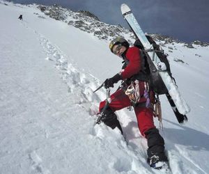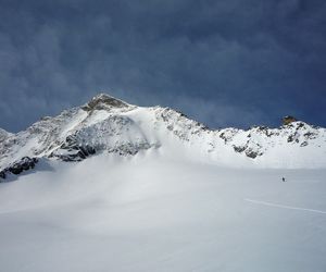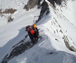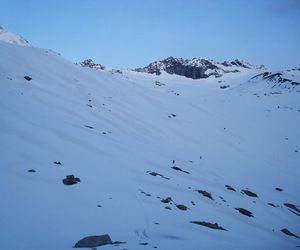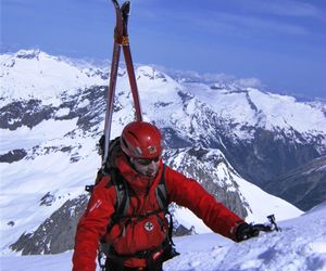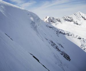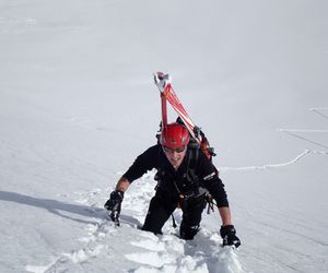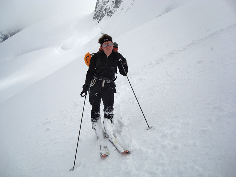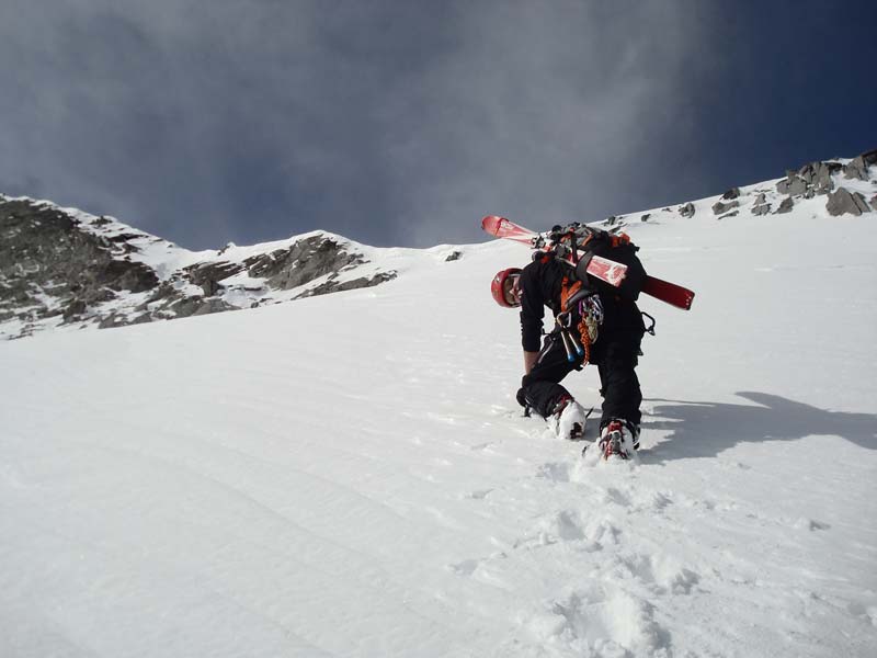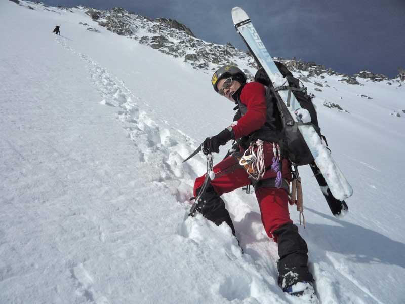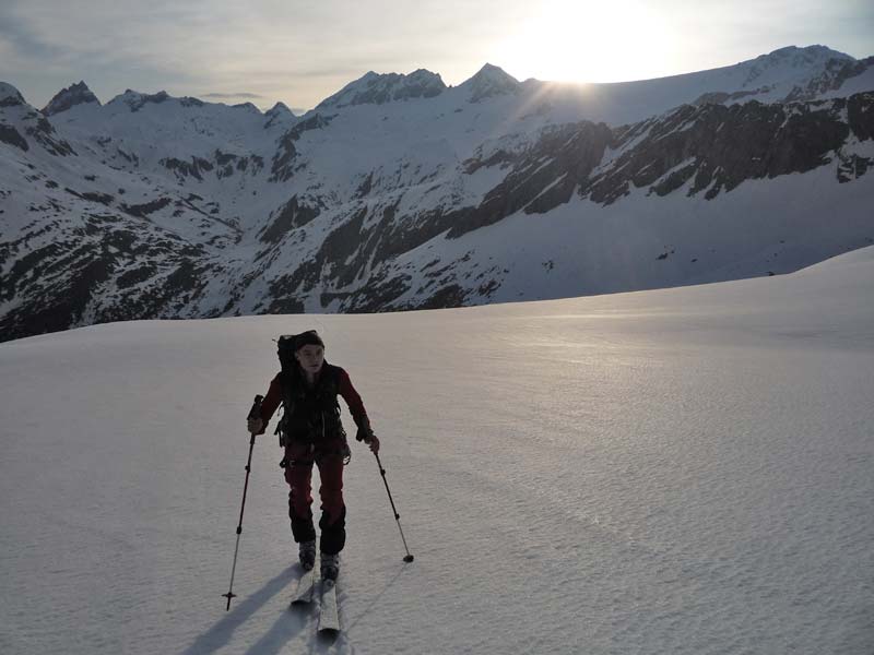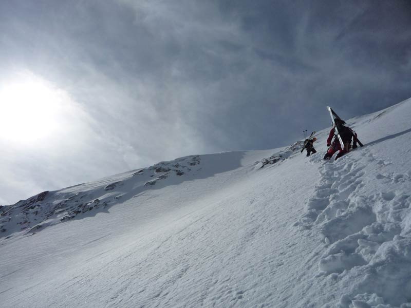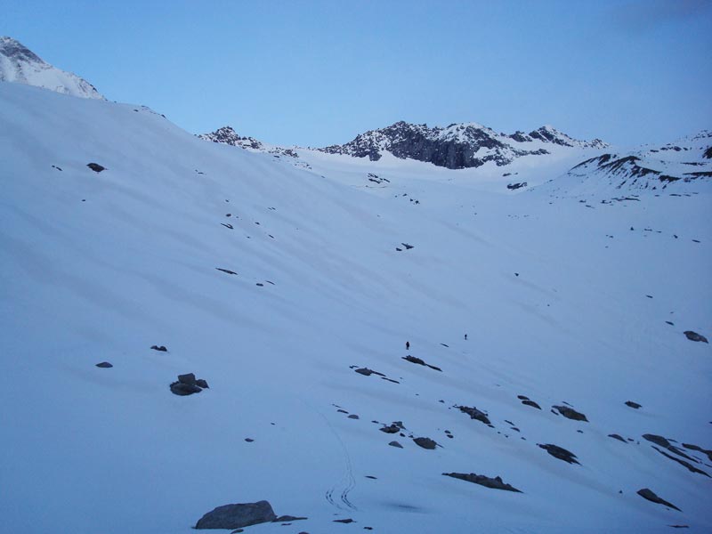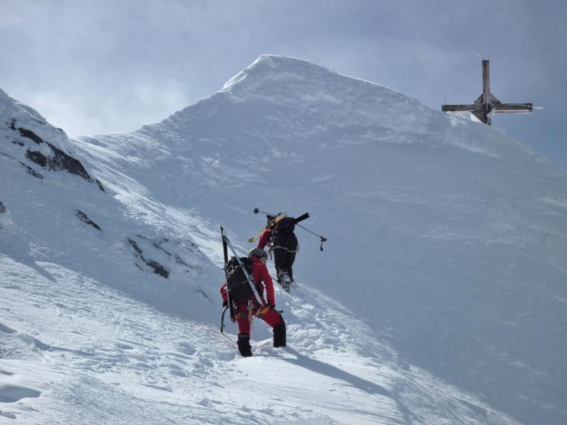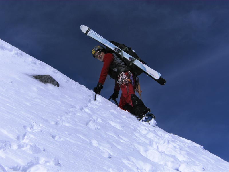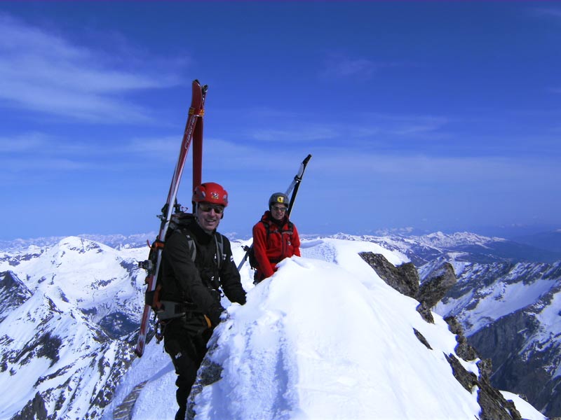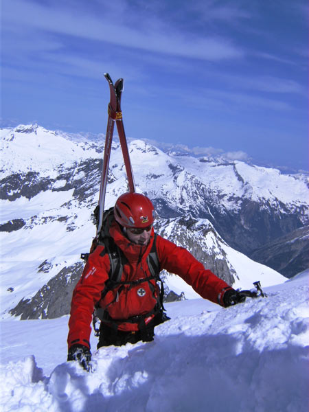 Ab hier beginnt die Kletterei in der Firnwand mit bis zu 55°. Je nach Verhältniss direkt zum Grat hoch, oder nach ca halber Wandhöhe nach links auf den etwas flacheren Firnrücken ausweichen und bis zum Nordgrat aufsteigen. Auf dem Nordgrat beginnt die leichte, kombinierte Kletterei im II Schwierigkeitsgrad bis zum Gipfel.