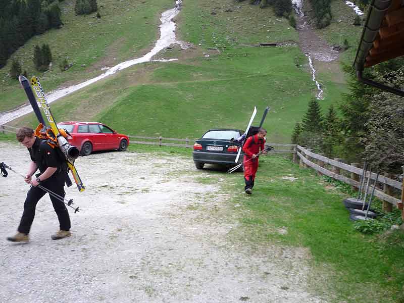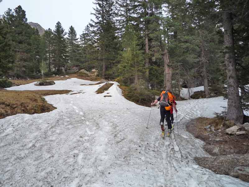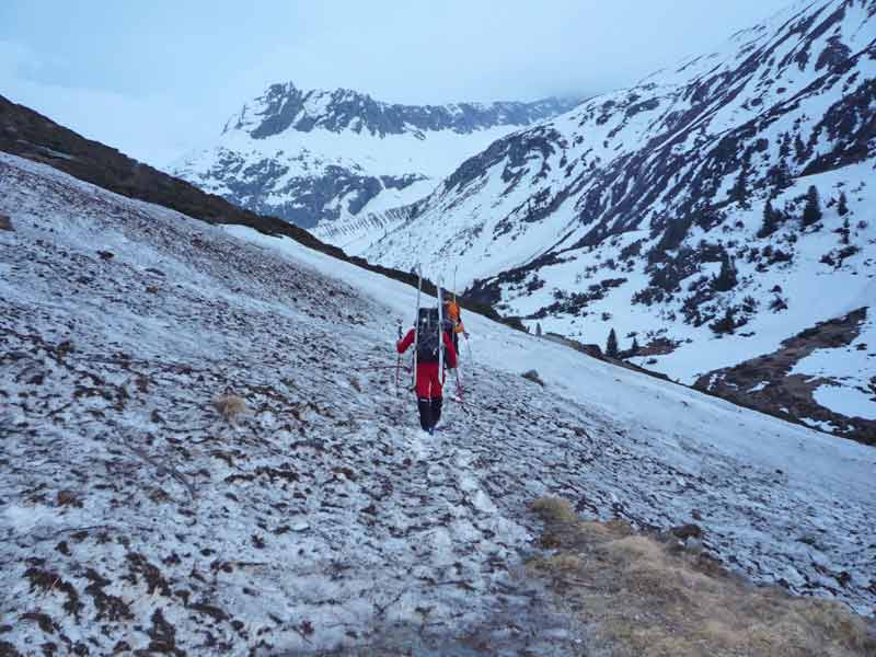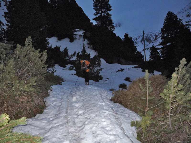 Vom Parkplatz dem Wanderweg folgen. Nach mehreren Serpentinen vorbei an der Grawandhütte. Es folgt ein langer Aufstieg bis man zum Gasthof Alpenrose kommt, hier befindet sich der Startpunkt der Schitour. Da die Tour jedoch aufgrund der Länge besser in 2 Tagen gemacht wird und die Berlinerhütte einen Winterraum anbietet der nur ca 15 Minuten entfernt liegt, ist es besser dort zu nächtigen damit man sich früh genug am Einstieg befindet.