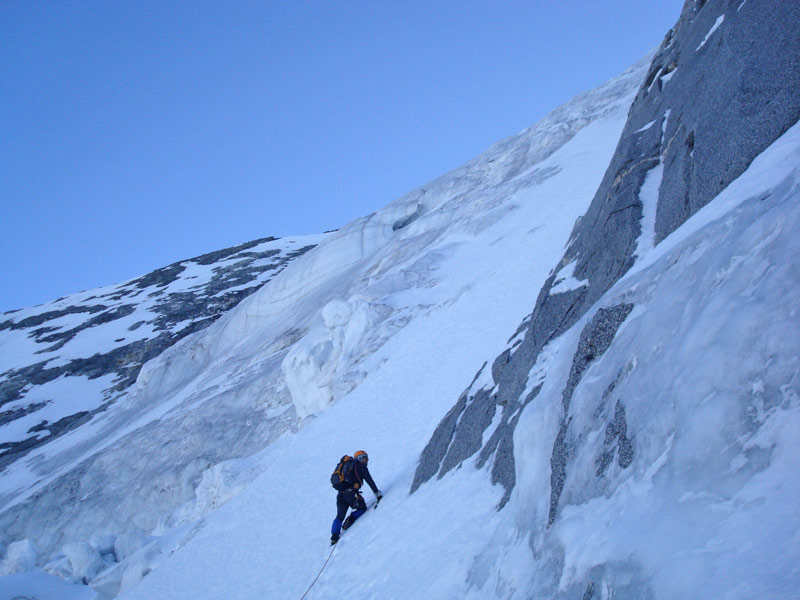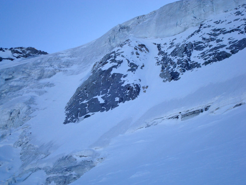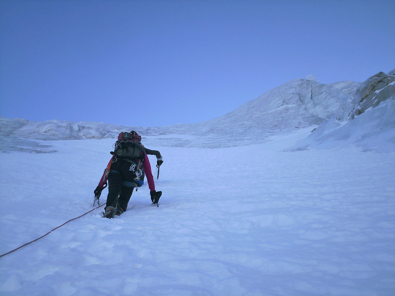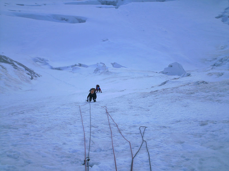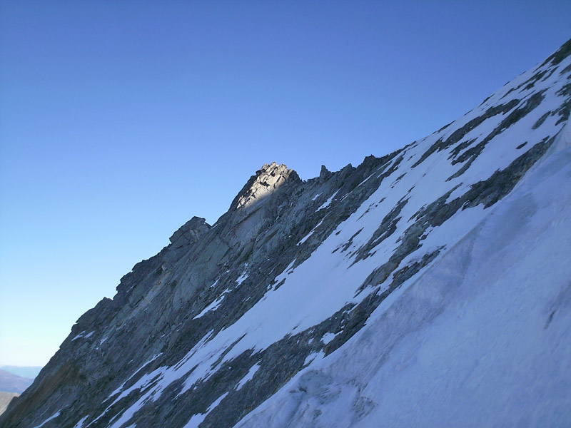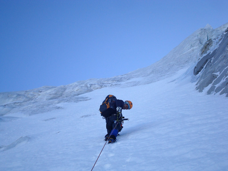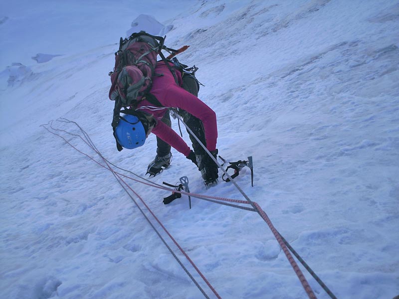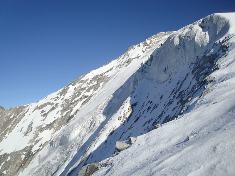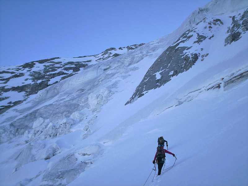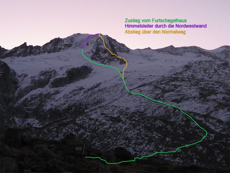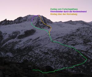 Durch die Nordwestwand hinauf (je nach Variante - Eis zwischen 50° - 60° ) Ausstieg auf einen Firnrücken und unschwierig weiter zum Gipfel.