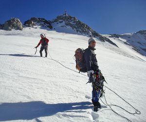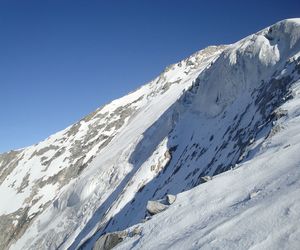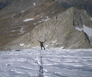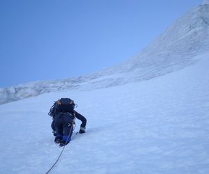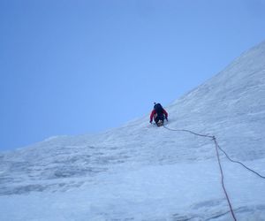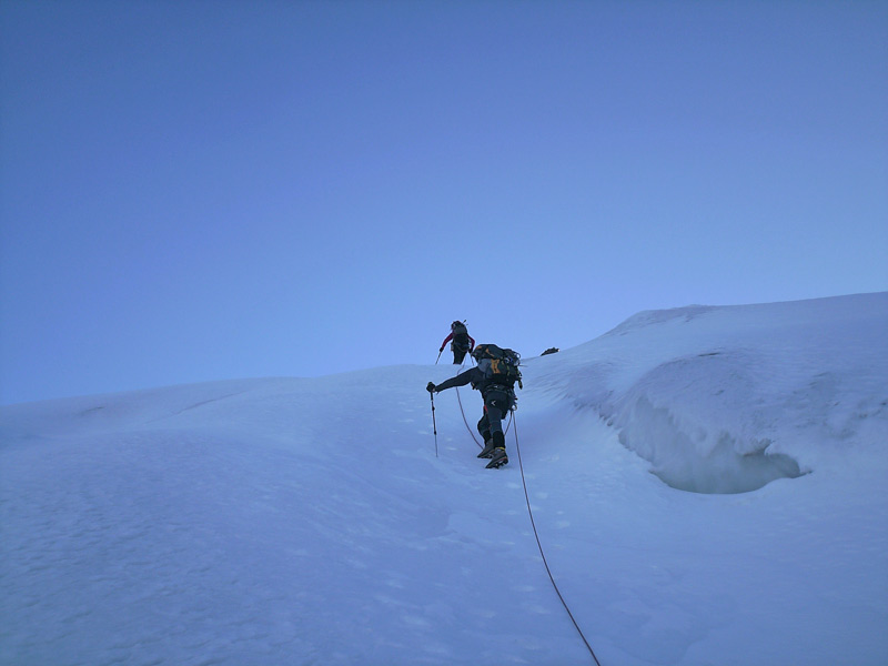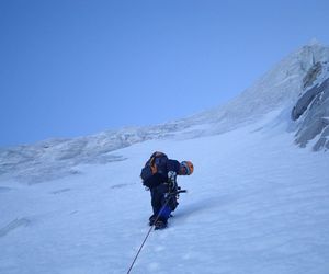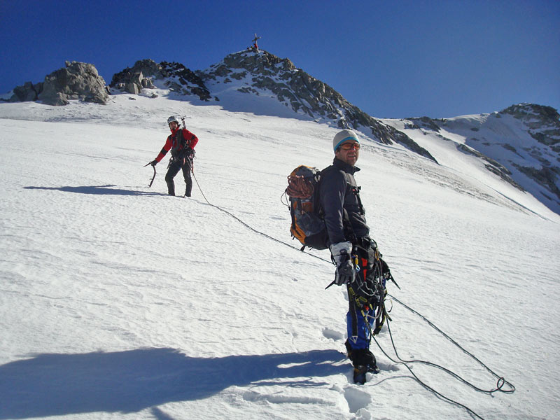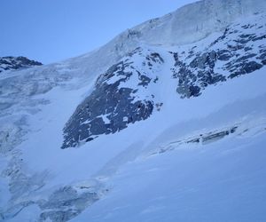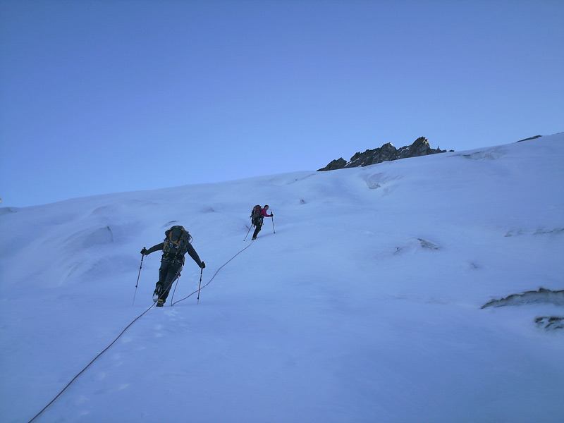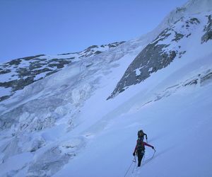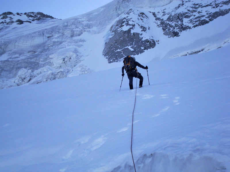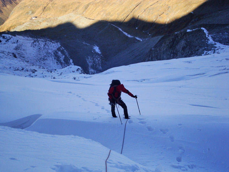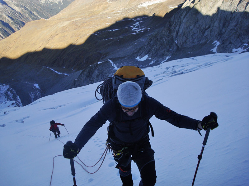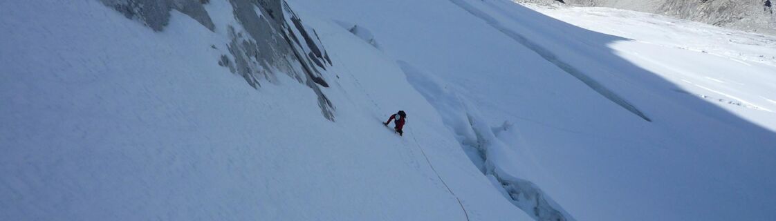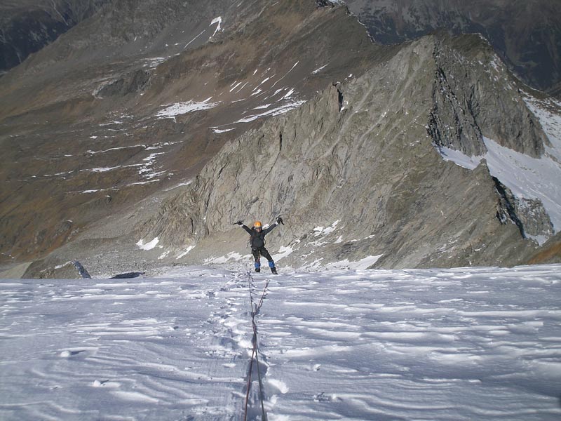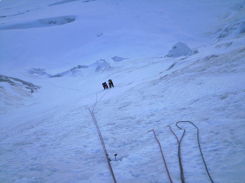 Durch die Nordwestwand hinauf (je nach Variante - Eis zwischen 50° - 60° ) Ausstieg auf einen Firnrücken und unschwierig weiter zum Gipfel.