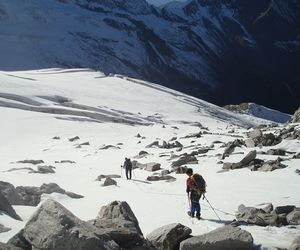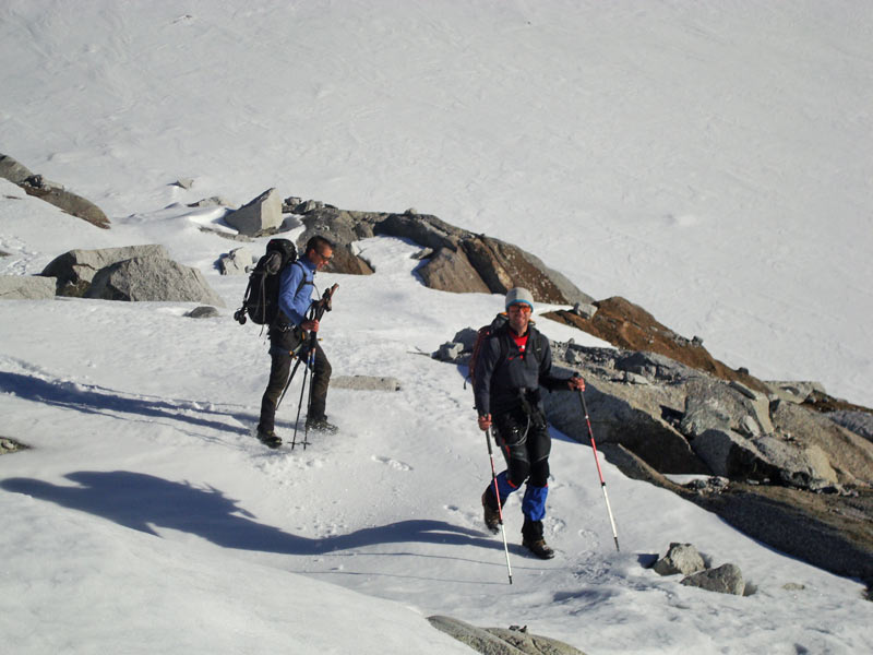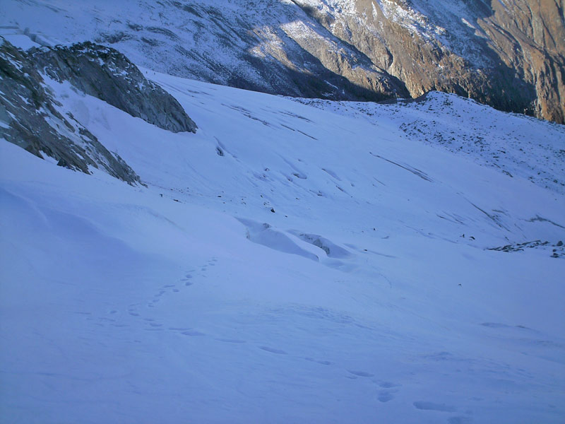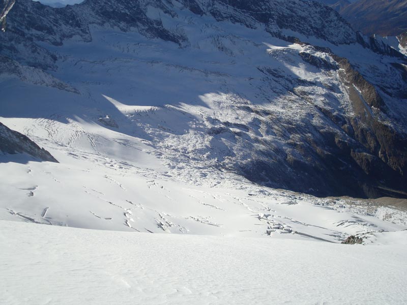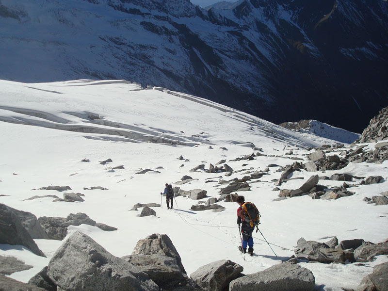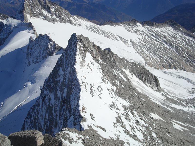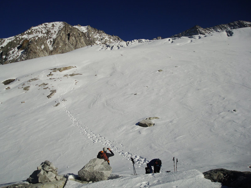 Vom Gipfel wieder hinunter auf den Firnrücken und weiter über steiles Blockgelände (I - II) absteigen. Besser rechts der Rinne bleiben und auf dem Grat abwärts auf den Gletscher und zurück zum Aufstiegsweg, über diesen weiter absteigen.