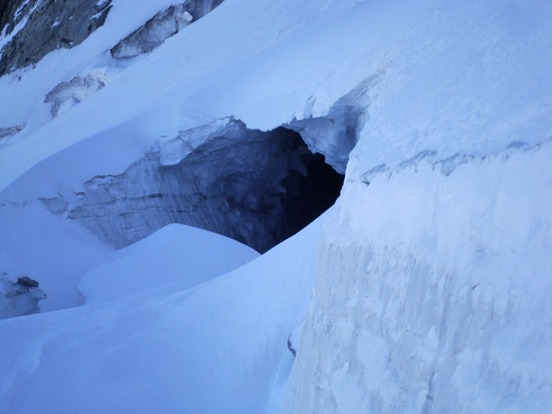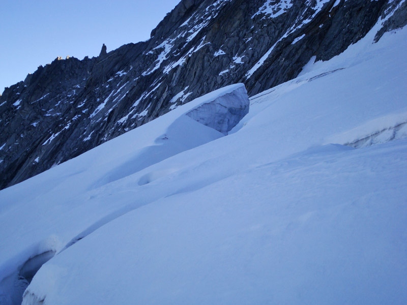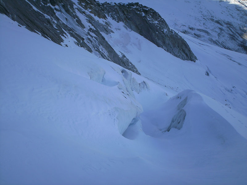 Weiter auf dem markierten Weg in Richtung Großer Möseler bis zum oberen Ende der alten Moräne. Am Gletscherbeginn auf den markanten Felspfeiler (Felsköpfl) zu und links davon steil in das Furtschaglkees empor und unter die Wand (Vorsicht Spalten).