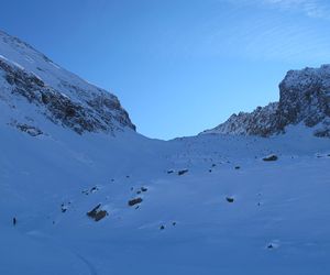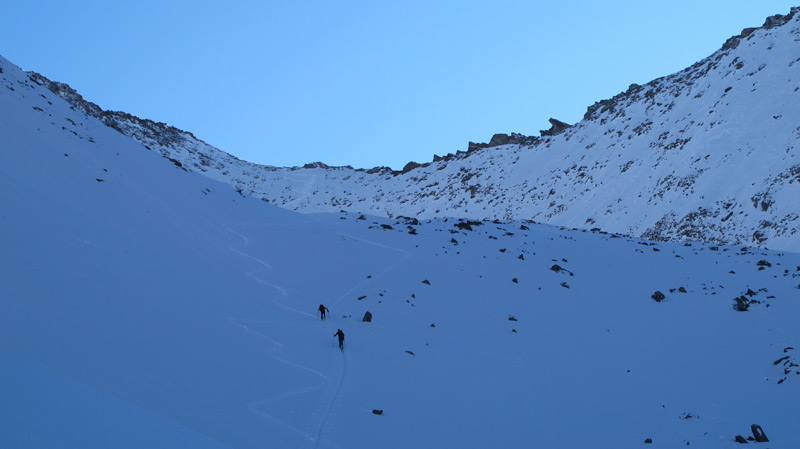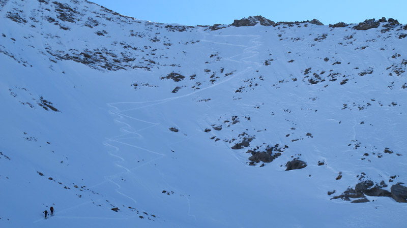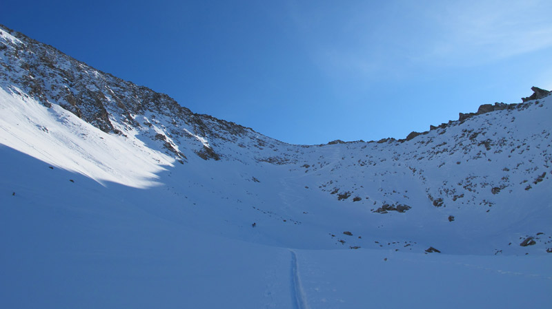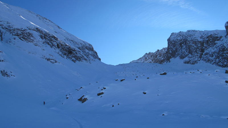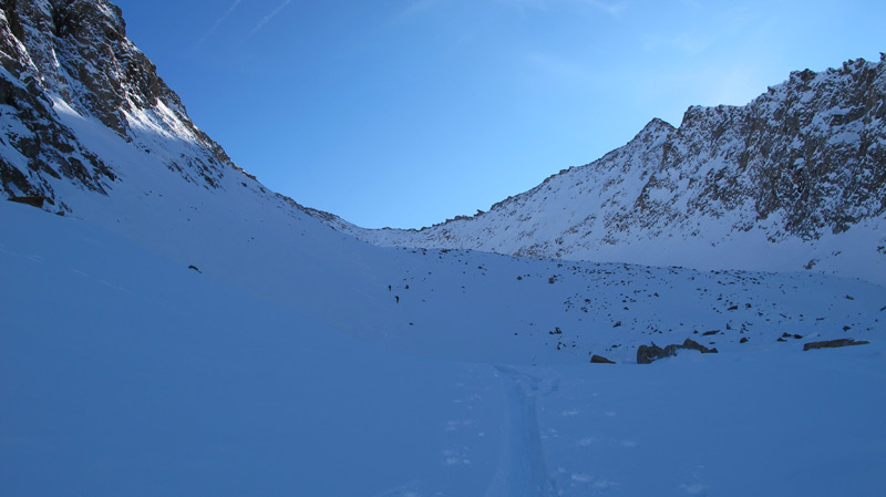 Ab hier steigt man über steiler werdendes Gelände nach rechts ins lange Wand Kar auf und folgt diesem über mehrere Hänge mit kurzen Steilstufen bis zur Scharte 2800m unterhalb der Hauserspitze. Von der Scharte in wenigen Minuten zu Fuß auf den Gipfel.