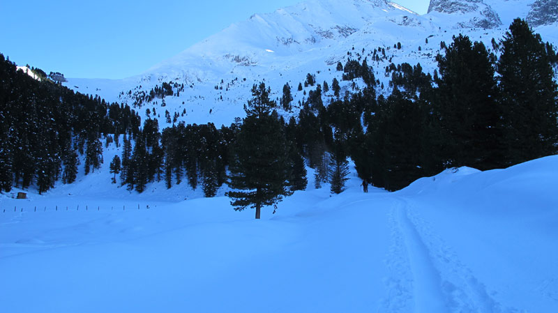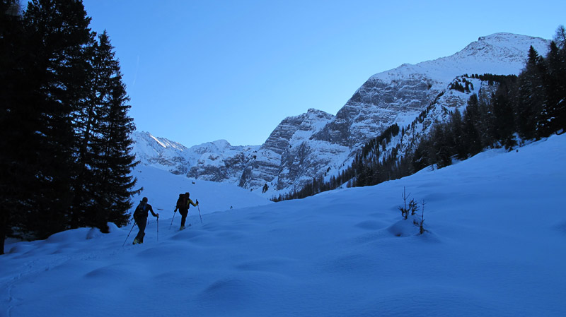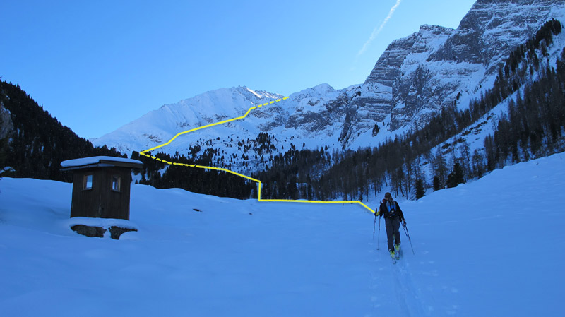 An der Hütte vorbei quert man durch den Loschboden auf flachem Gelände zum Rötboden, diesen folgt man bis kurz vor den Ausläufern der langen Wand auf ca 2020m und quert dabei mehrmals die Forststrasse.