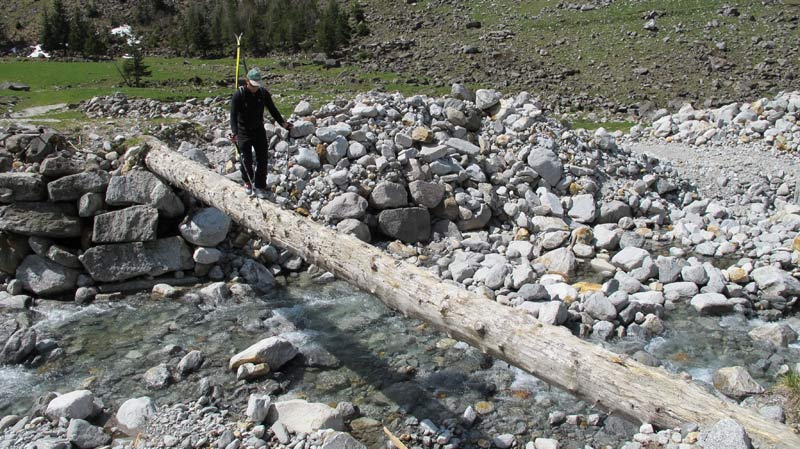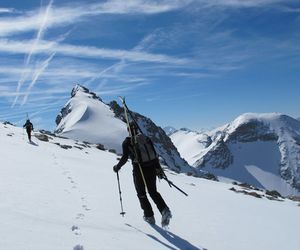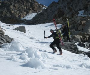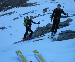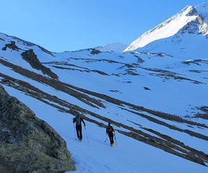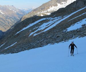 Über die Aufstiegsspur hinab bis auf ca. 2500m. Ab hier quert man in westlicher Richtung knapp unterhalb vom Fuß der Grüne Wand Spitze das „Eiskar“ bis in Falllinie der Keilbachspitze. Jetzt rechts hinab in nördlicher Richtung durch eine steile Rinne auf den Stapfenboden. Weiter bis zu einem Fahrweg. Auf diesem zu einer verfallenen Brücke (Baumstamm) auf die andere Talseite und zurück zum Grüne Wand Haus. Bei geringer Schneelage empfiehlt es sich über die Aufstiegsroute abzusteigen.