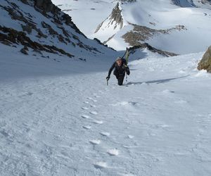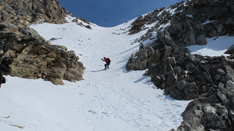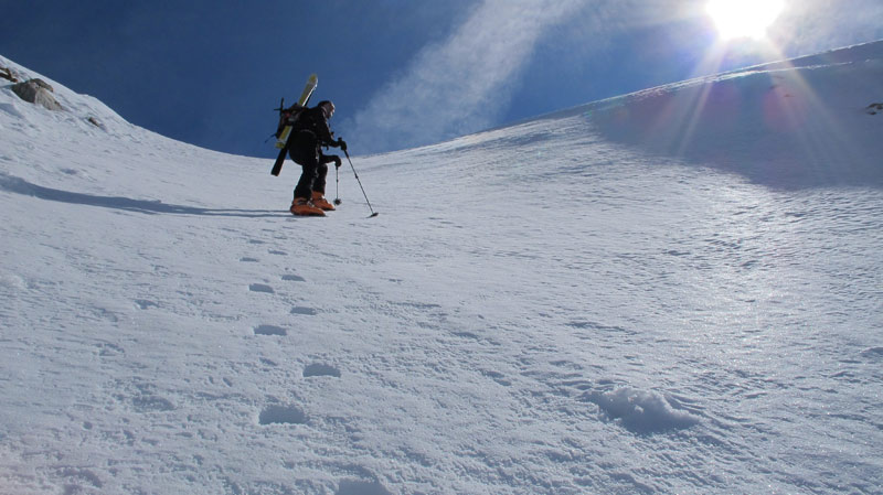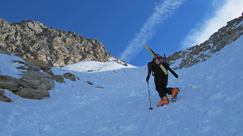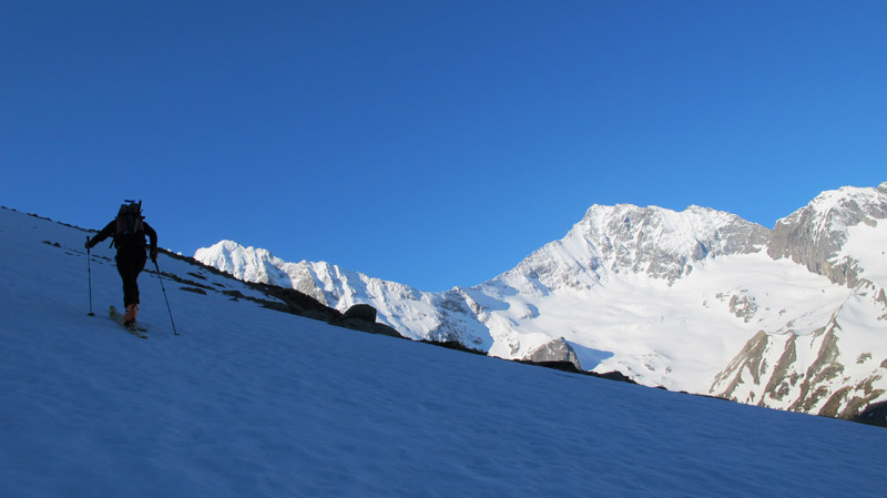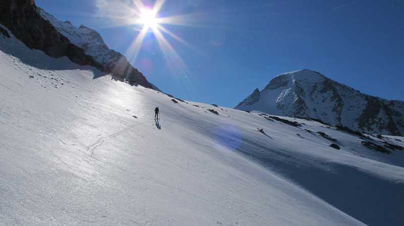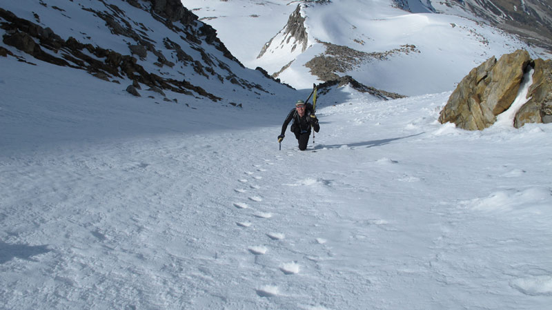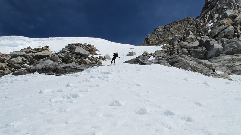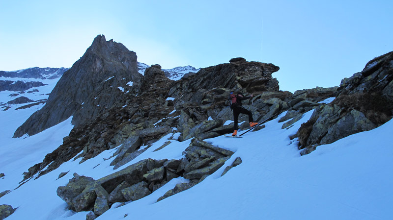 Auf dem Sommerweg Richtung Kasseler Hütte. An dieser oberhalb übers „Eurer Mannl“  vorbei in Richtung östliches Stillupkees. Kurz bevor man dieses erreicht auf ca. 2500m links in östlicher Richtung die steile Flanke hinauf (Der Felsriegel kann links oder rechts umgangen werden) bis man auf ca. 2800m wieder flacheres Gelände erreicht. Ab hier ist die Rinne die in nordöstlicher Richtung auf den 3210m hohen Firnrücken führt bereits gut zu erkennen. Durch diese nach oben hin steiler werdend empor (kurz vor dem Ausstieg max 40°-45°), anschliessend steigt man in südwestlicher Richtung wenige Meter in das kleine Becken ab und erreicht den schönen Firngrat der zum Gipfel führt.