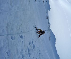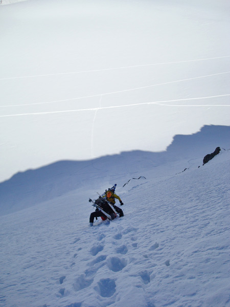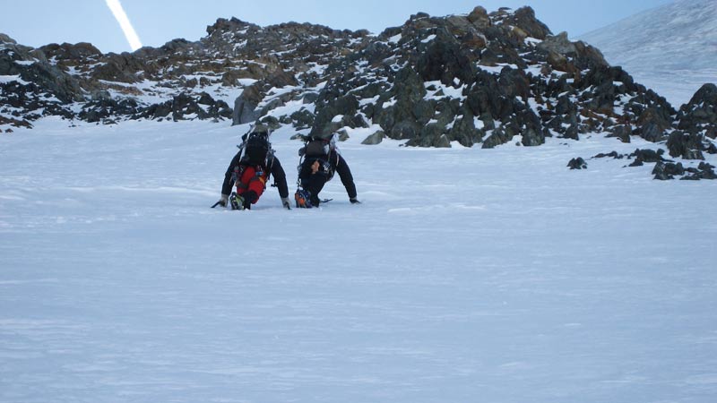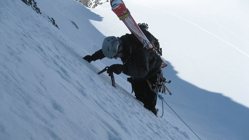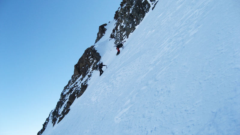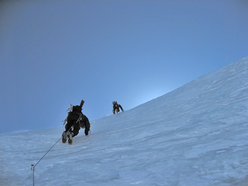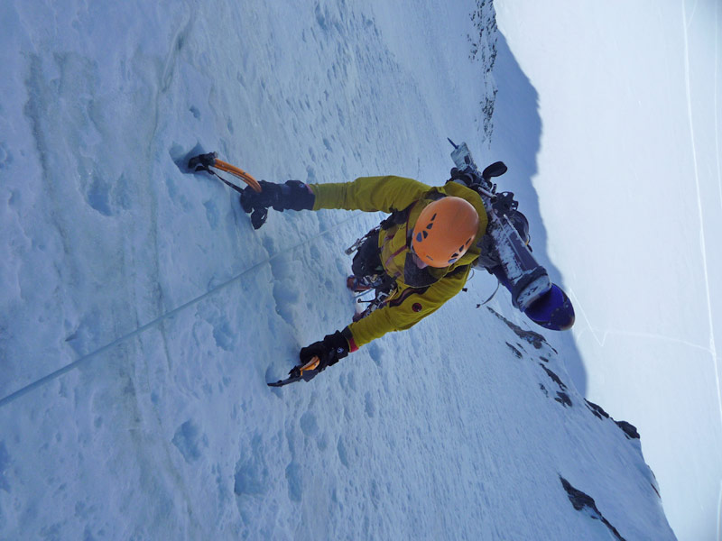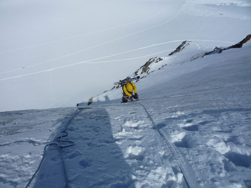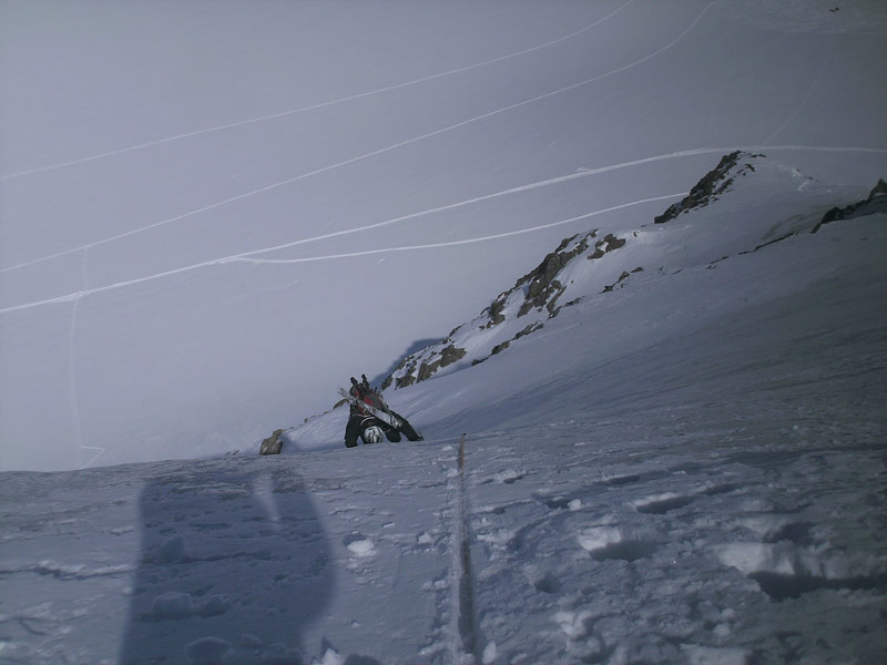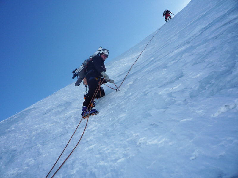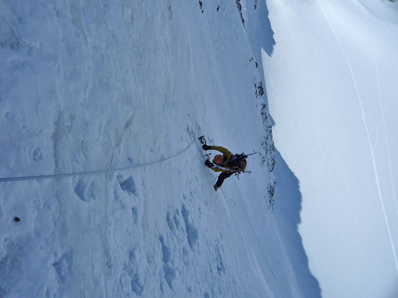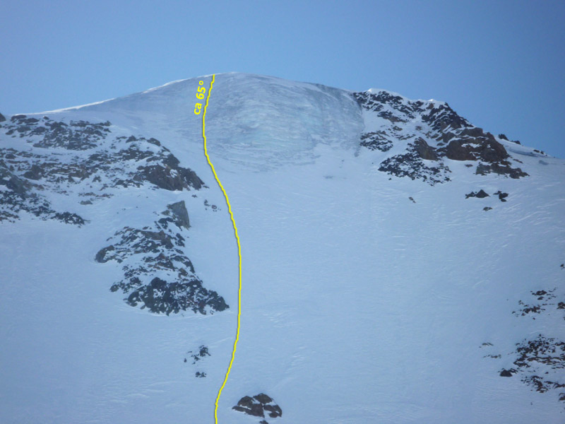 Beginnend mit ca 50° Hangneigung steigt man auf Trittfirn bis zur hälfte der Wand, ab hier steilt die Wand noch mal auf 55° auf bis zur Eisnase, hier kann zwischen 55° und 80° Grad gewählt werden.