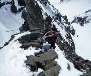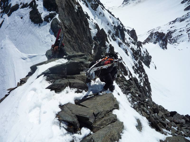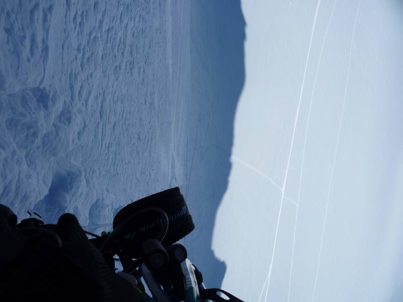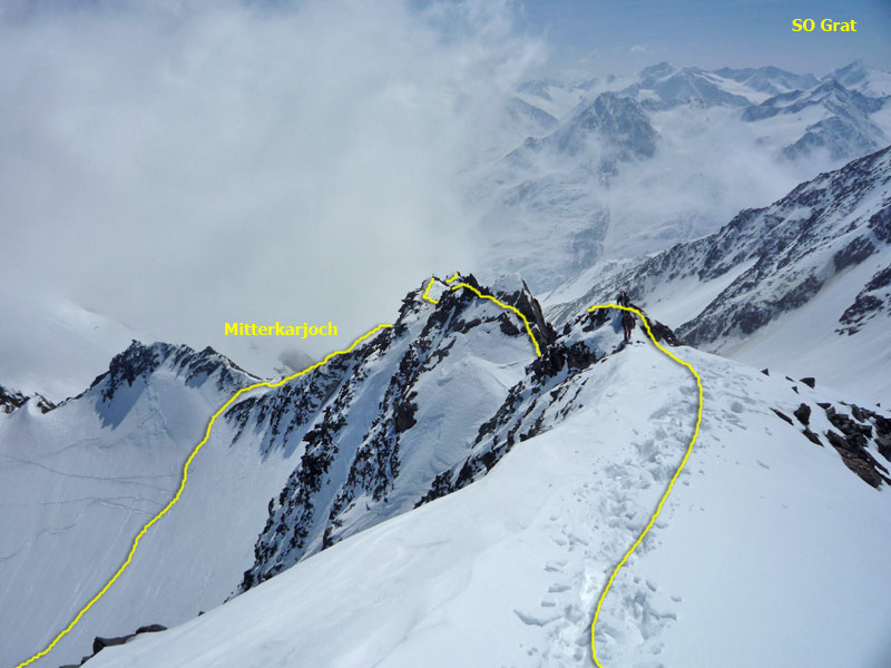 Der Grat ist sehr ausgesetzt und erfordert sicheres gehen mit Steigeisen. Sobald man am tiefsten Punkt angelangt ist (Mitterkarjoch) verlässt man den Grat und quert den Hang zurück zur Aufstiegsspur.