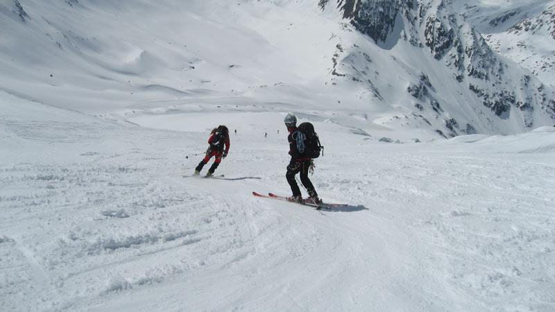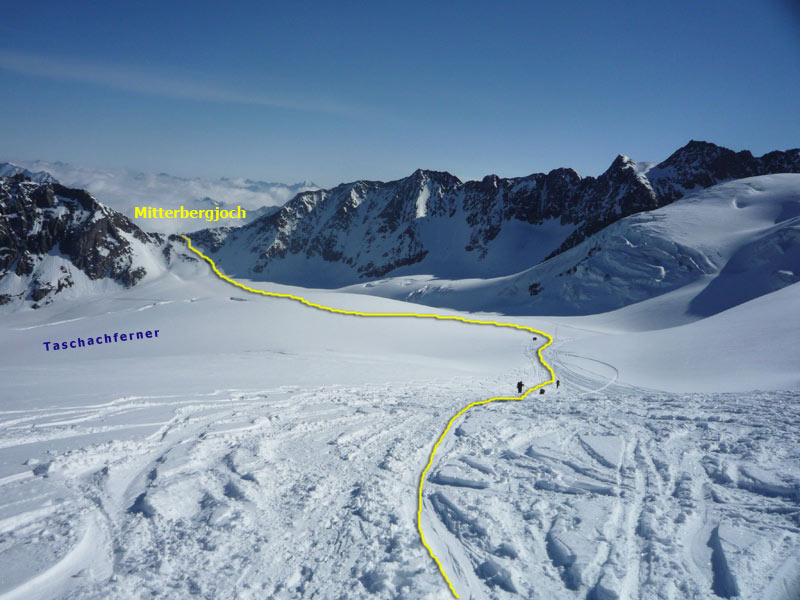 Bei guten Schneeverhältnissen kann man durch das Taschachtal bis zum Parkplatz der Gletscherbahn abfahren (Frisch gewachselte Schi von Vorteil!!), im Sommer muss man mit der Gletscherbahn den Rückweg antreten.