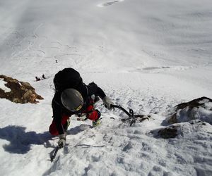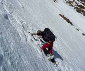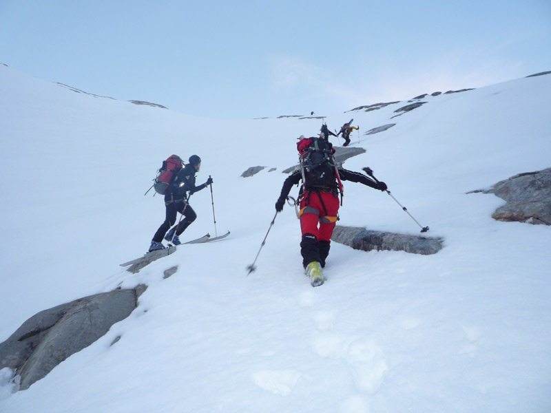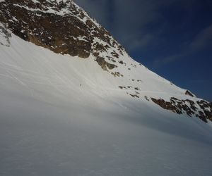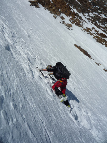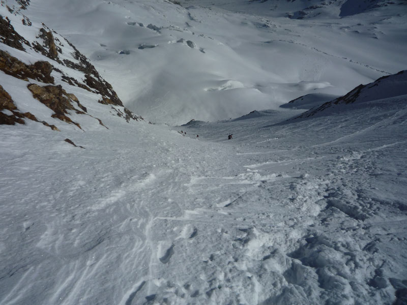 Mit Schi über die Wand abfahren, ansonsten muss über die Wand abgeklettert/abgeseilt werden oder eine alternative Route über eine der Nachbarrinnen gesucht werden.