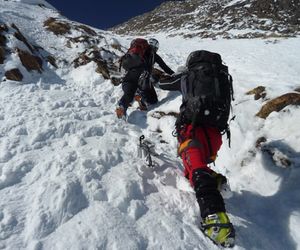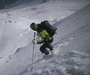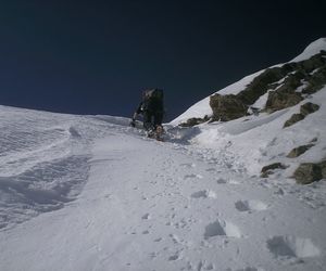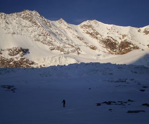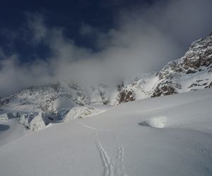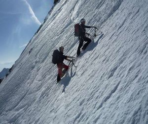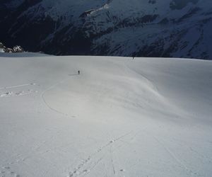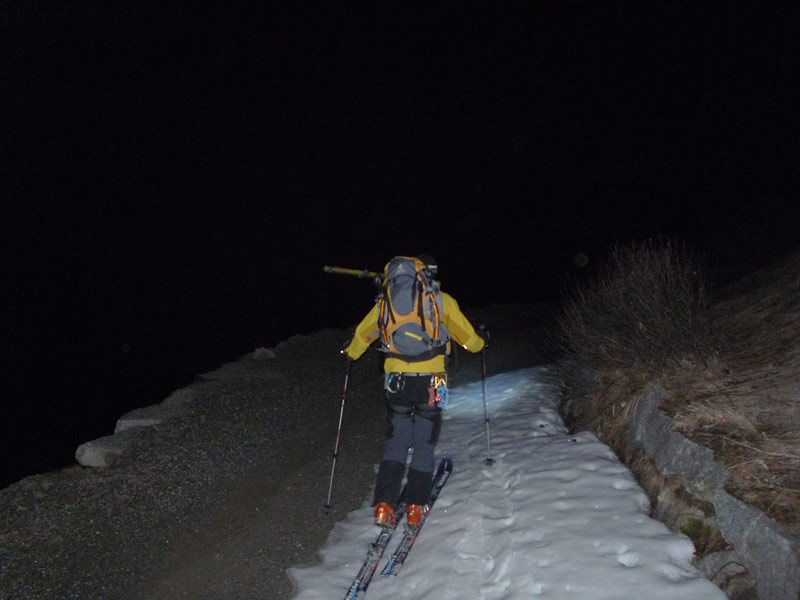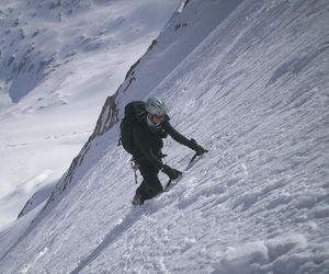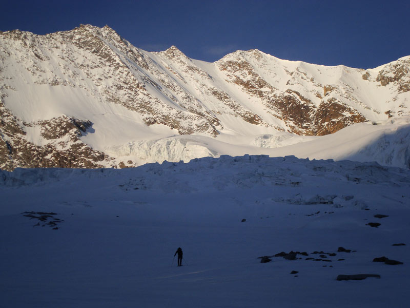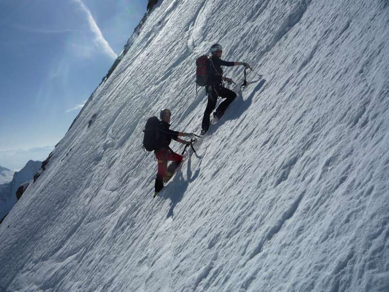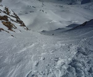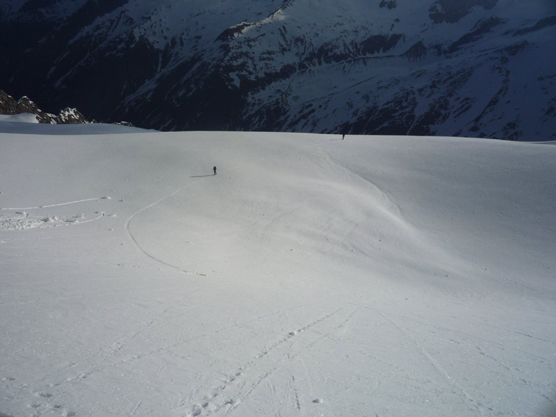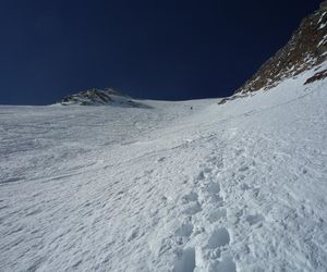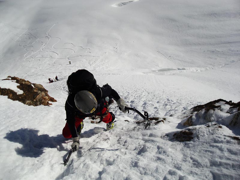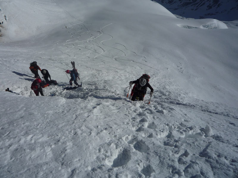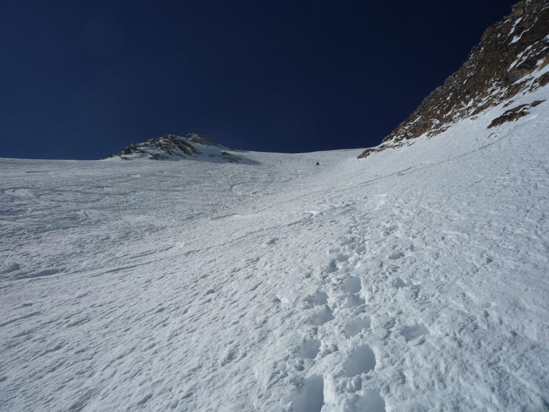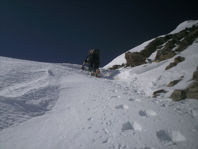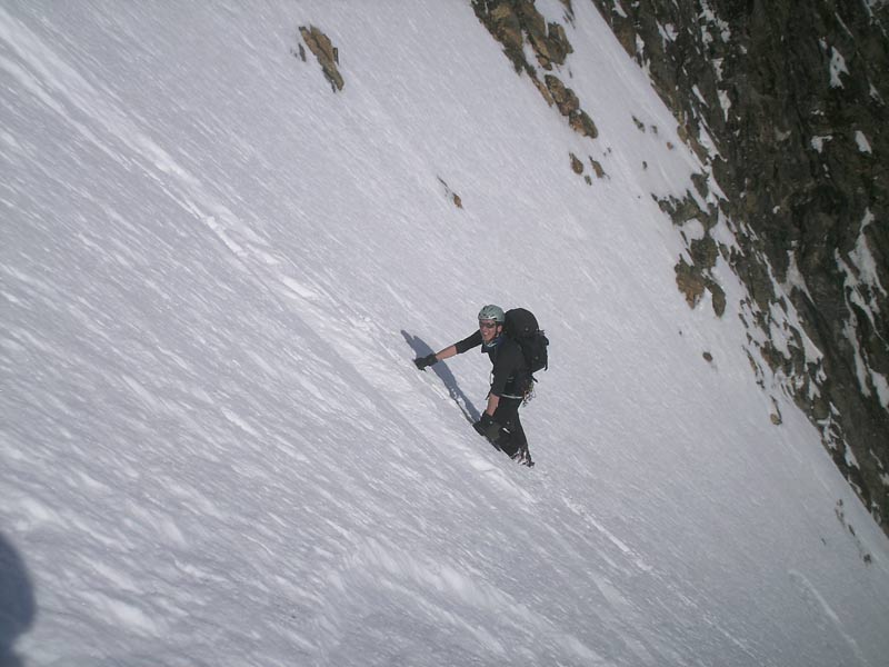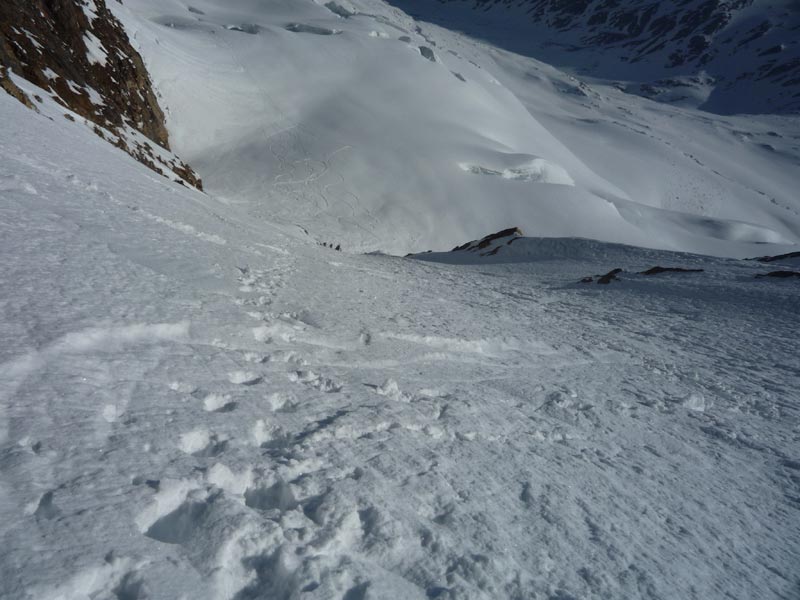 Je nach Möglichkeit über die Randspalte und nach ca 30 Metern zu einem kleinen Felsriegel der im Frühsommer für Felskontakt sorgen kann (Schlinge mit Karabiner).