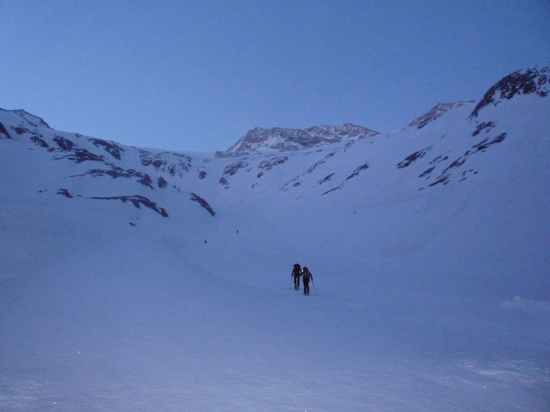 Am Ende des Talbodens rechtshaltend über einen steilen Hang auf das Plateau des Schlegeiskees (ca 2600m).Von hier an je nach Verhältnissen links oder rechts an den großen Eisbrüchen vorbei Richtung Wandfuß. Am Ende gelangt man auf den Weg der vom Pfitschertal kommt. Von hier nur noch wenige Meter bis zur Randspalte (Einstieg).