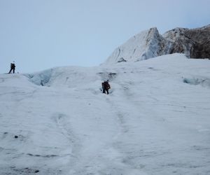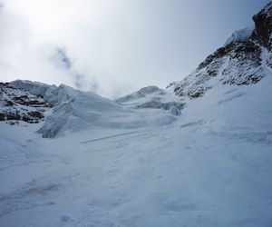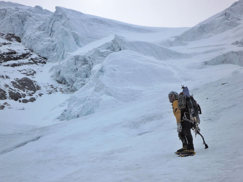 Variante2 - Direkt durch den Gletscherbruch, meist die besten Verhältnisse aufgrund des Eises, hier kann man zwischen 60° bis 80° Varianten klettern.