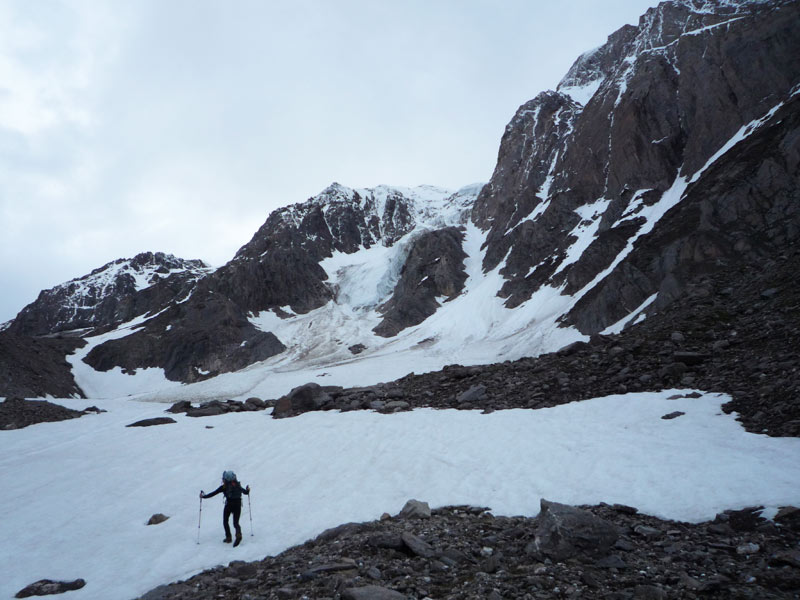 Auf dem Weg in Richtung Messner Biwak das auch als Stützpunkt verwendet werden kann bis zu den Moränen des Hochferners, hier den Weg verlassen und über wegloses Gelände auf den Gletscher bis zum Einstieg auf ca 2300m.