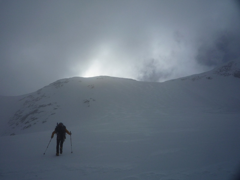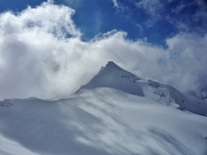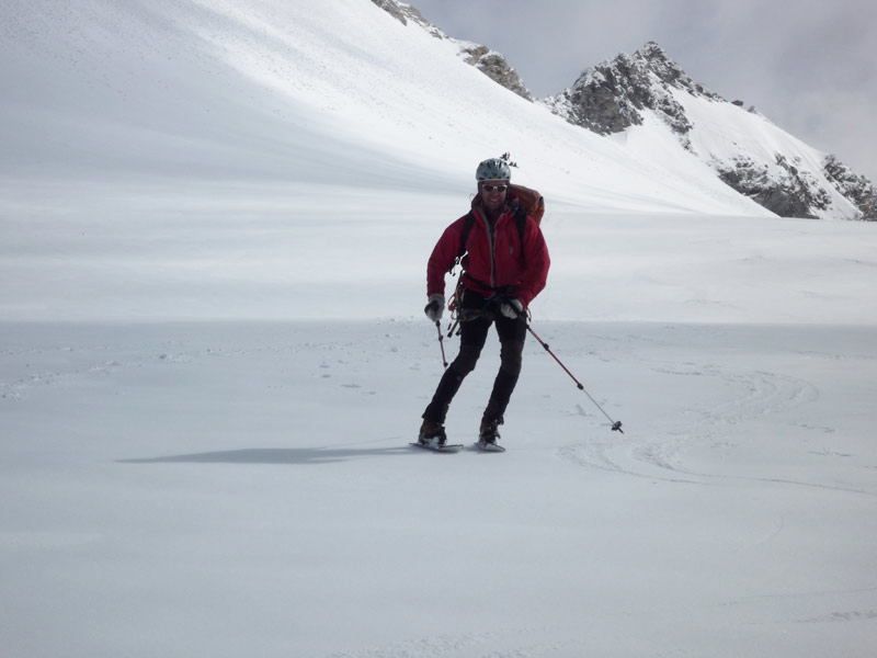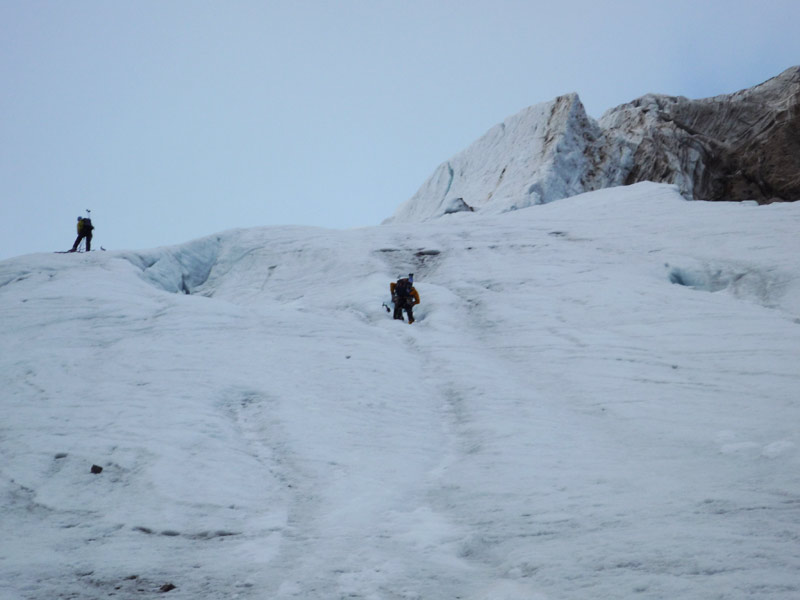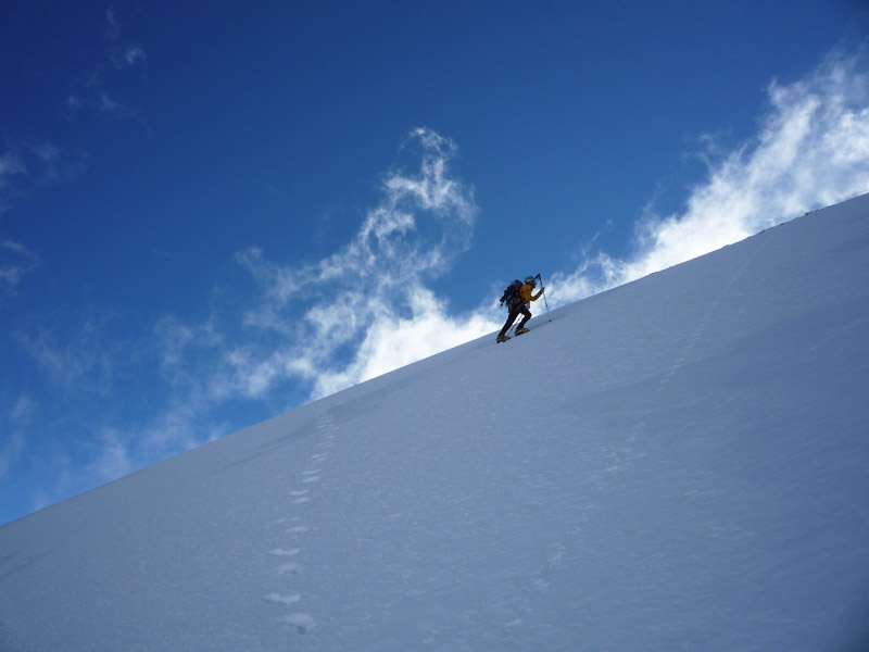 Einstieg in der linken Hälfte der ersten Steilstufe mit ca 55°, anschliessend folgt ein flacher, langer Rücken mit kleineren Steilstufen durchsetzt bis unter den mächtigen Gletscherbruch, hier gibt es mehrere Varianten.