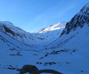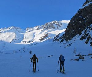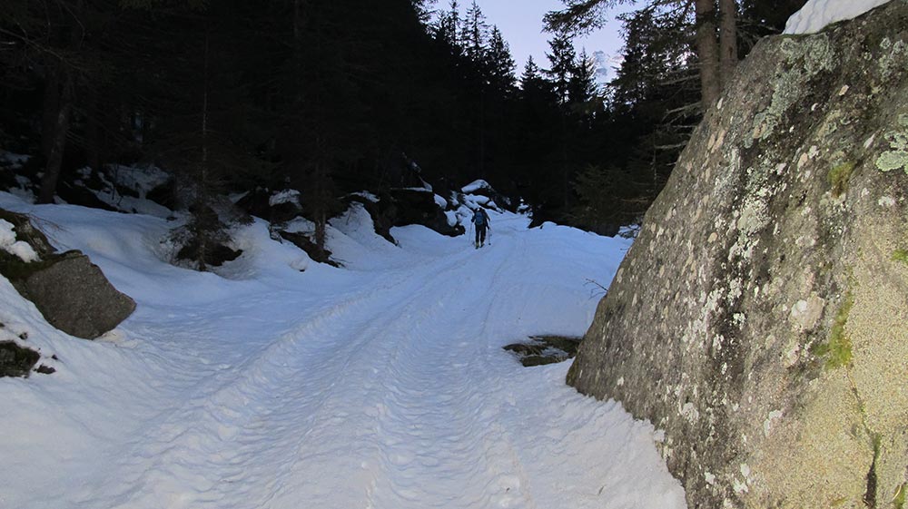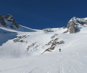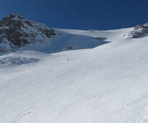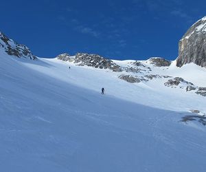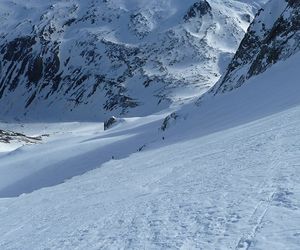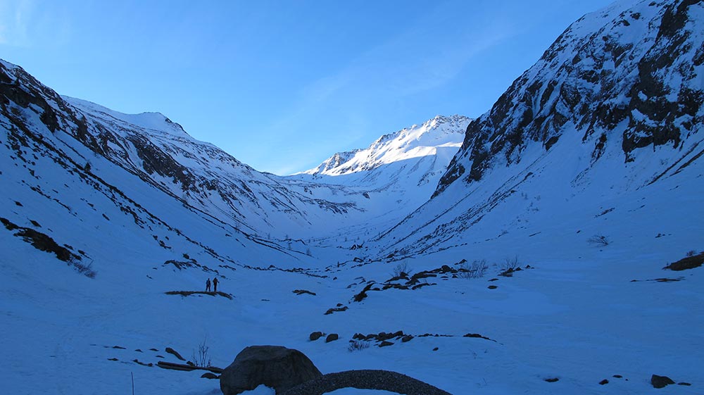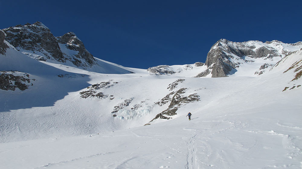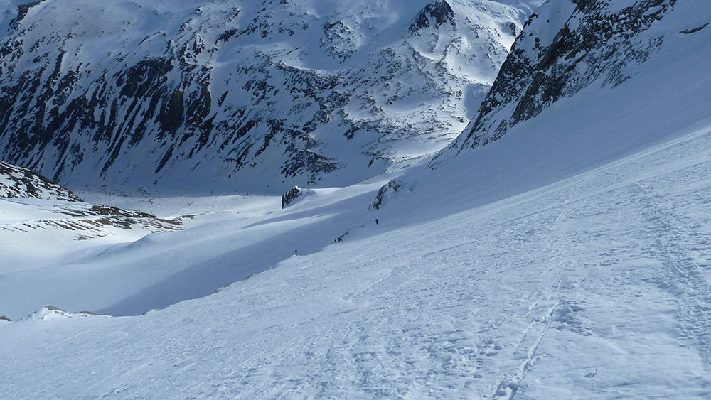 Hier endet der mühsame, flache Almweg in einen Karboden. In einem leichten Rechtsbogen folgt man der logischen Linie bis zu den Ausläufern unterhalb des Gletschers. Nun steigt man über kupiertes Gelände zu den langen, steilen Hängen auf der linken Seite des Kessels auf.