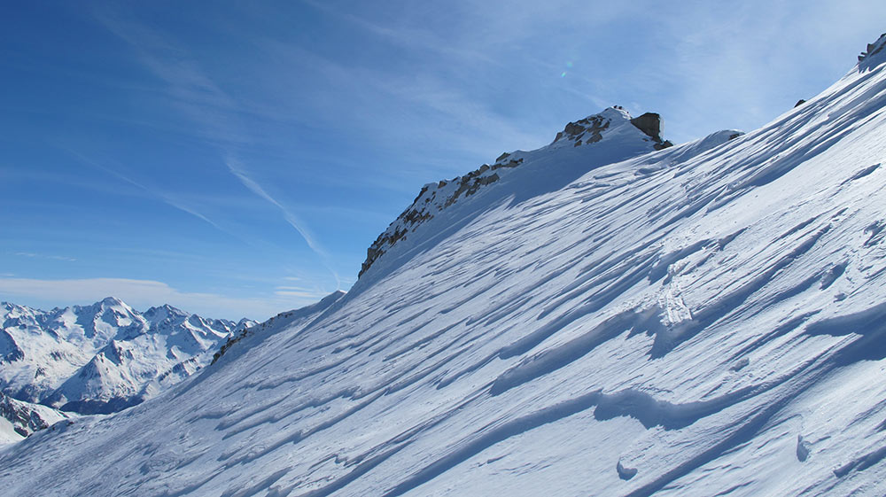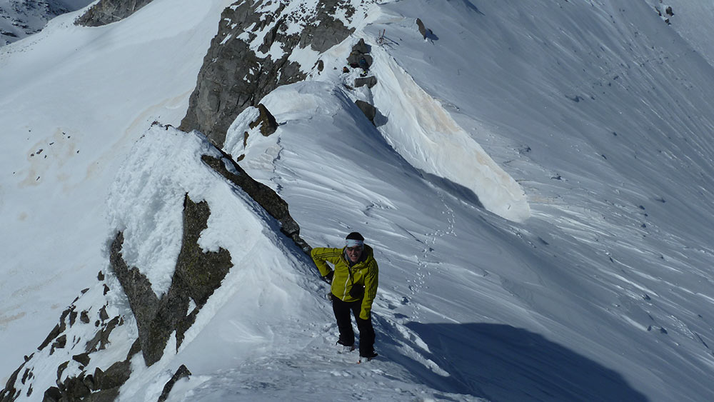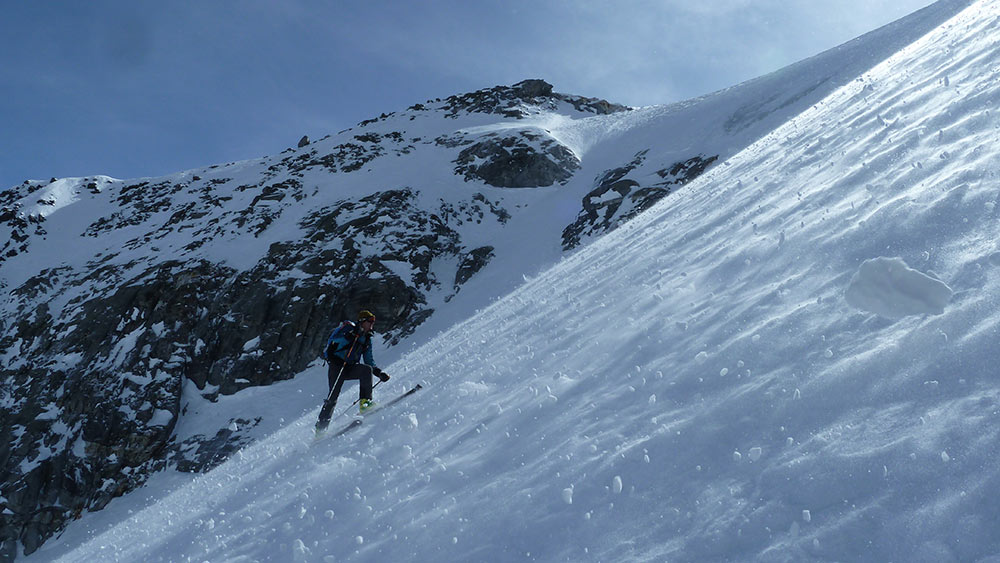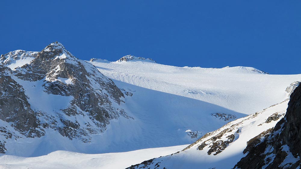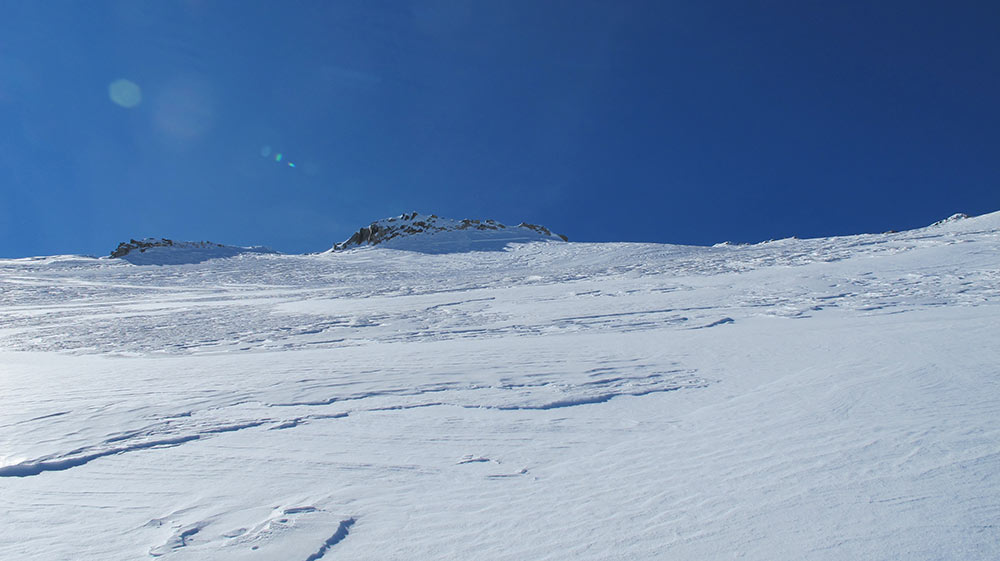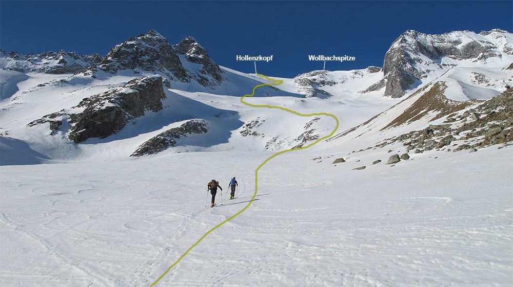 Nach vier, sehr steilen Hängen kommt man auf einen langgezogenen Rücken, bis hier teilen sich Wollbachspitze und Hollenzkopf die Aufstiegsroute. Zum Hollenzkopf steigt man scharf nach links zu einem markanten Schneegipfel.