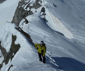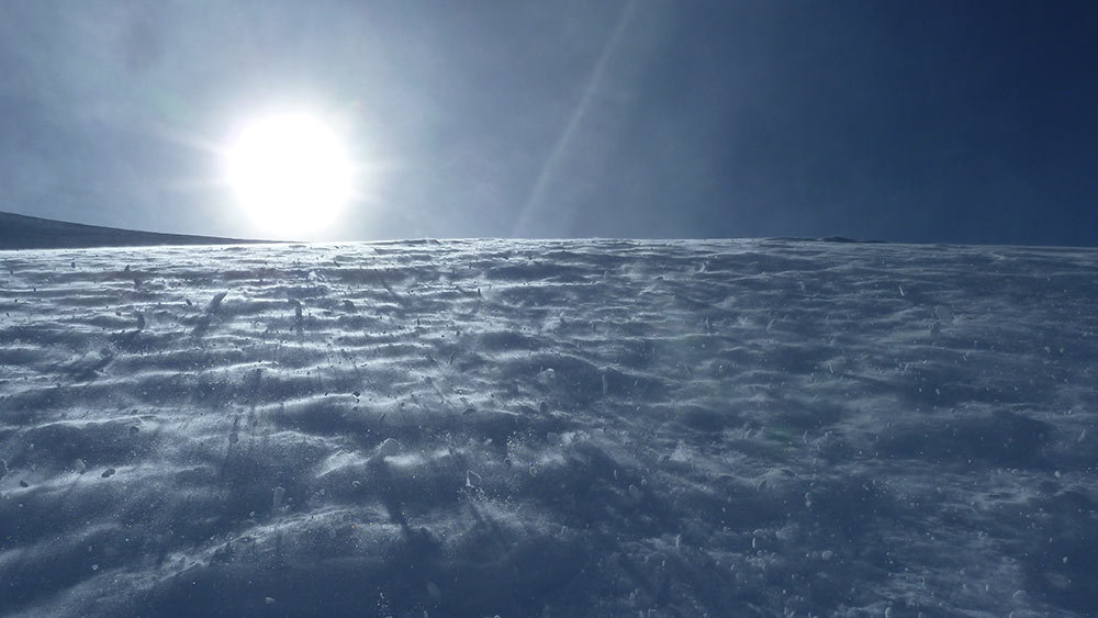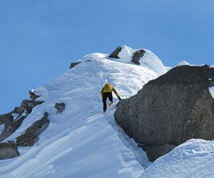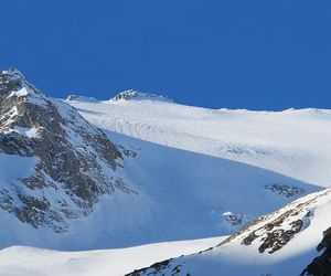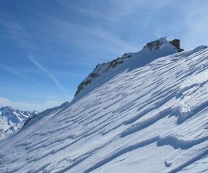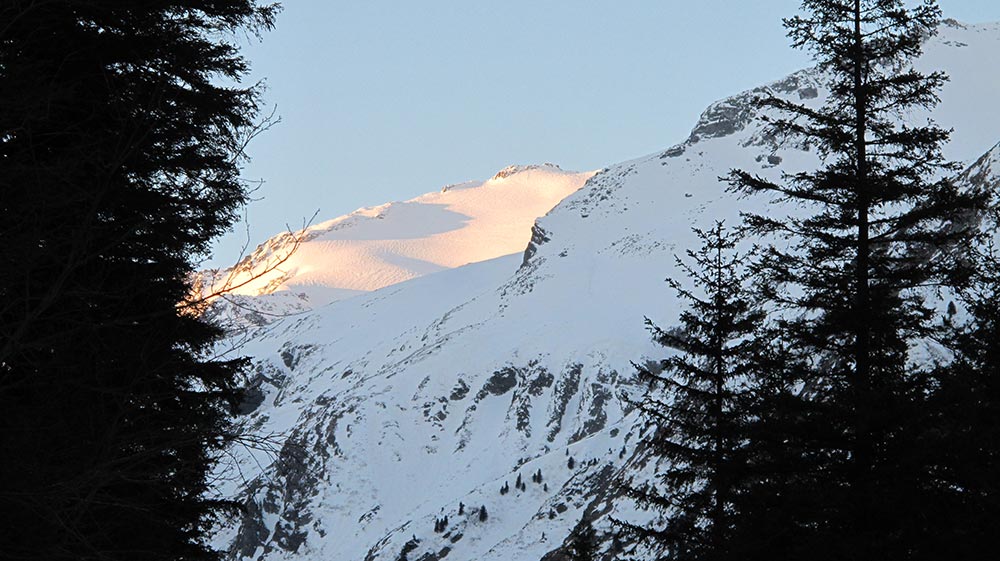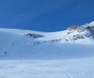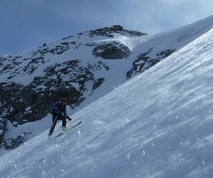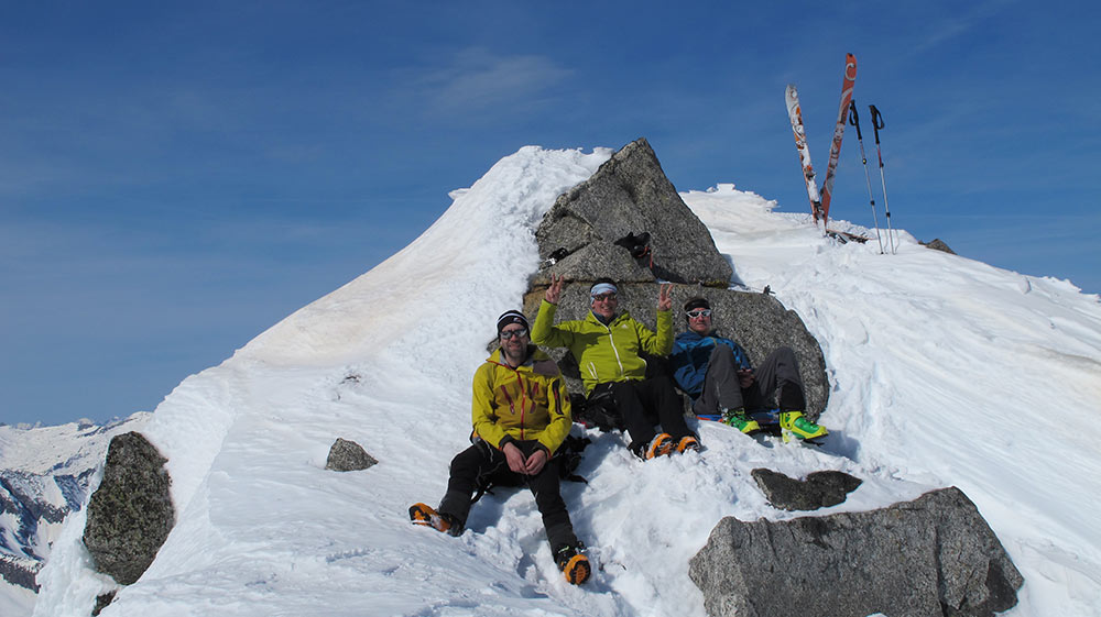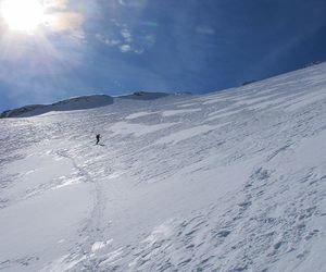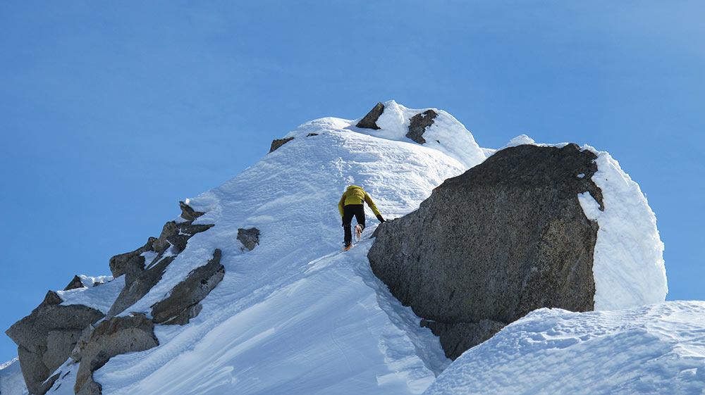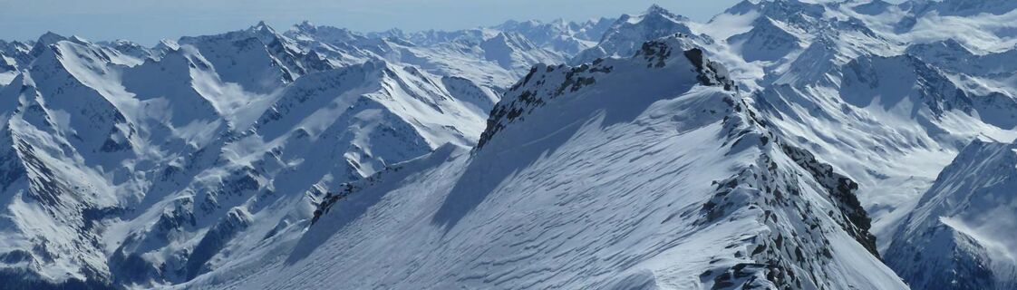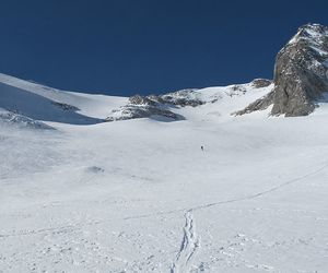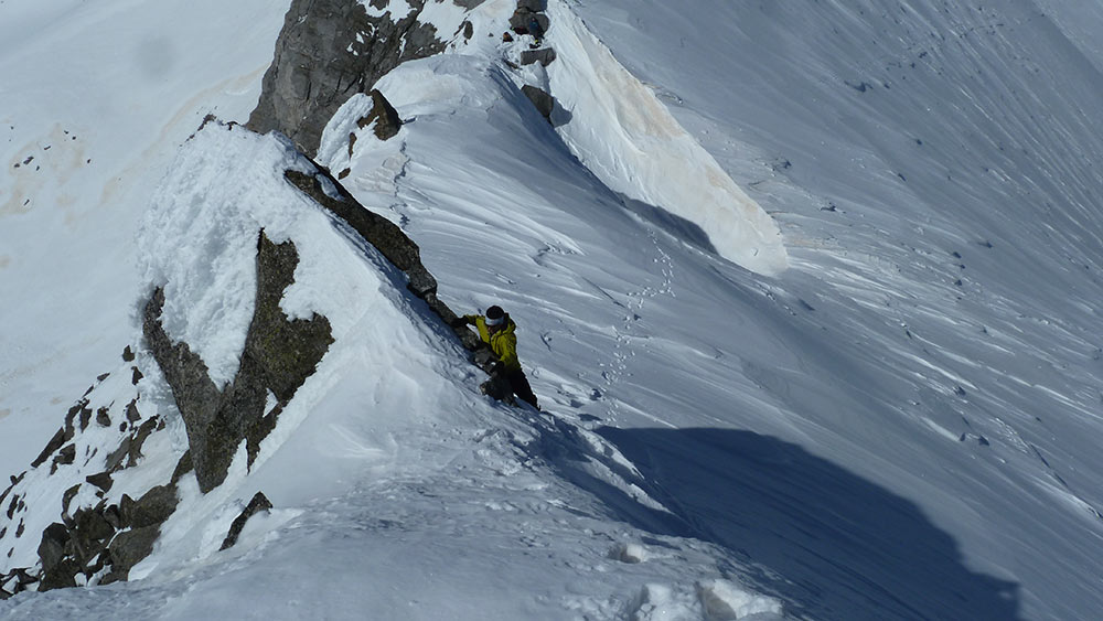 Nach vier, sehr steilen Hängen kommt man auf einen langgezogenen Rücken, bis hier teilen sich Wollbachspitze und Hollenzkopf die Aufstiegsroute. Zum Hollenzkopf steigt man scharf nach links zu einem markanten Schneegipfel.