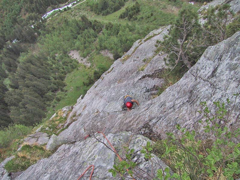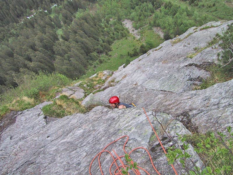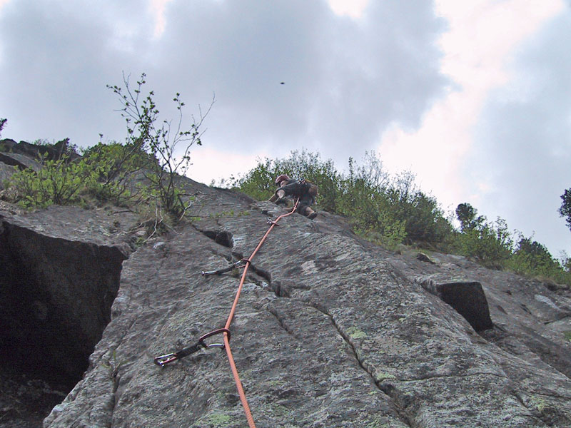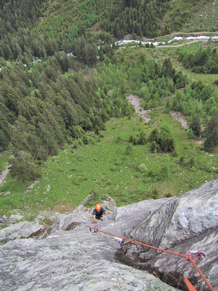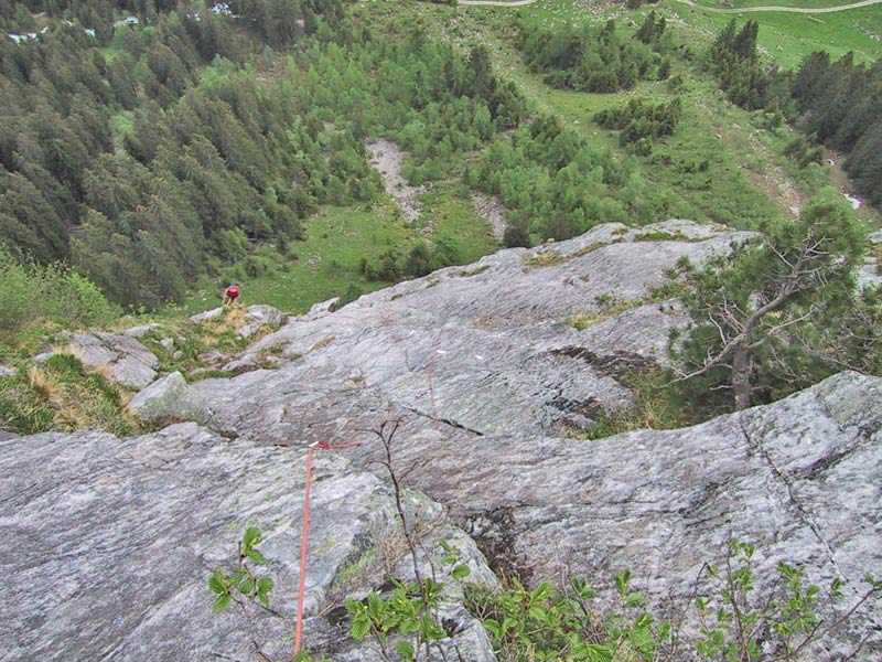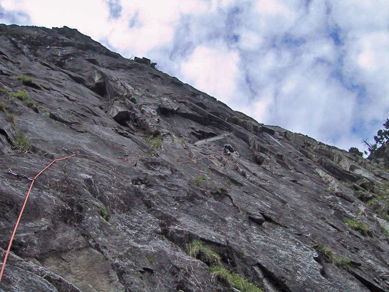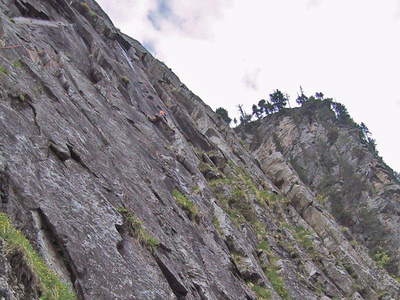 Meist Platten und Wandkletterei, es finden sich auch einige Verschneidungen und kleine Dächer in der Route. Sehr gut mit Borhacken versichert. Führ jeden Genusskletterer ein heisser Tipp.