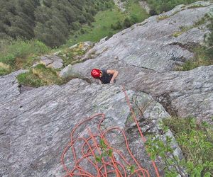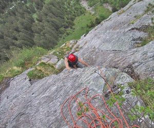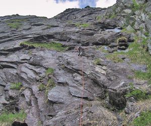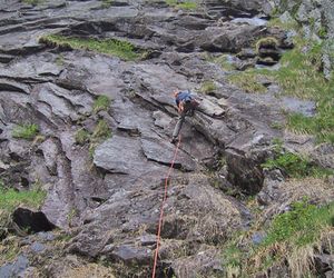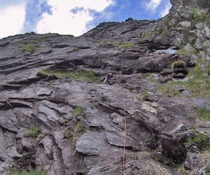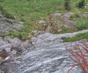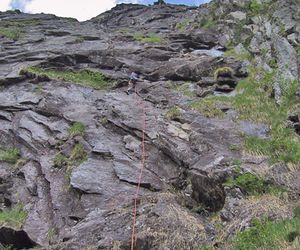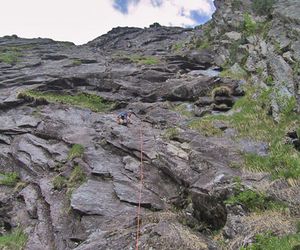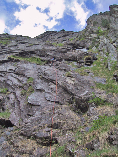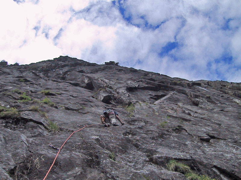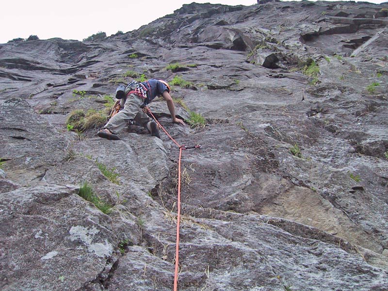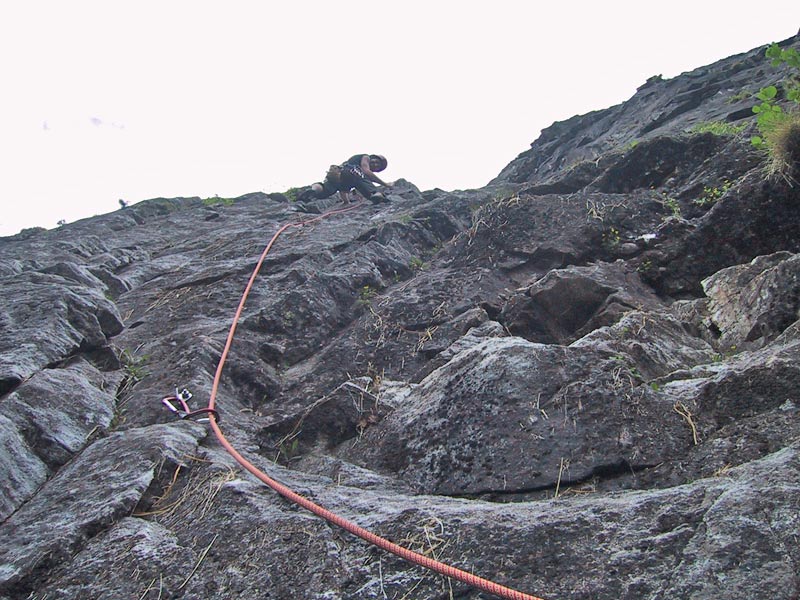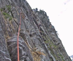 In der dritten Seillänge nach rechts klettern, klettert man nach links befindet man sich in der Tour Hammer und Sichel (VII)