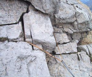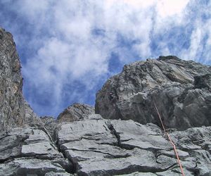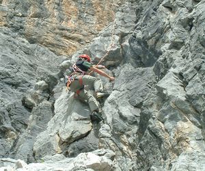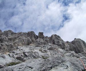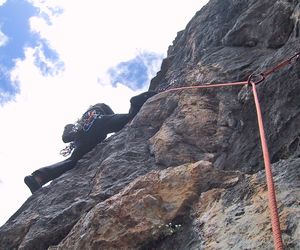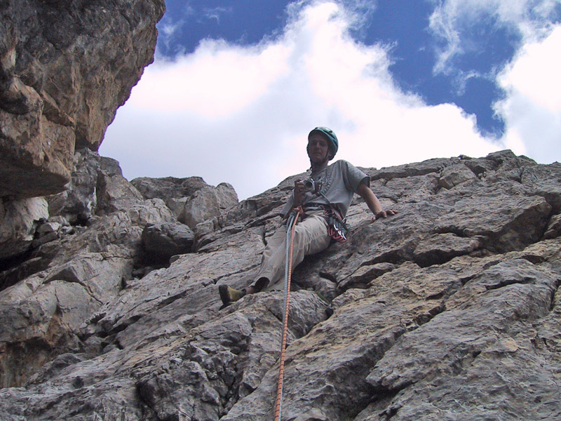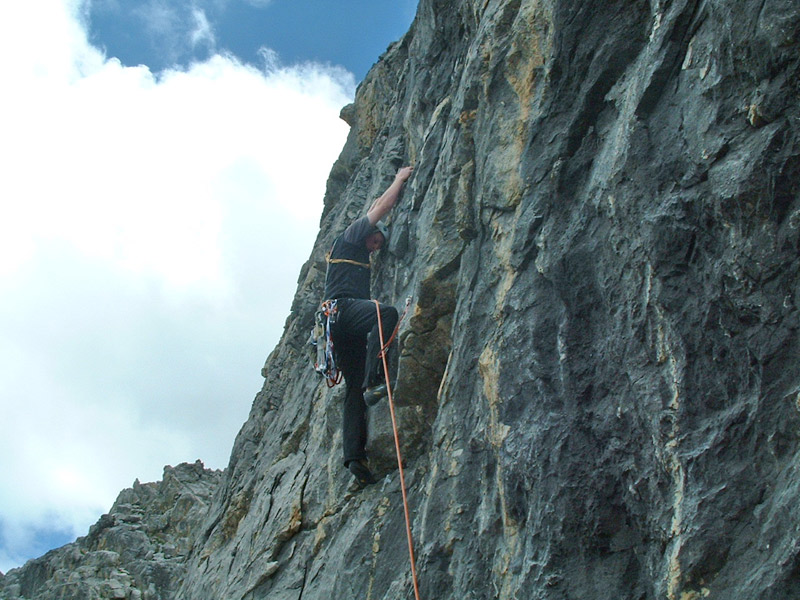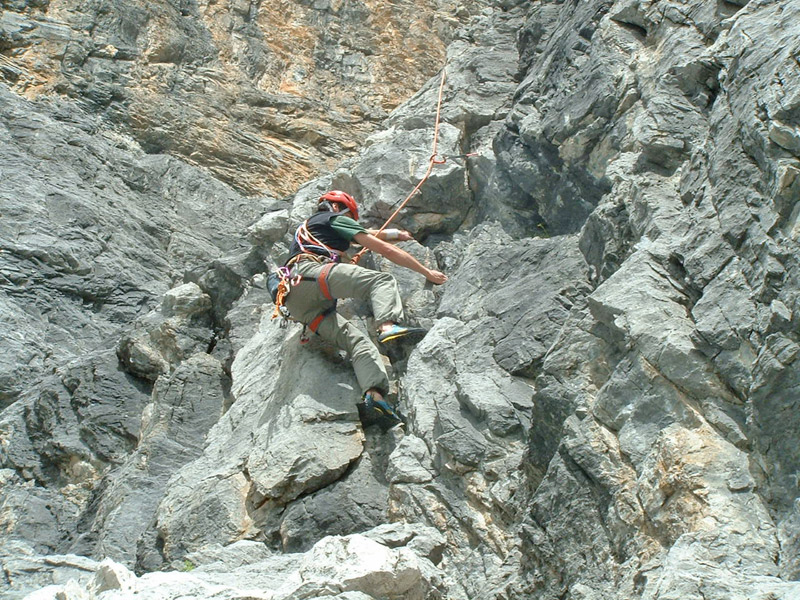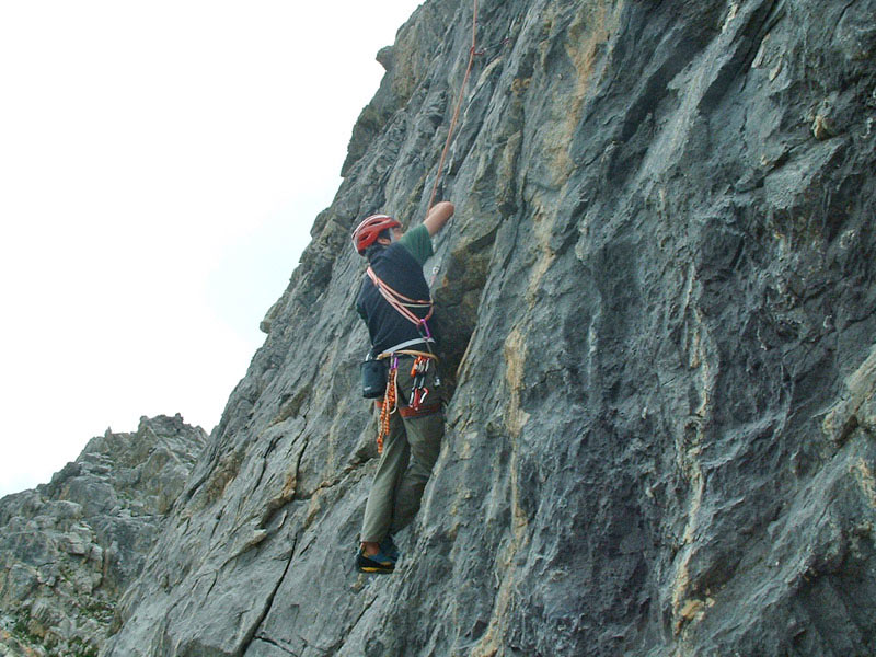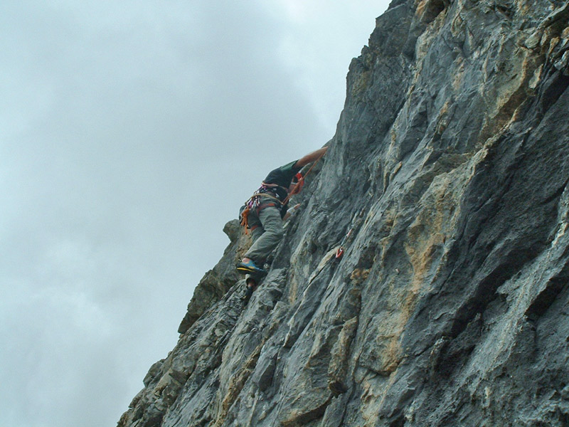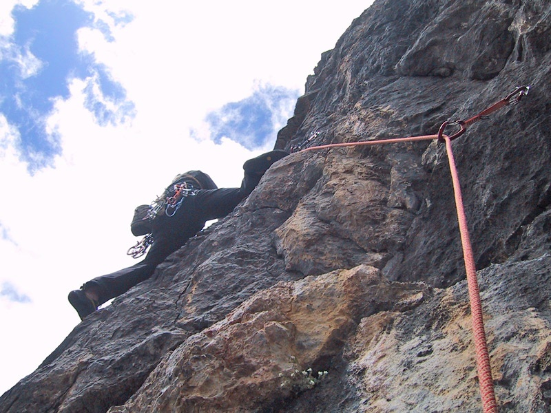 Es befinden sich einige Touren in der Wand, wir haben die Route direkt rechts neben der markanten Schlucht in der Wandmitte gewählt. Angeblich wurde die Route letztes Jahr saniert und mit Borhaken versichert, wir haben aber in den unteren Längen nur wenige Bohrhaken gefunden.