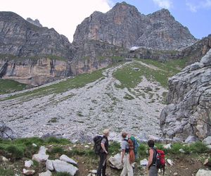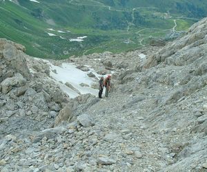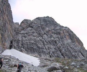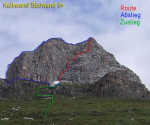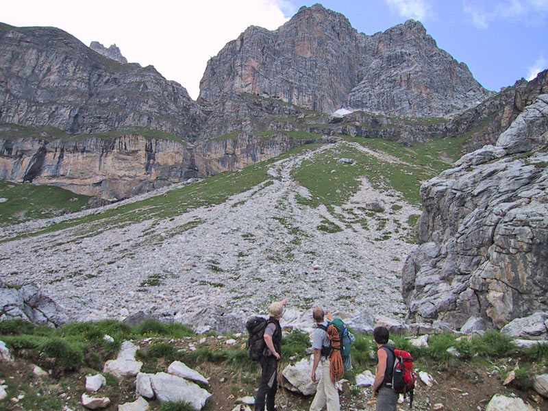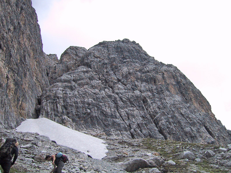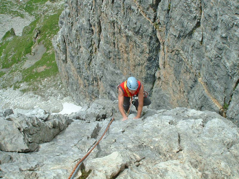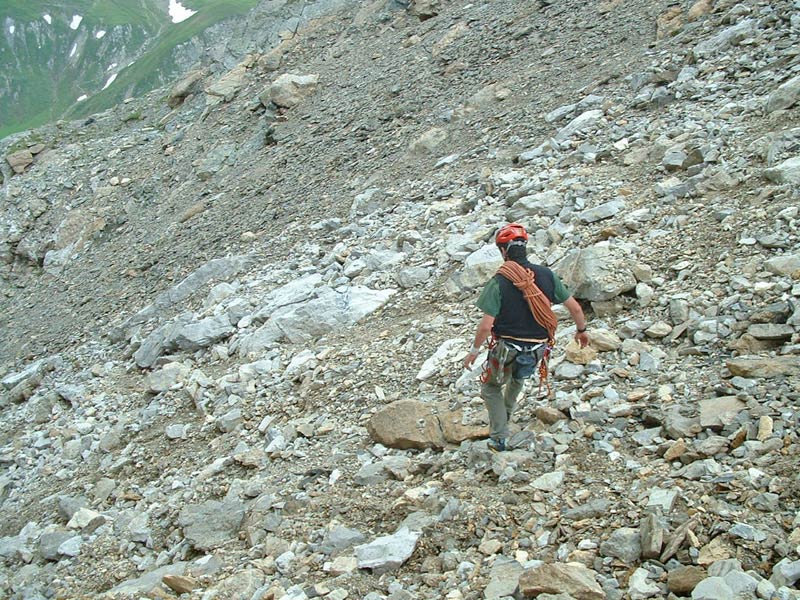 Ist man am Wandfuss angekommen muss noch eine Steile Schotterrinne abgestiegen werden und dann über einen kleine Steig direkt am Wandfuss gequert werden um wieder zum Einstieg zu kommen falls man dort seinen Rucksack deponiert hat.
