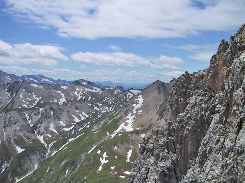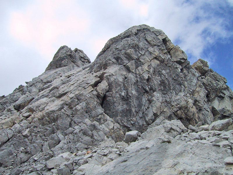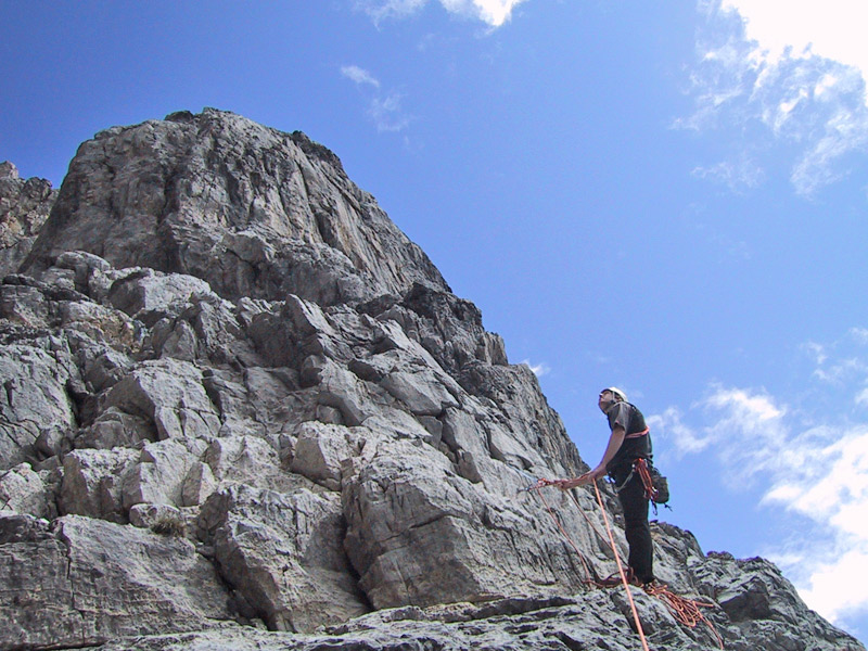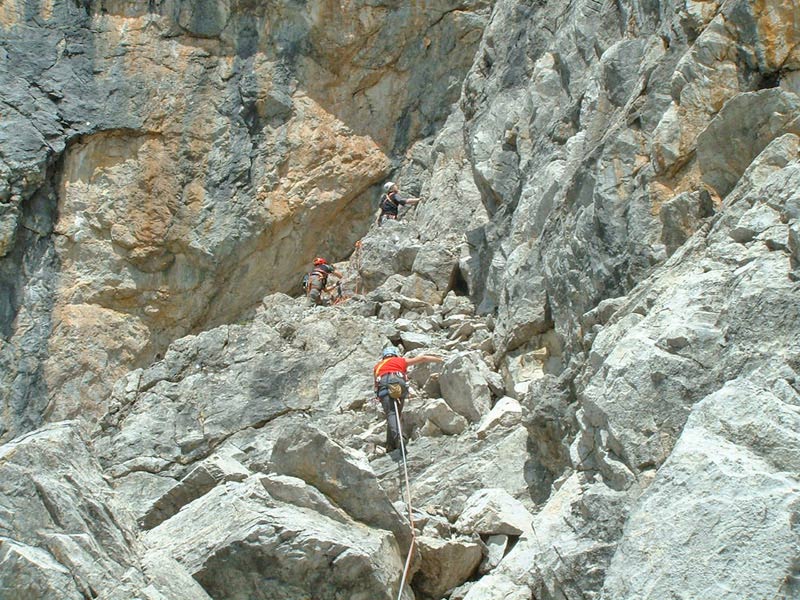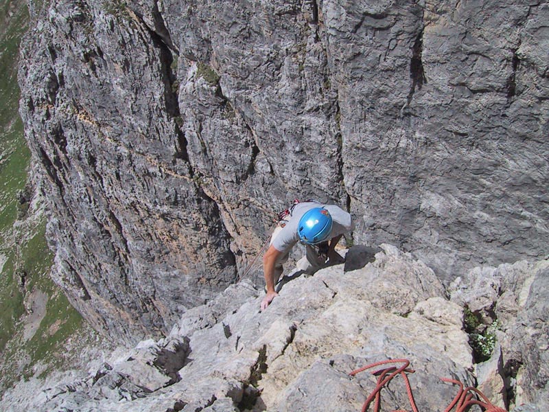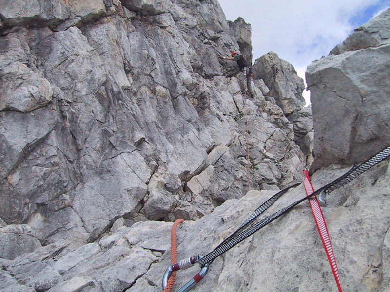 Er folgt direkt dem ausgesetztem West Grad, meist abkletterbar im III Grad ( bei Trittsicherheit meist Seilfrei), am Ende muss noch eine Seillänge ca 30 Meter abgeseilt werden. Wegfindung ist einfach da man nur den Grossen gebohrten Rundhaken mit gelber Markierung folgen muss.