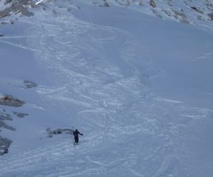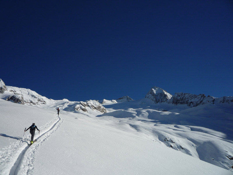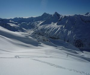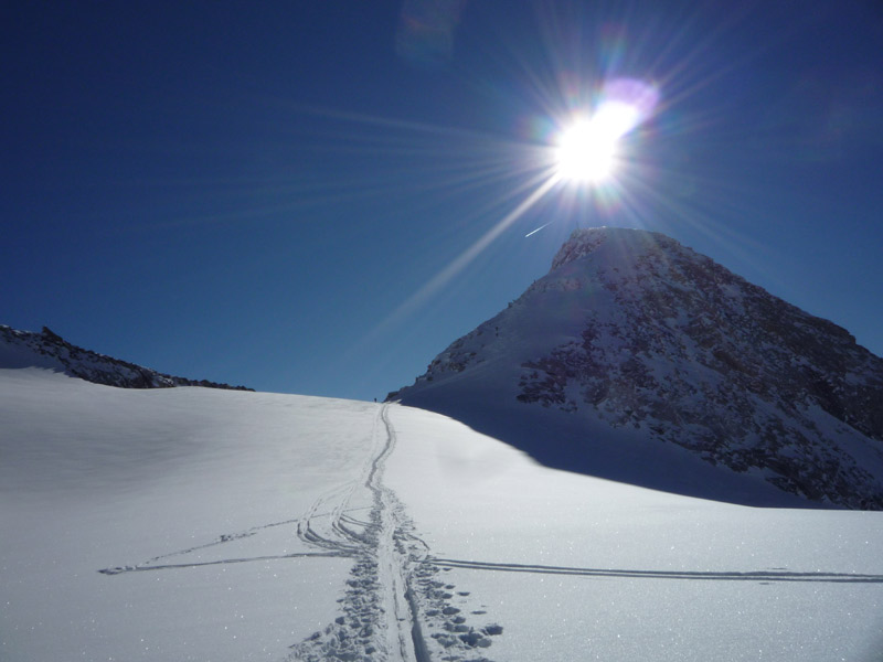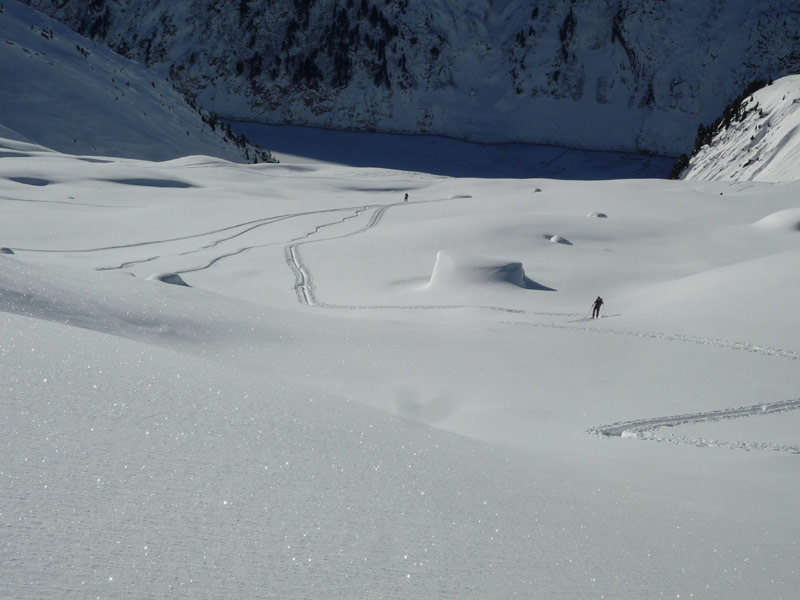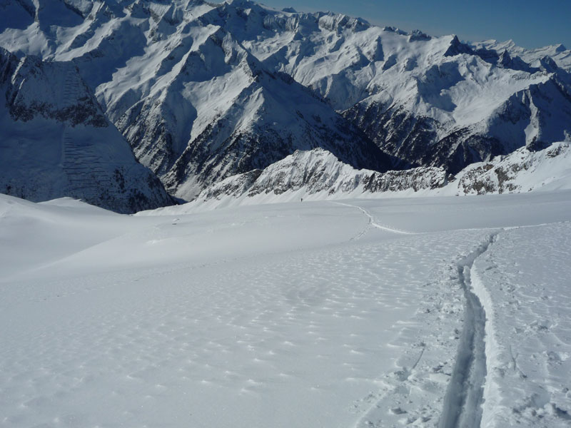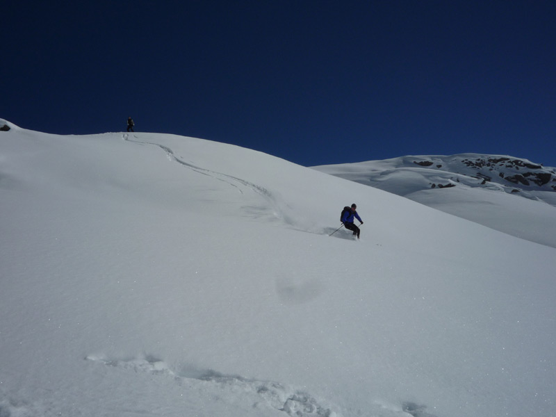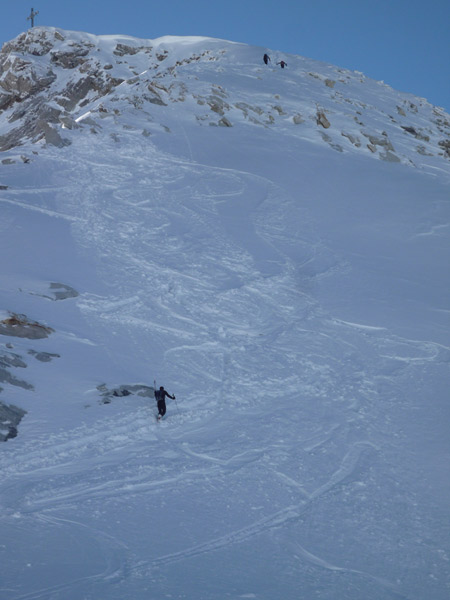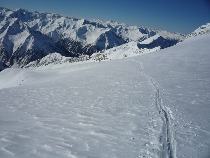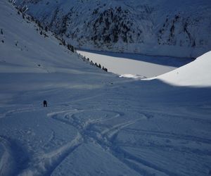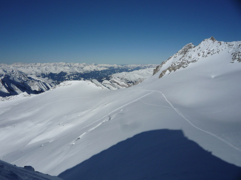 Über den Aufstiegsweg abfahren oder direkt von der Scharte in einen steilen (ACHTUNG: Spalten!), langen Hang zurück in das Zillerkar.