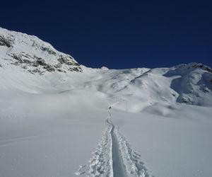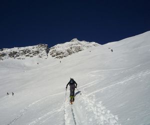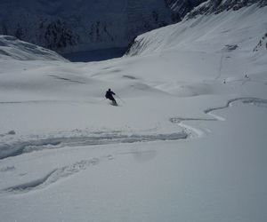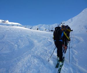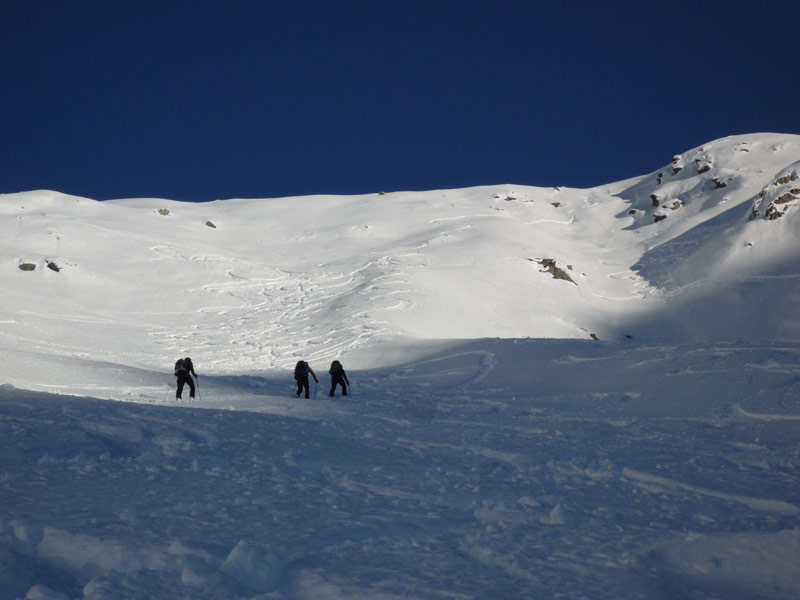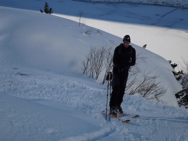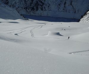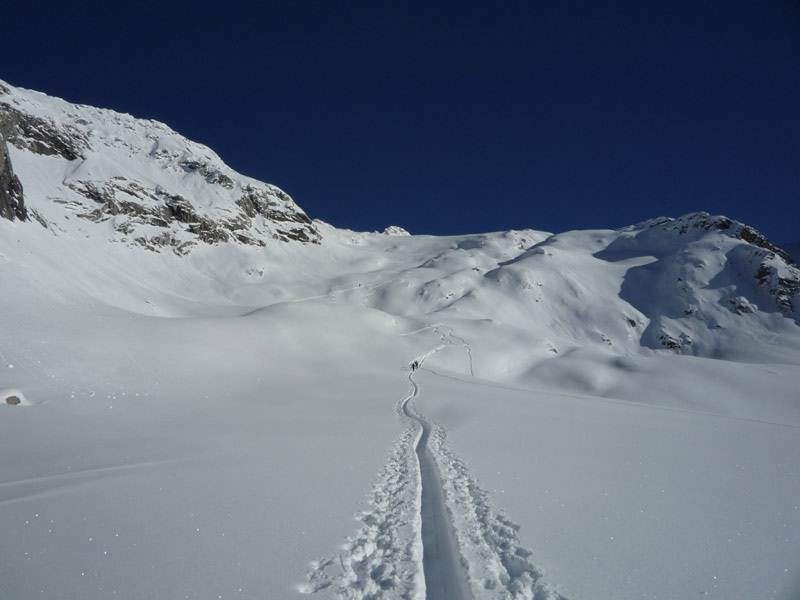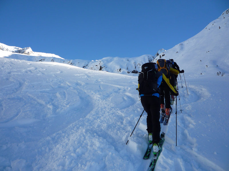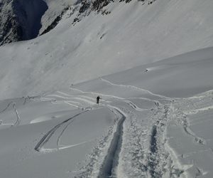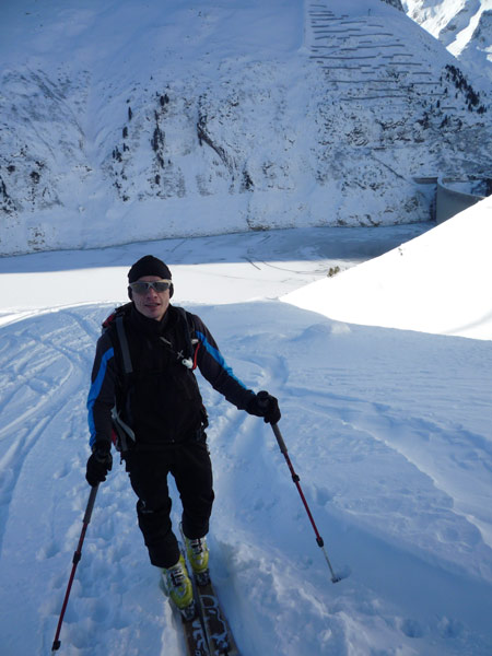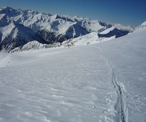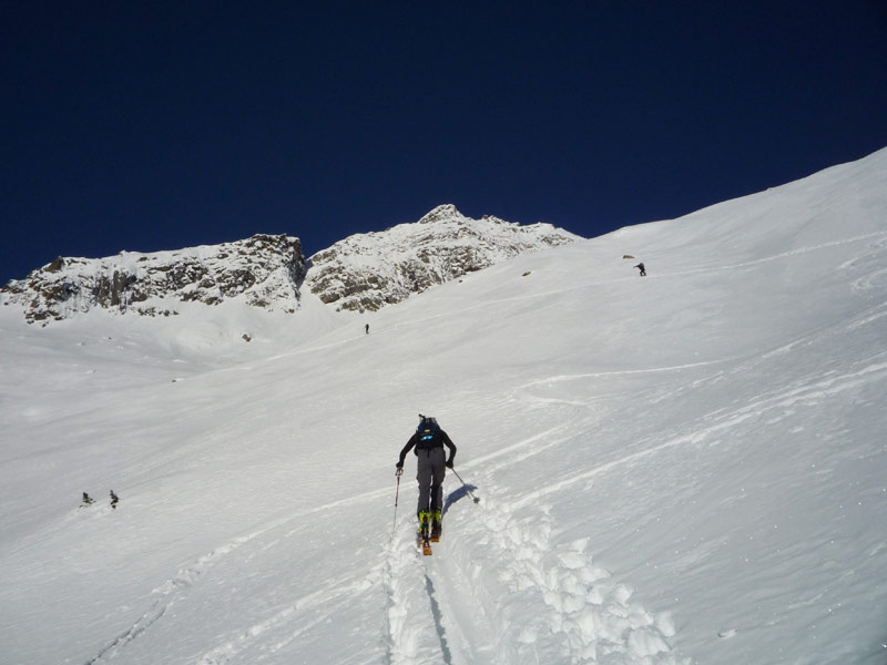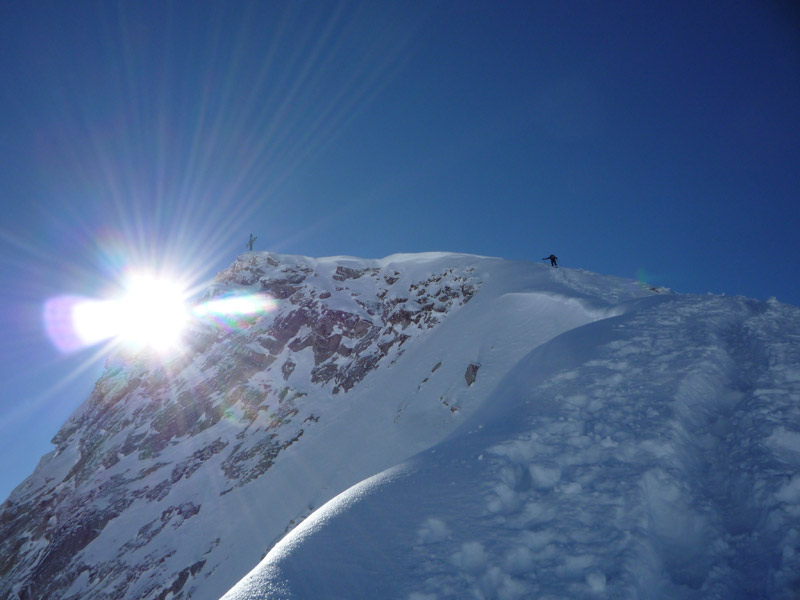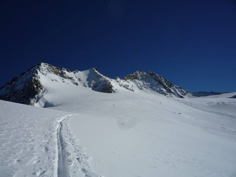 Über den Aufstiegsweg abfahren oder direkt von der Scharte in einen steilen (ACHTUNG: Spalten!), langen Hang zurück in das Zillerkar.