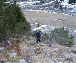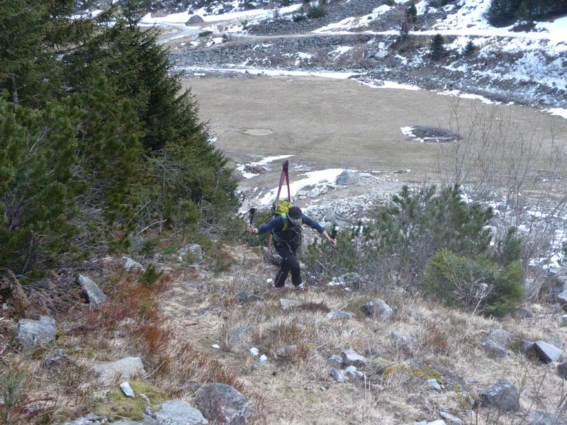 Anschliessend linkshaltend über einen langen Latschenhang vorbei an den steilen Wänden der Kainzenkarfälle bis man das Plateau erreicht.