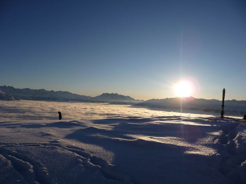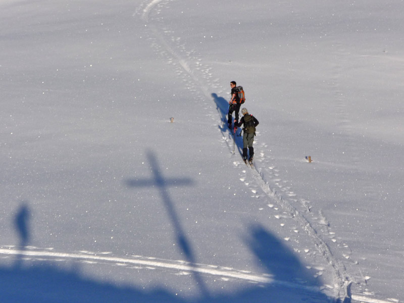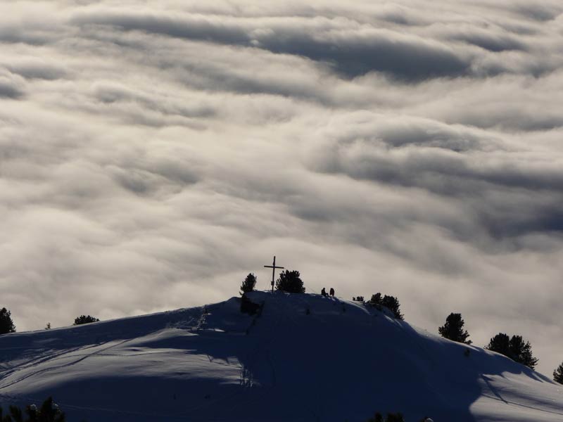 Nach ca 50 hm kommt man wieder aus dem Waldstück und steigt nun einfach gerade über schöne Hänge auf bis man das Kreuz des Kapaunsjoch 1978m bereits sehen kann. Sehr schönes Gipfelkreuz.