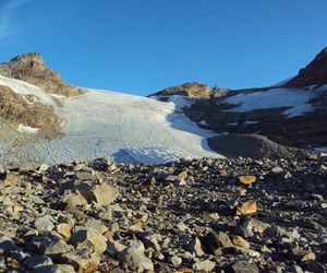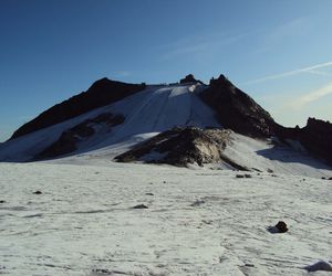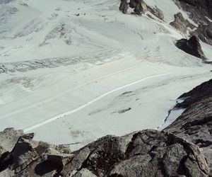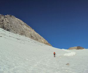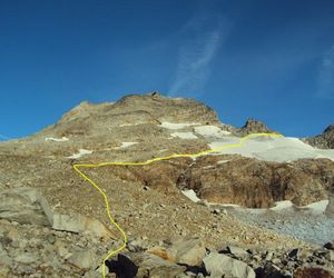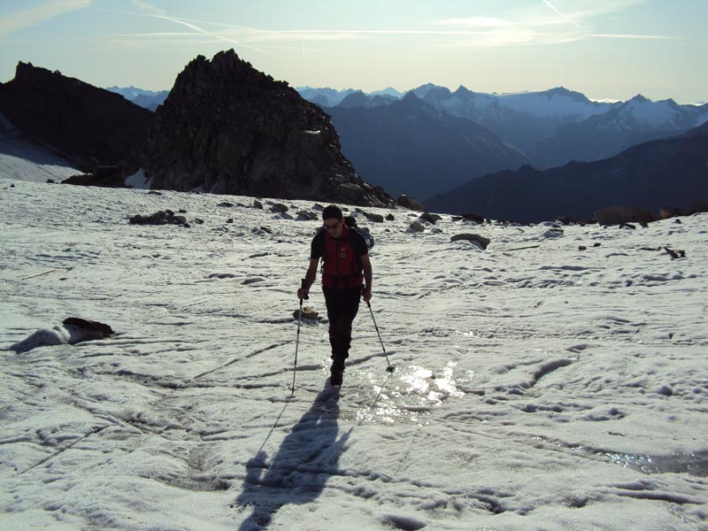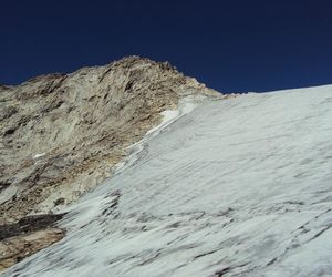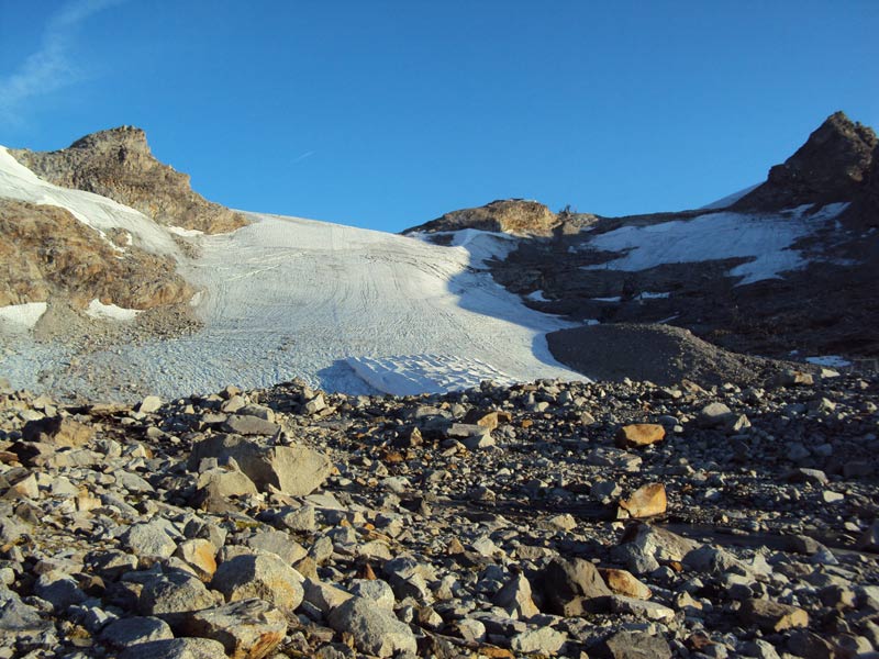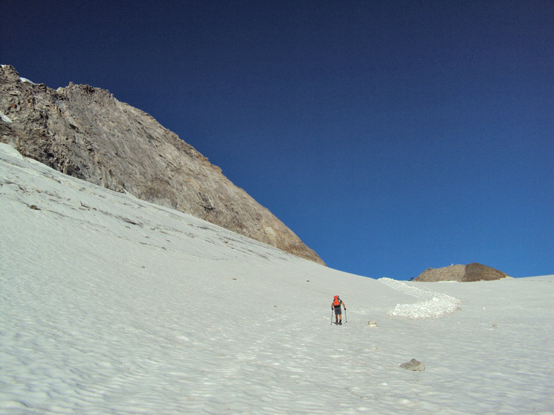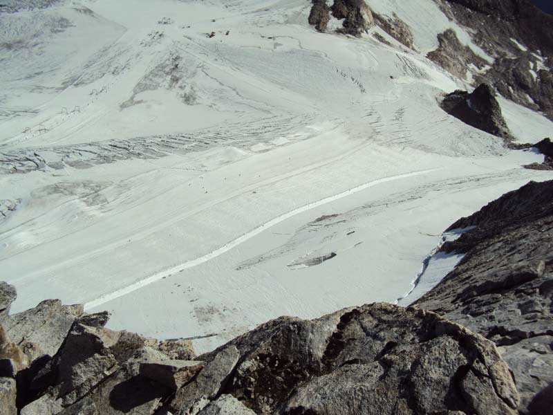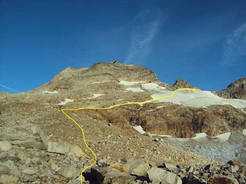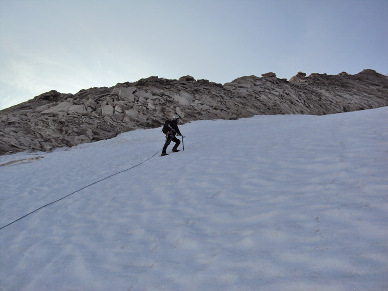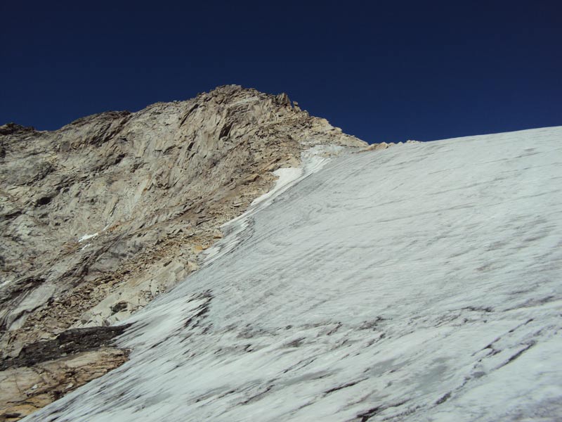 Nordgrat (Wildlahnergrat) II+ Der Einstieg auf den Nordgrat befindet sich nicht direkt an der Scharte sonder ca. 80 Meter weiter oben, es muss ein ca. 40° steiler Firn/Eishang aufgestiegen werden. Dieser wird in einem Bogen durch das Firnfeld erreicht, nicht direkt am Fels aufsteigen (Spalten!).