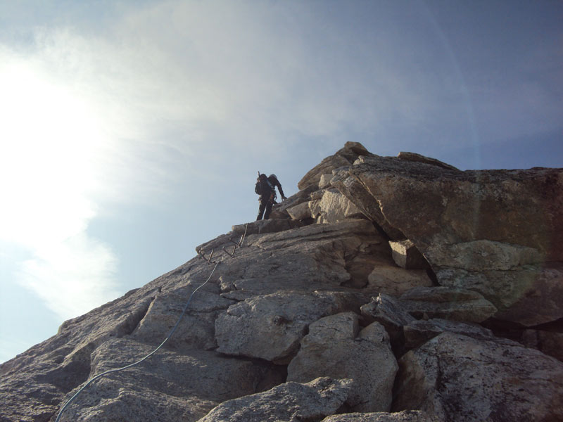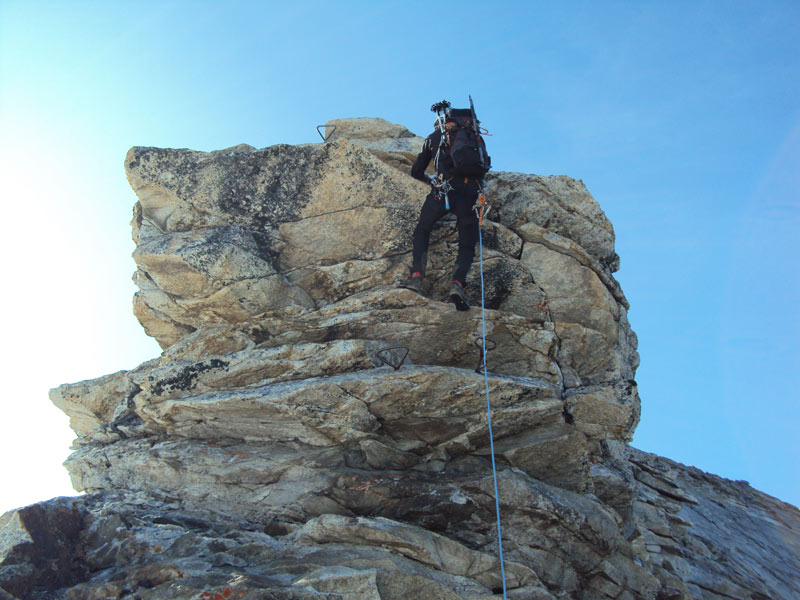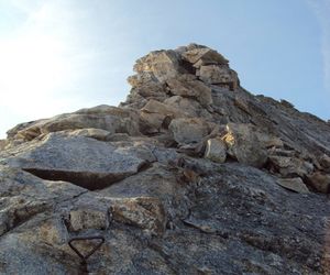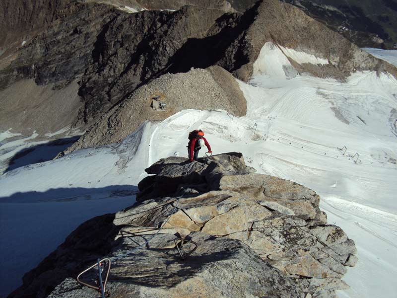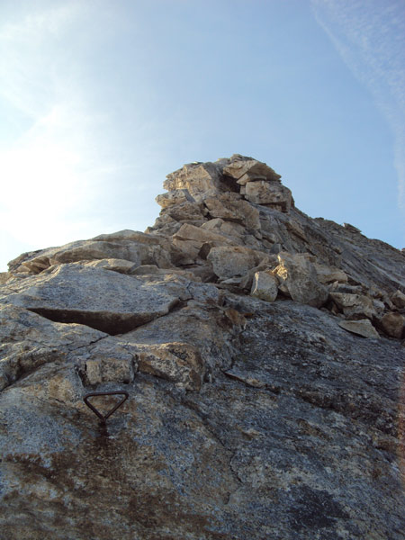 Schöne Gratkletterei, die Schlüsselstelle am Überhang ist einfach zu überklettern da viele Eisenkrampen eingebohrt sind, mehr Vorsicht ist auf den abgeschmierten plattigen Stellen angebracht. Bei Vereisung anspruchsvoll.