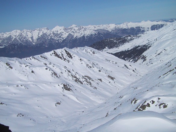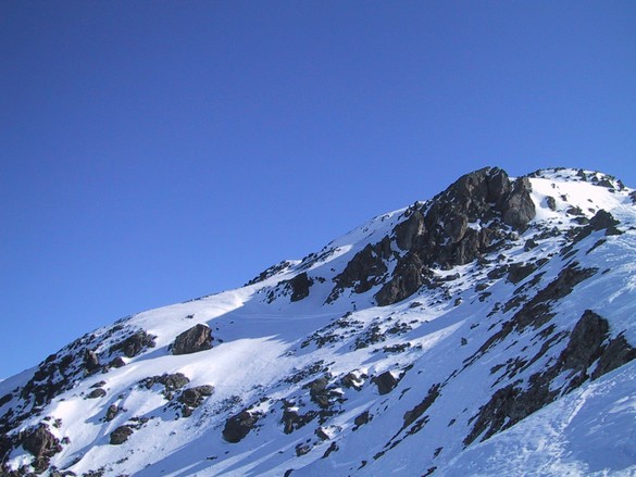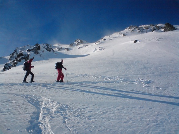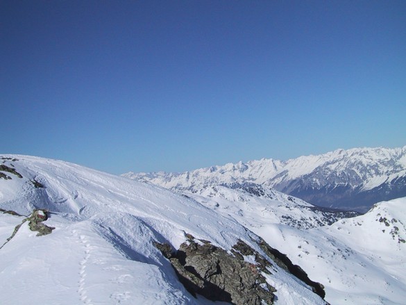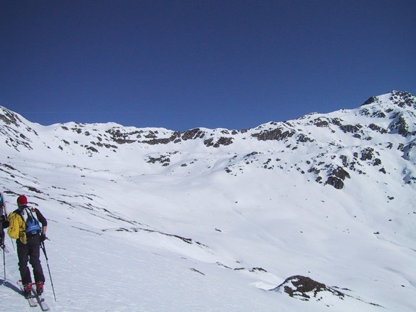 Nach einer kurzen Abfahrt von ca. 20 Metern kommt man auf den langgezogenen Grat der hinüber zum Rastkogel führt, hat man den Grat hinter sich, kommt die Schlüsselstelle der gesamten Tour, man hat eine steile Flanke die meist durch den starken Wind wenig Schnee aufweist und oft eisig ist, diese muss gequert werden um nach einem kurzen, flachen Stück zum steilen Gipfelhang zu gelangen.