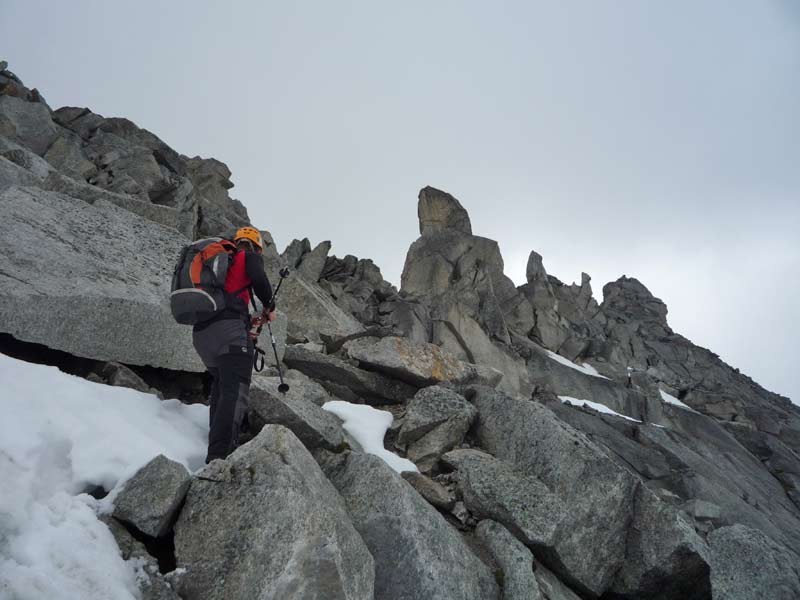 Weiter gehts direkt in der Scharte immer dem Stahlseil nach einmal links einmal rechts. Das Stahlseil ist in diesem extrem Brüchigen und teilweise vereistem Gelände eine erfreuliche Hilfe.