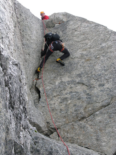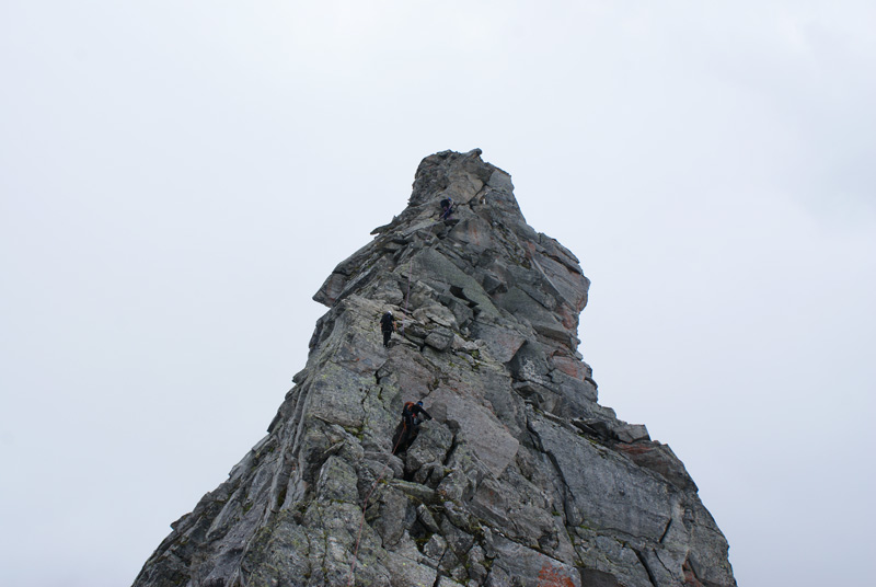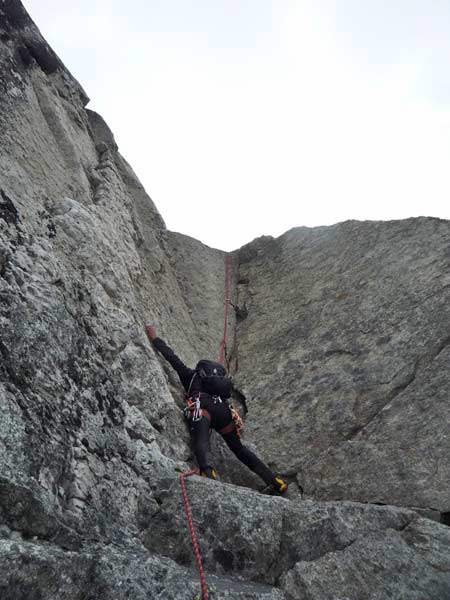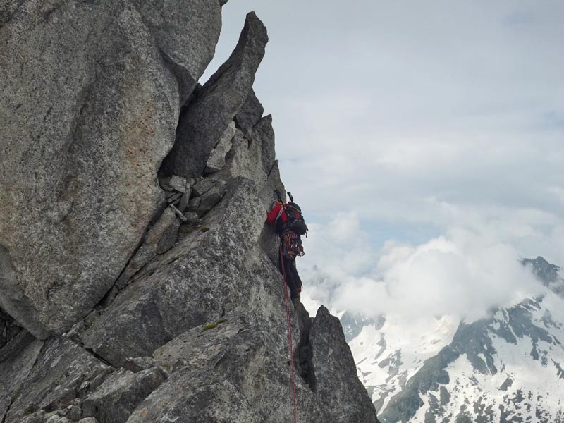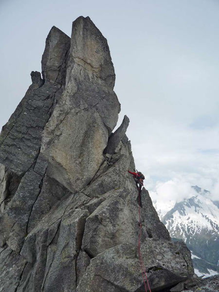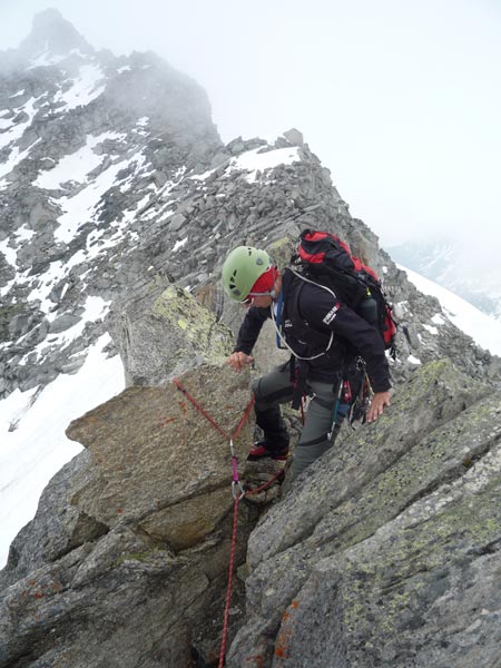 Am ersten großen Turm beginnt die Kletterei. Den Turm umgeht man auf der rechten Seite, nach wenigen Metern befindet man sich auch schon in der Schlüsselseillänge wo eine kurze, steile Wand mit einem gutgriffigen Riss, (IV, 1 Haken) sich ca 6m empor zieht. Es folgen einige sehr ausgesetzte Seillängen direkt über die spitzigen Gratzacken. Angelangt an der grossen Scharte muss man ca 2 Meter abklettern und gelangt über eine kurze Querung zu einer Verschneidung mit fingerbreitem Riss und glatter Platte. Hat man diese Stelle überwunden folgen wunderschöne Seillägen im II und III Grad bis zum Gipfel.