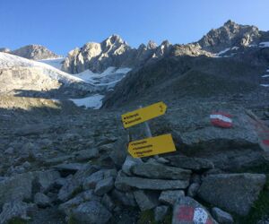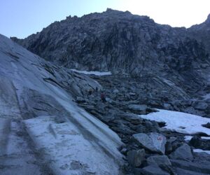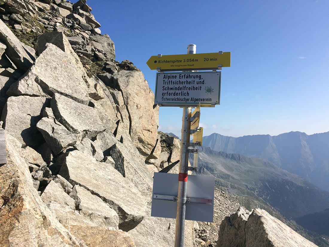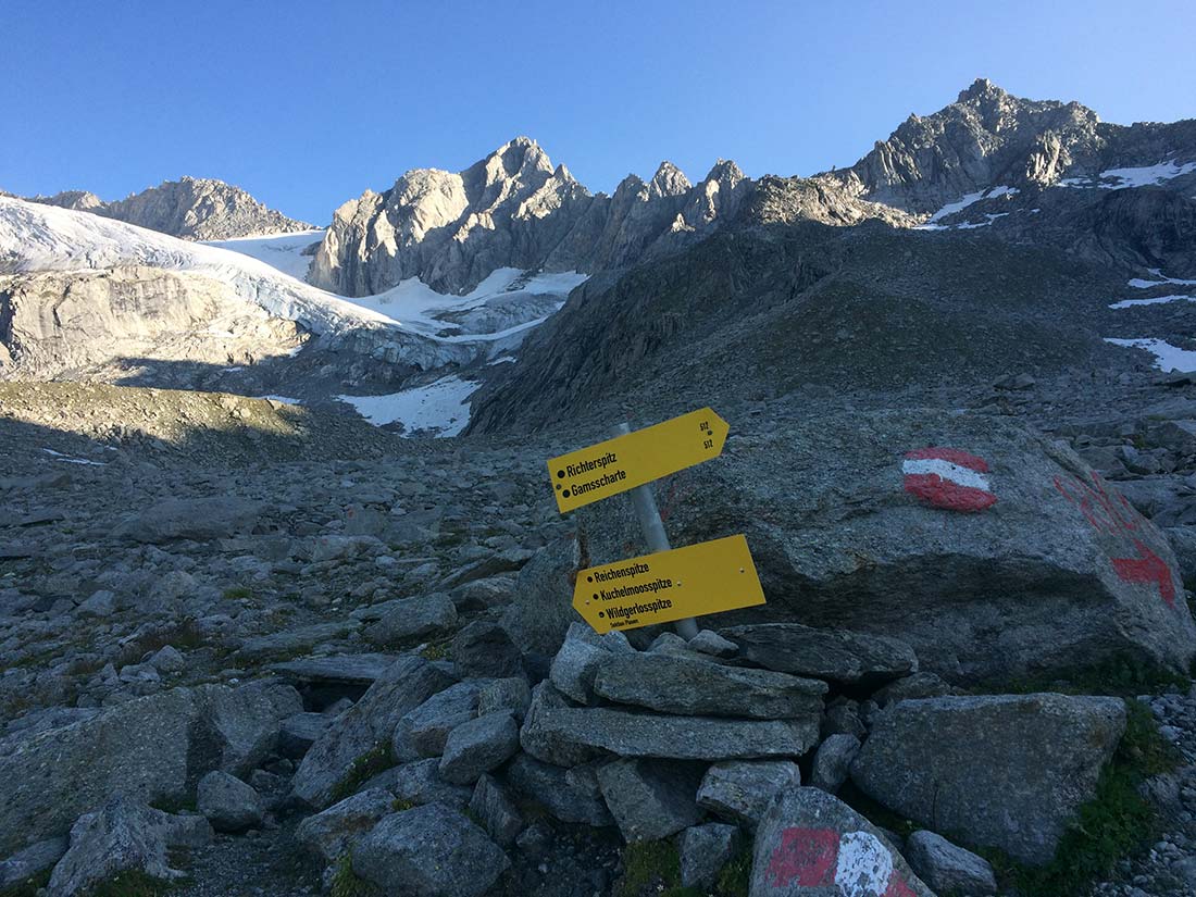 Hier folgt man dem Weg in Richtung Reichenspitze bis zum Wegweiserschild der die Abzweigung zur Richterspitze markiert. Dem Weg folgen bis zum Wandfuss, Einstieg auf ca 2750m (ca 1 Stunde von Hütte)