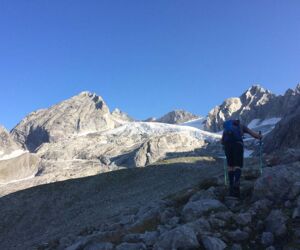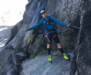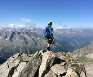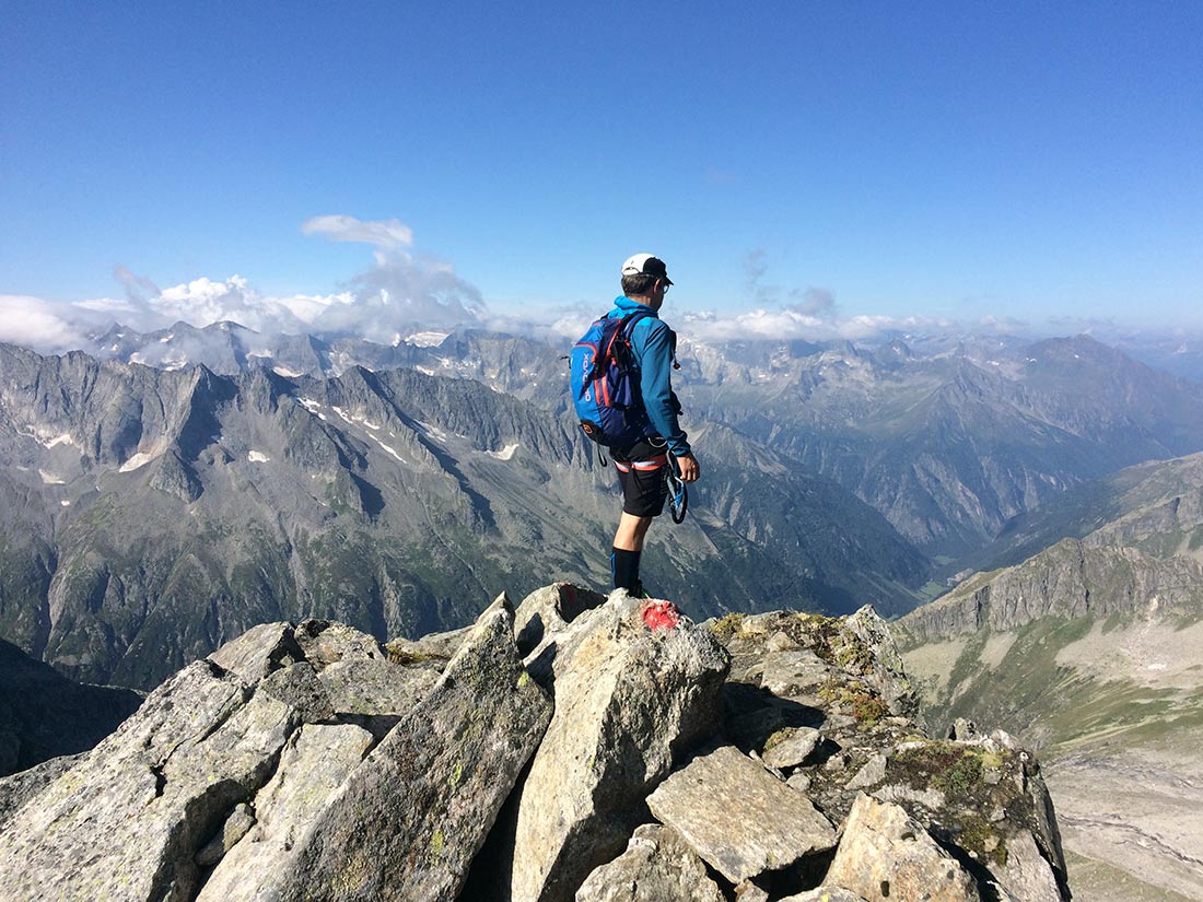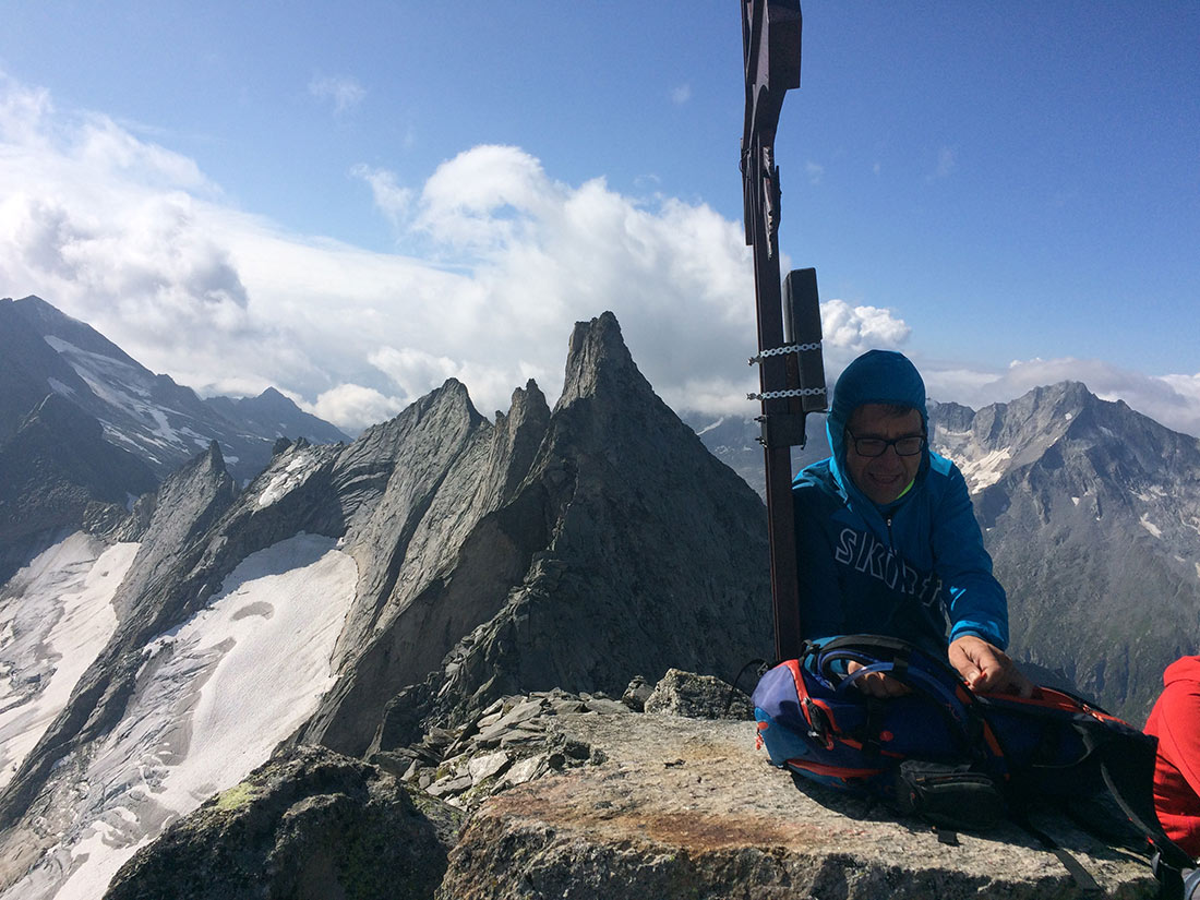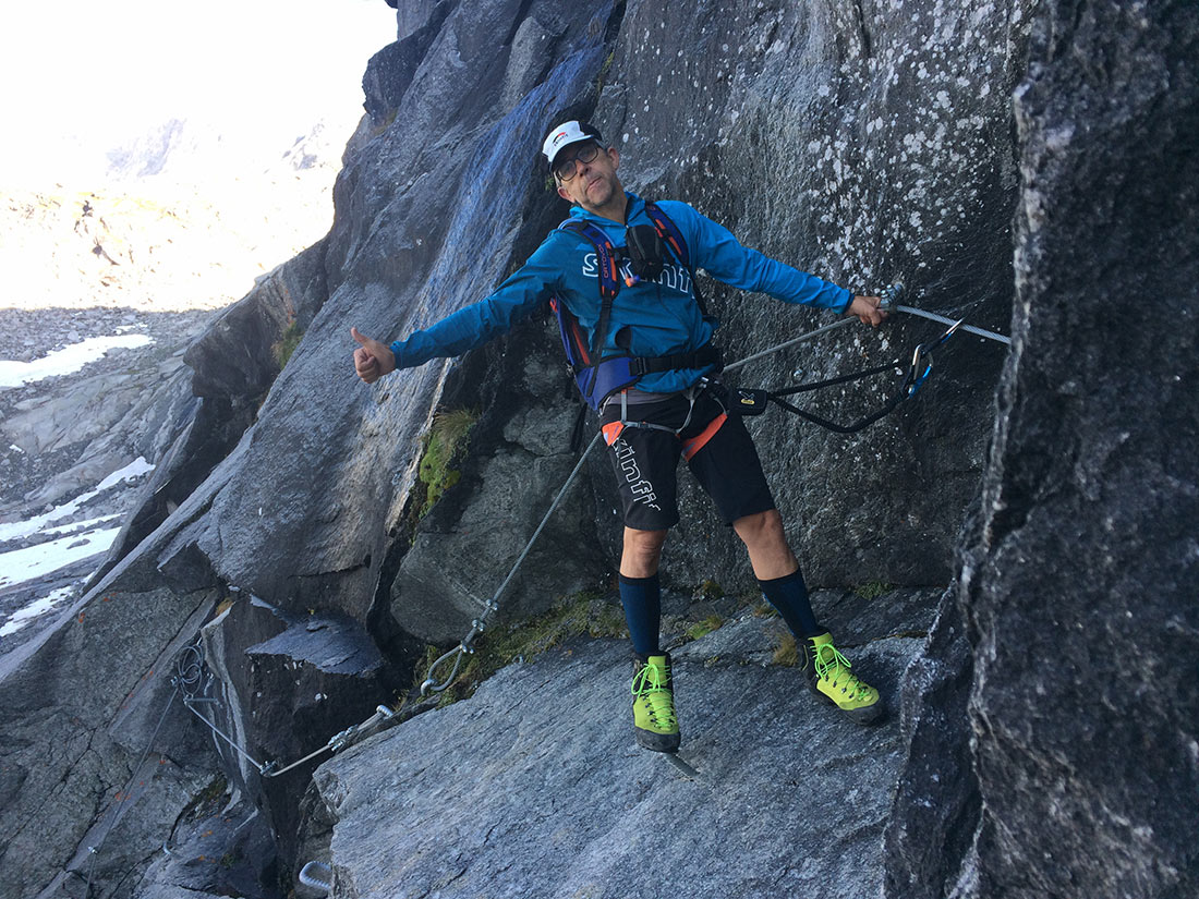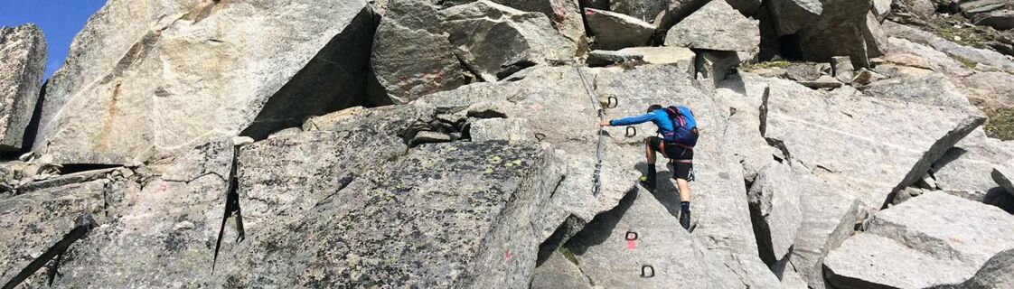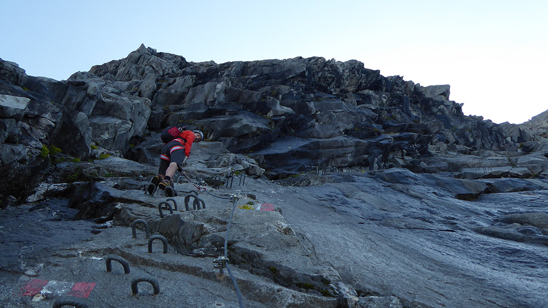 Über den neu errichteten und sehr gut versicherten Klettersteig erst über Wand dann über Schrofengelände bis zur Scharte die der Übergang zur Richterhütte ist. (Meist B Stellen C)